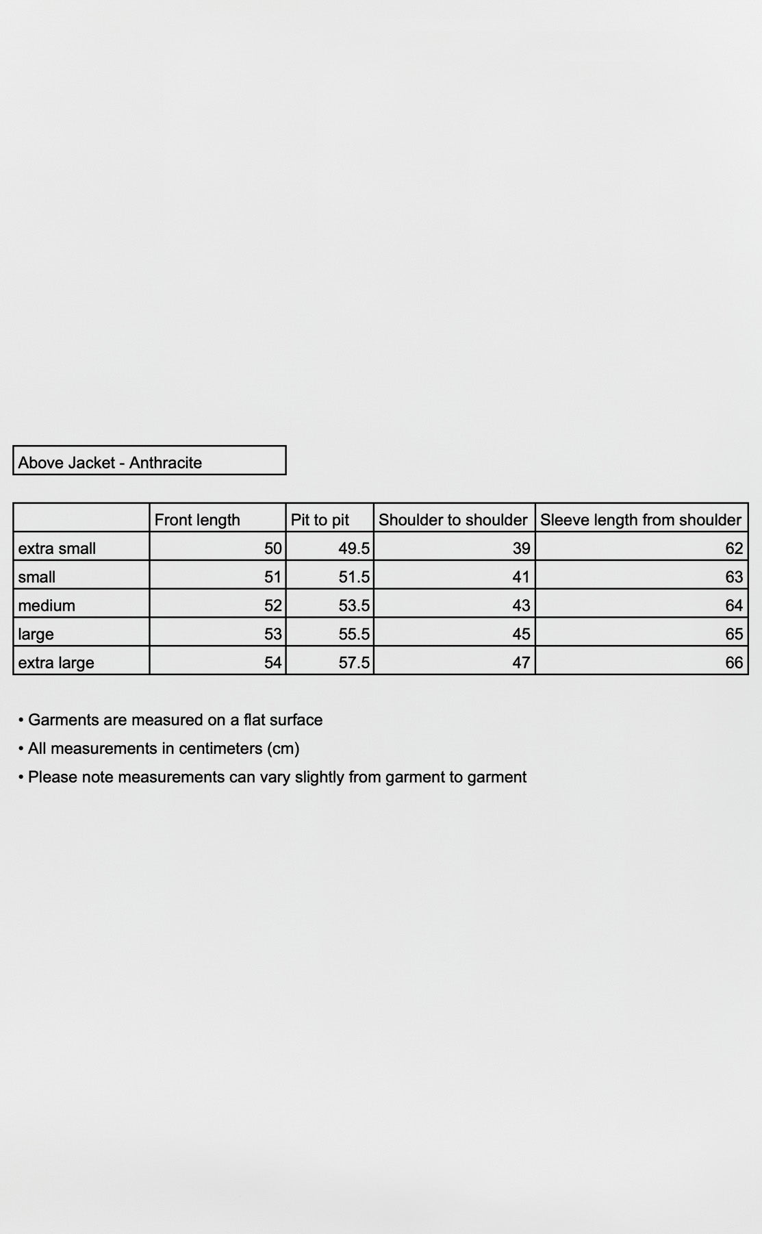 The Above Jacket has a cropped fit with light shoulder construction. Featuring a spread collar, hidden button closure and cutline at front and back. Cut from a fine Italian deadstock wool and mohair blend, with a subtle two-tone appearance in dark grey.