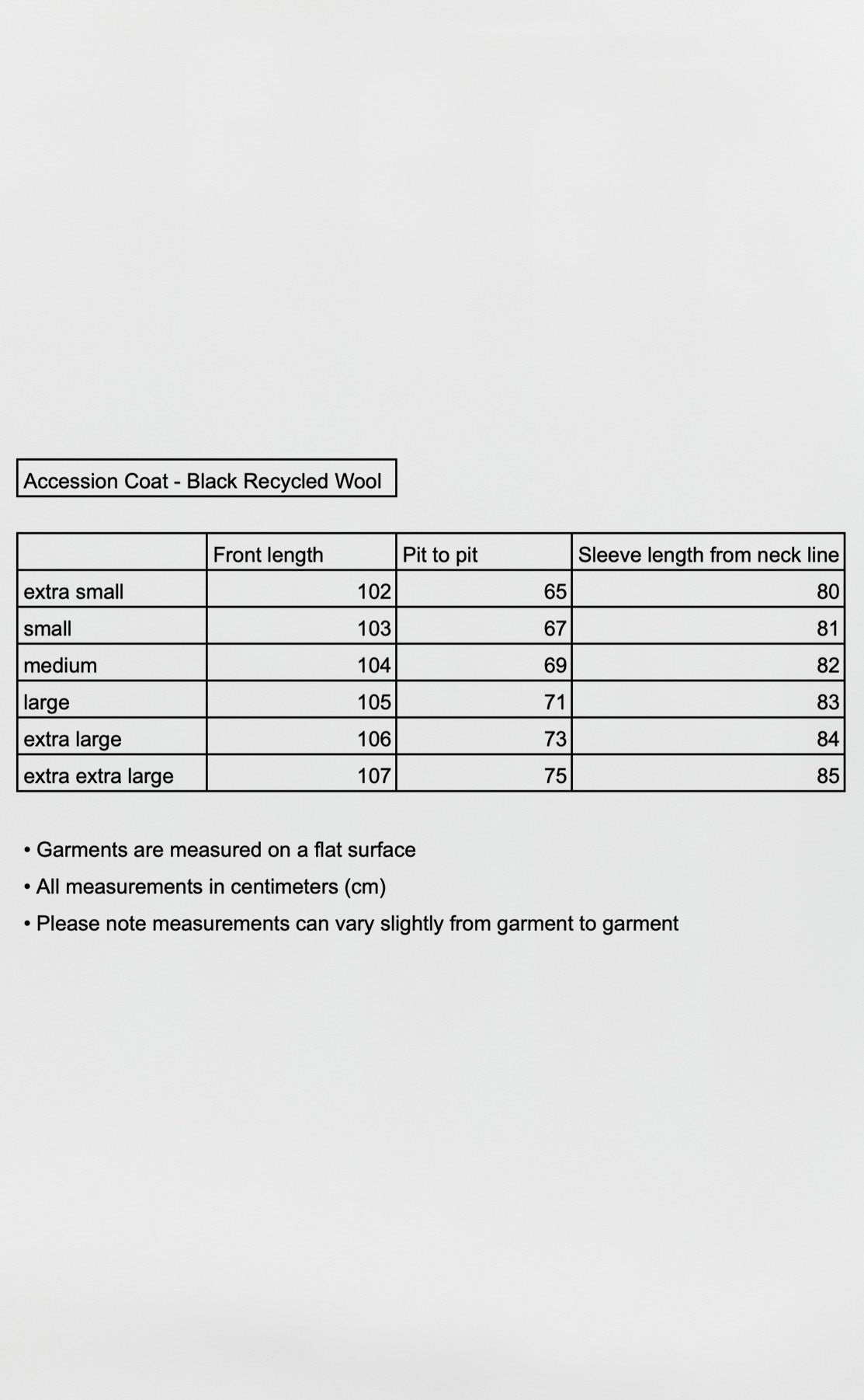 The Accession Coat is knee length with a relaxed fit and raglan sleeves. Featuring hidden button closure, removable storm collar tab and side pockets. Cut from a post-consumer recycled melton wool in black.