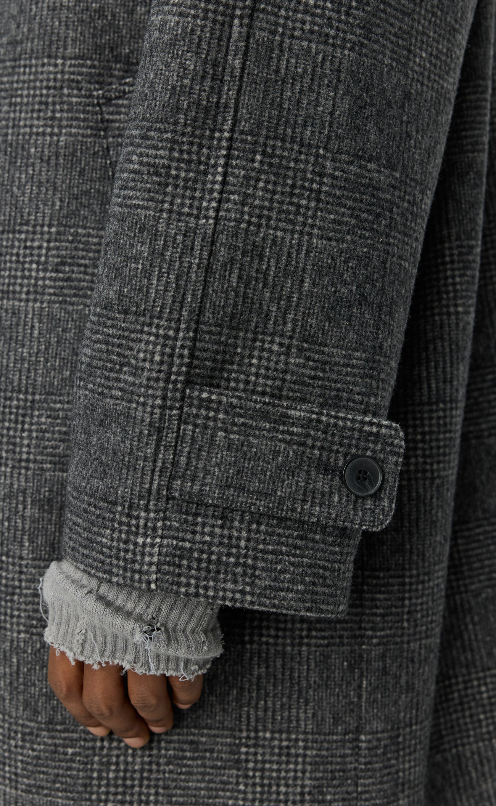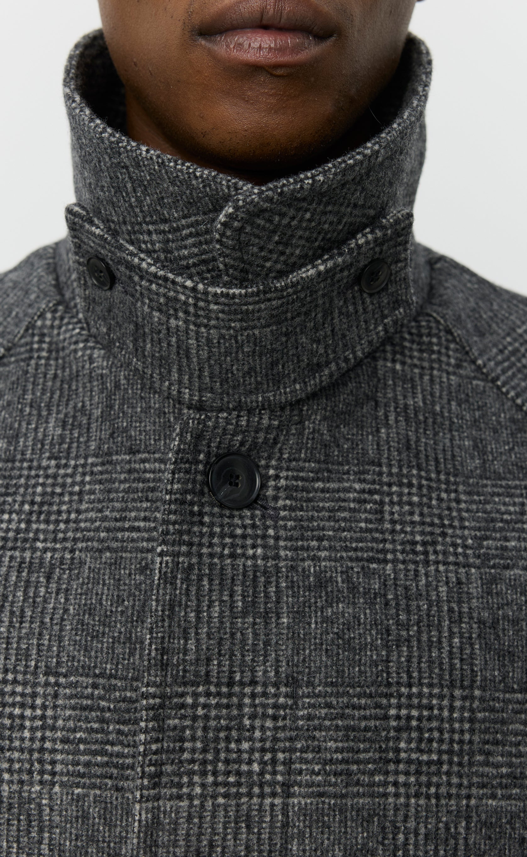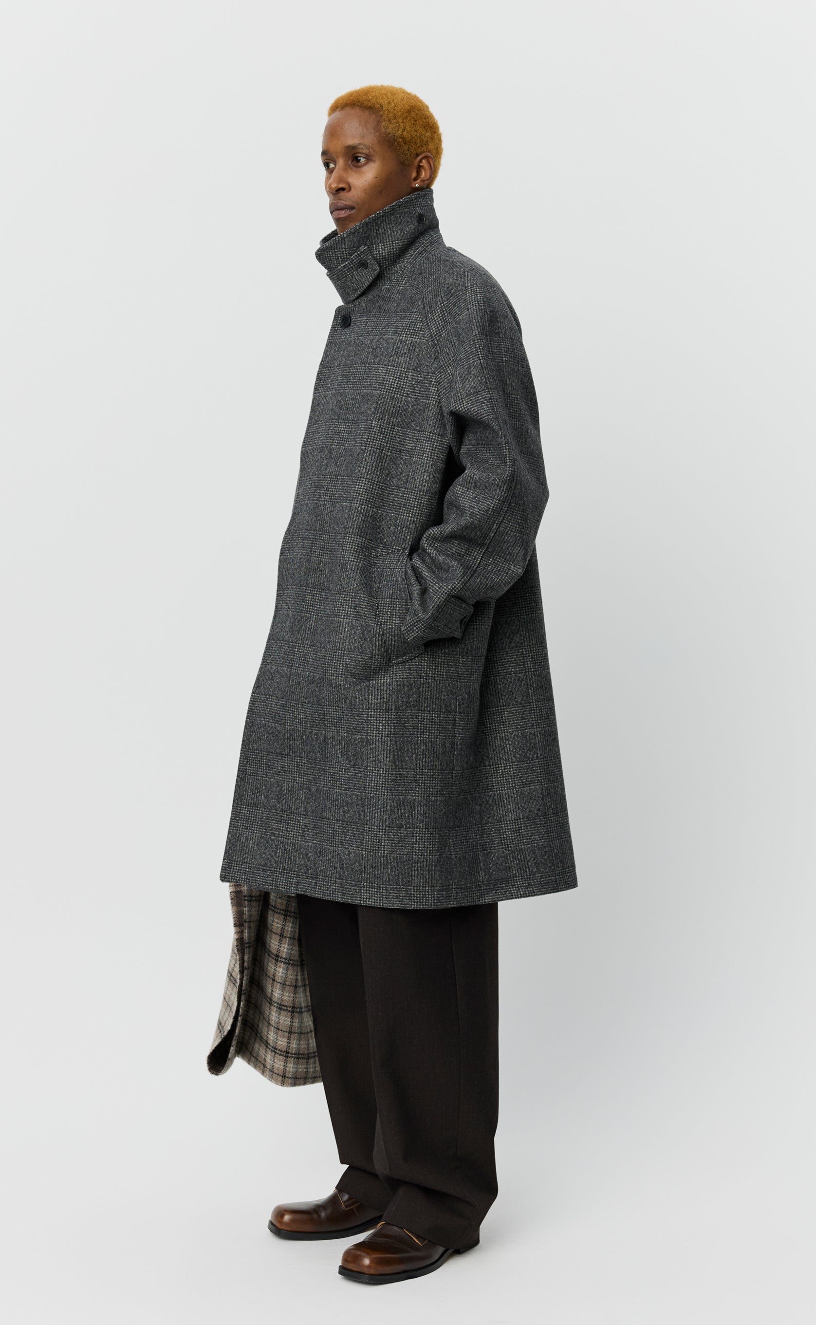 The Accession Coat is knee length with a relaxed fit and raglan sleeves. Featuring hidden button closure, removable storm collar tab and side pockets. Cut from a brushed melton wool with a black and white glen check on a grey ground. Made in limited quantities from deadstock fabric, available exclusively at Ven. Space, mfpen.com and in the Copenhagen mfpen Store.