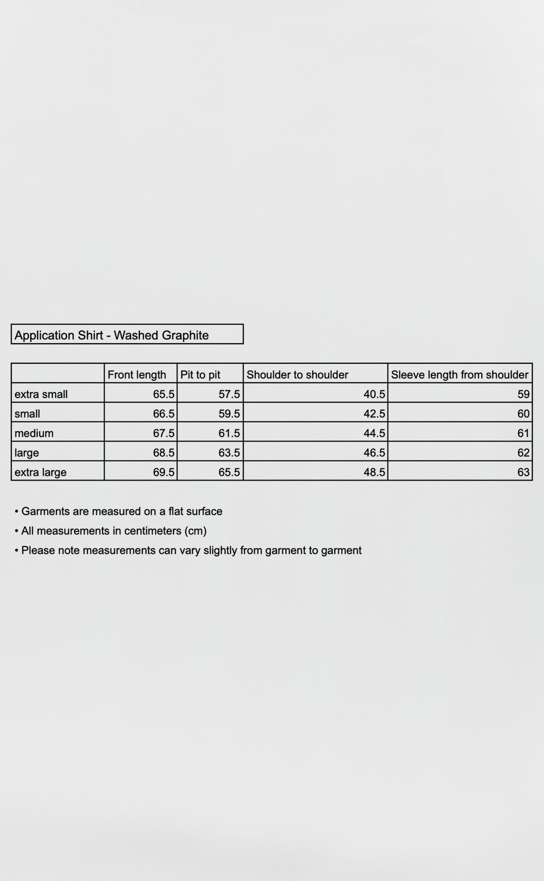 The Application Shirt has a relaxed fit, with a curved hem extended at the back. Featuring spread collar, back box pleat and split side seams. Cut from a garment washed organic cotton in faded grey.