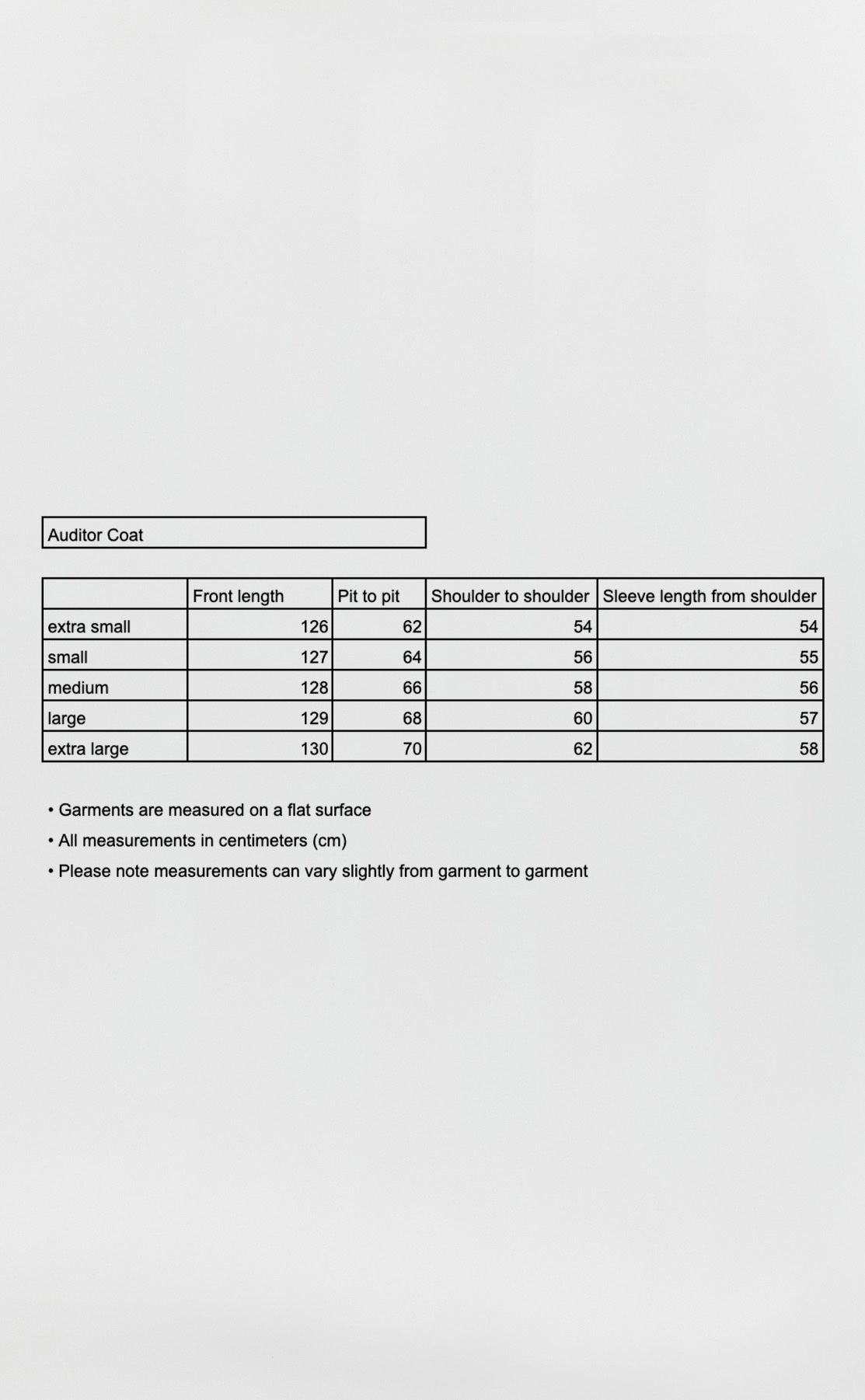 The Auditor Coat is calf length with a relaxed fit and slightly slanted shoulders. It features wide peak lapels, a double-breasted front, side entry flap pockets, interior pocket, rear vent and a removable belt at the waist. Cut from post-consumer recycled melton wool in a grey brown herringbone.