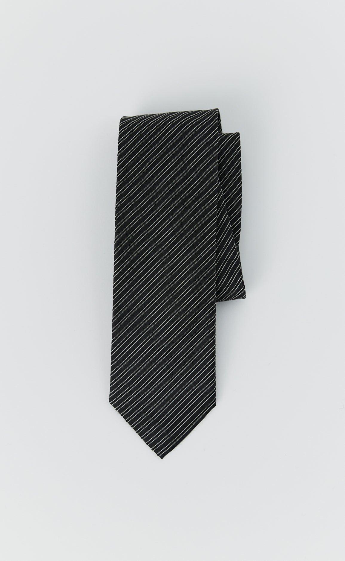 The Banquet Tie is woven from silk in Italy with a black ground and fine diagonal stripes in silver.