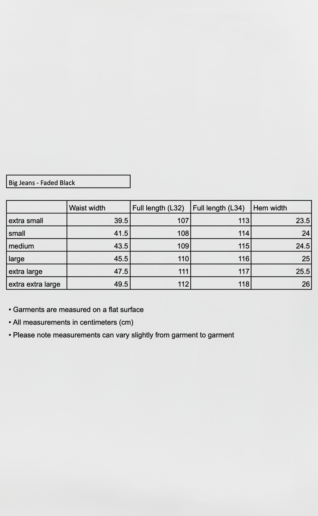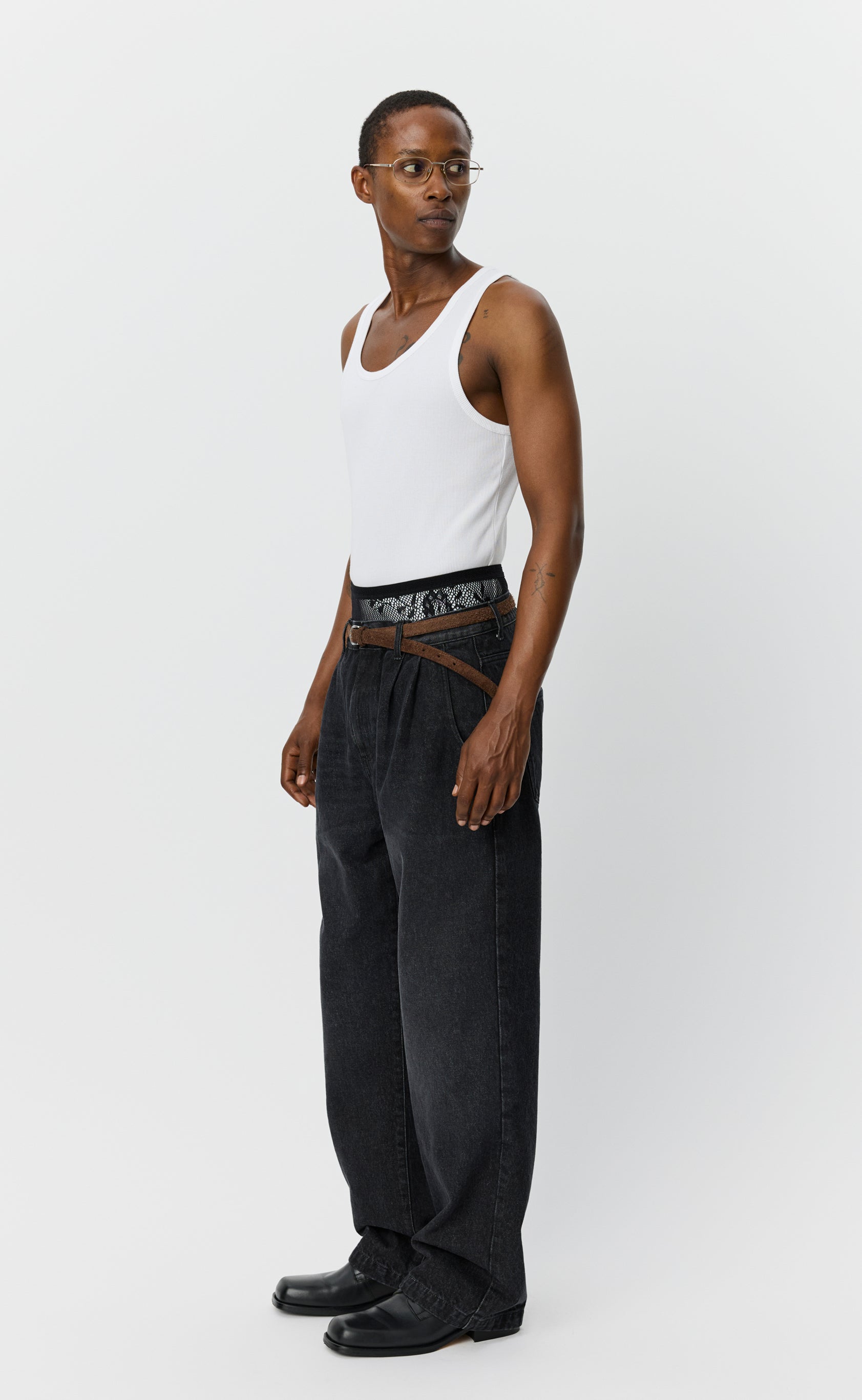 The Big Jeans have a relaxed loose fit with double pleats. Made with side pockets, rear patch pockets, metal button closure and YKK zip fly. Cut from garment washed organic cotton denim with a dry hand feel in black.