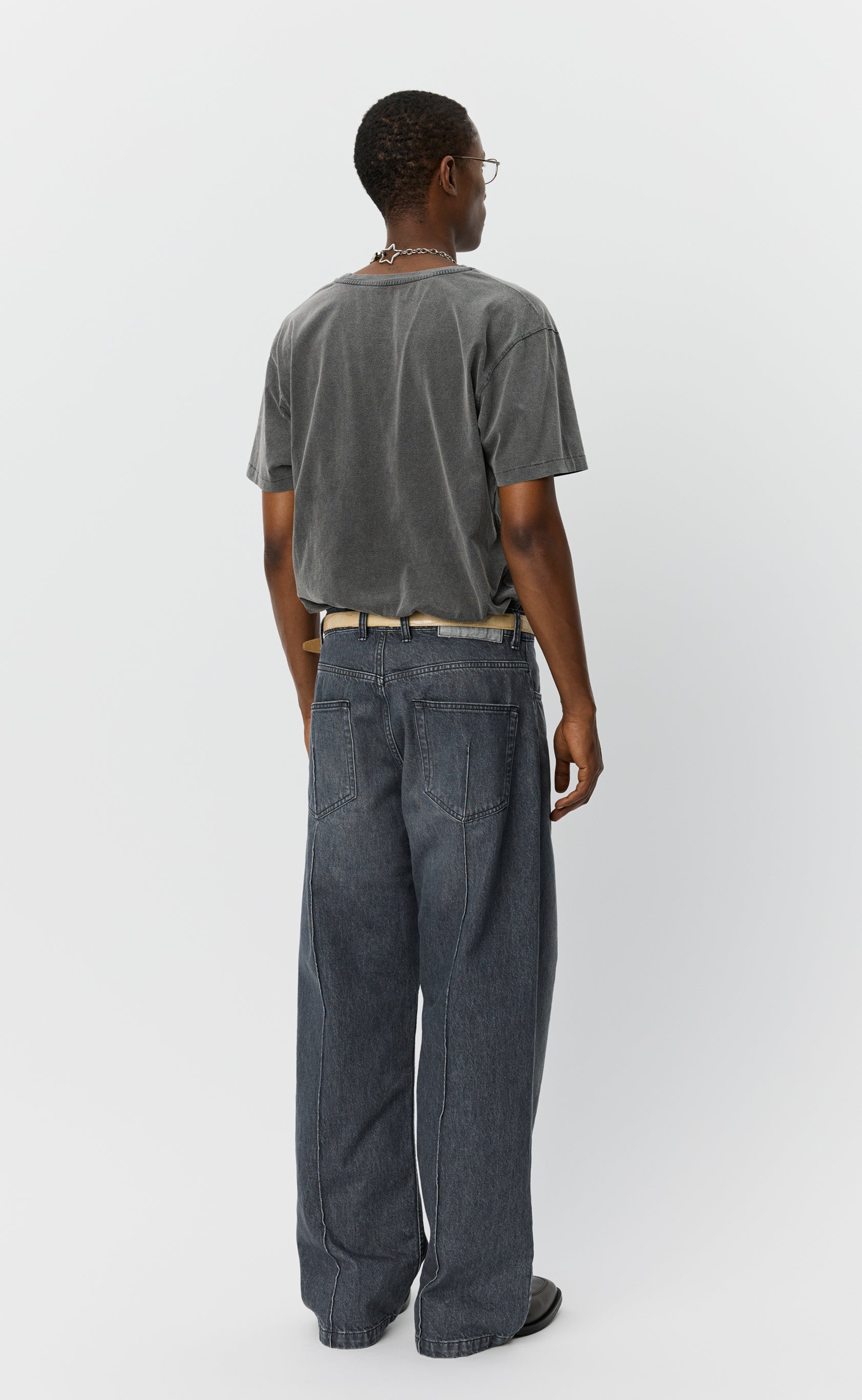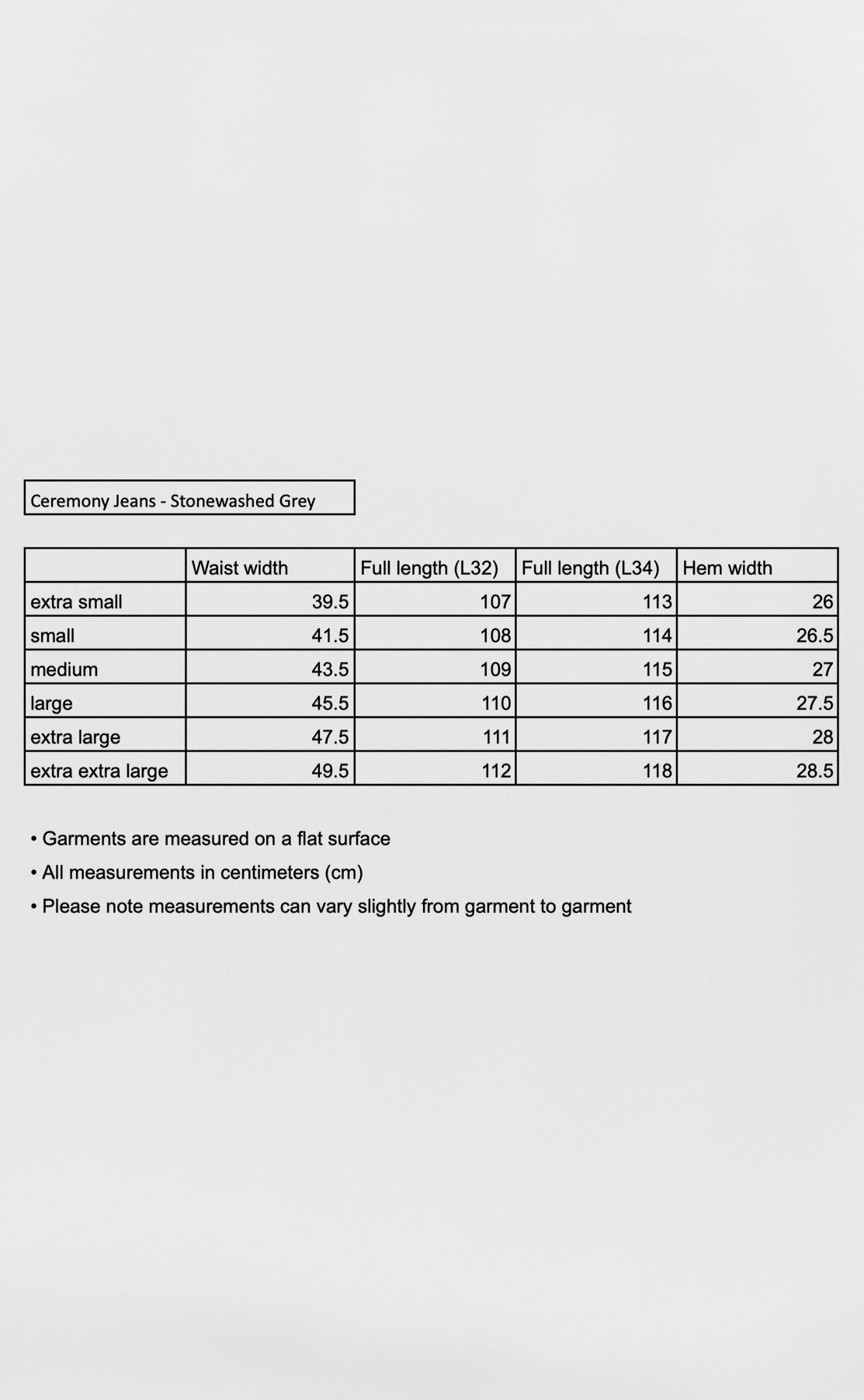 The Ceremony Jeans have a wide straight fit with a mid-rise. Featuring sewn in creases at front and back. Made with side pockets, rear patch pockets, metal button closure and YKK zip fly. Cut from a washed organic cotton denim in a worn grey.
