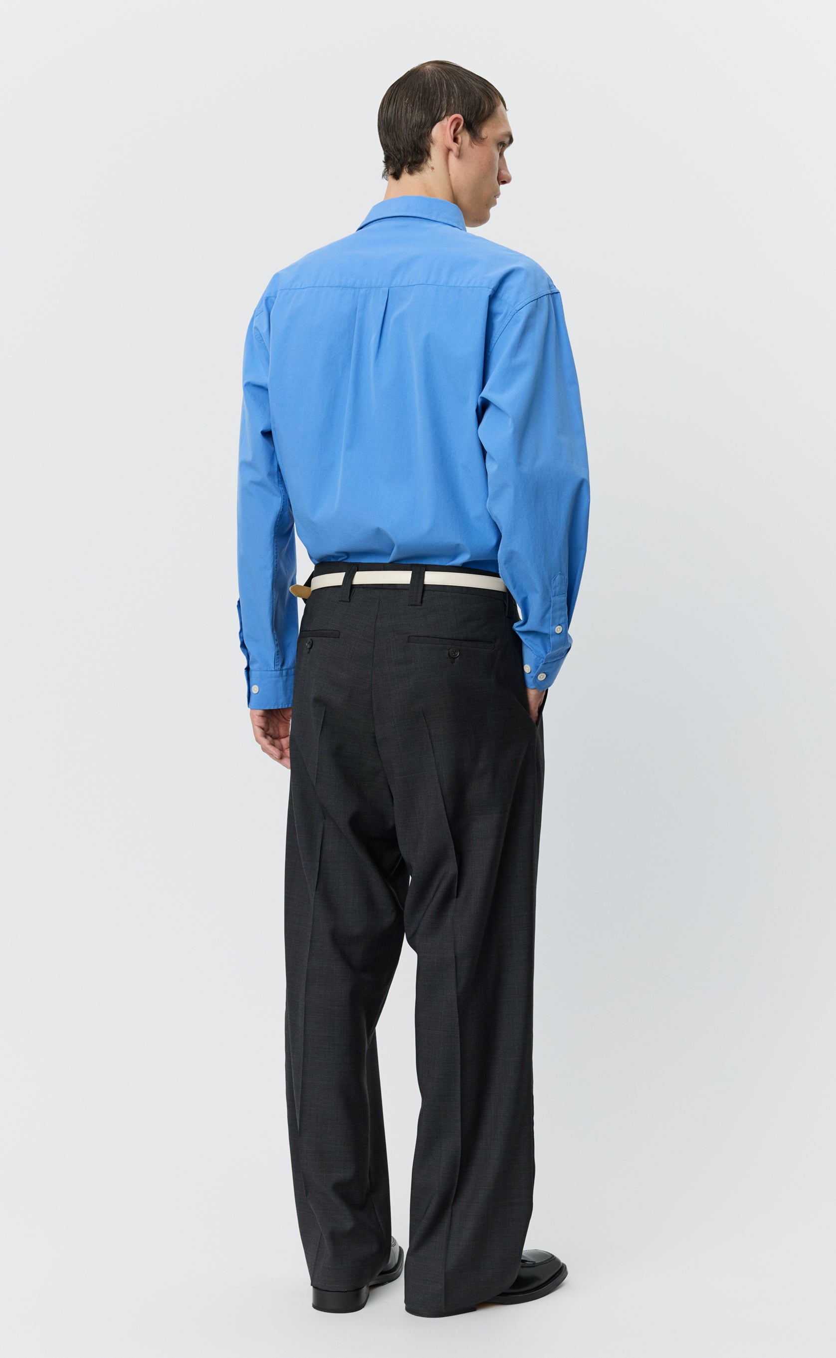 The Classic Trousers have a wide straight fit with double pleats and a mid-rise. Featuring side pockets, rear welt pockets, button fastening, hook-and-eye closure and YKK zip fly. Cut from a deadstock wool with a smooth hand feel, in a subtle grey and black glen check.