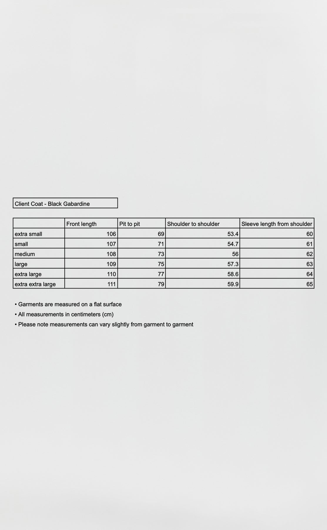 The Client Coat is knee-length with a relaxed fit and softly dropped shoulders. Featuring button closure, removable storm collar tab, side pockets with hook-and-eye clasp, and rear vent. Cut from water-resistant Italian deadstock cotton gabardine in black.