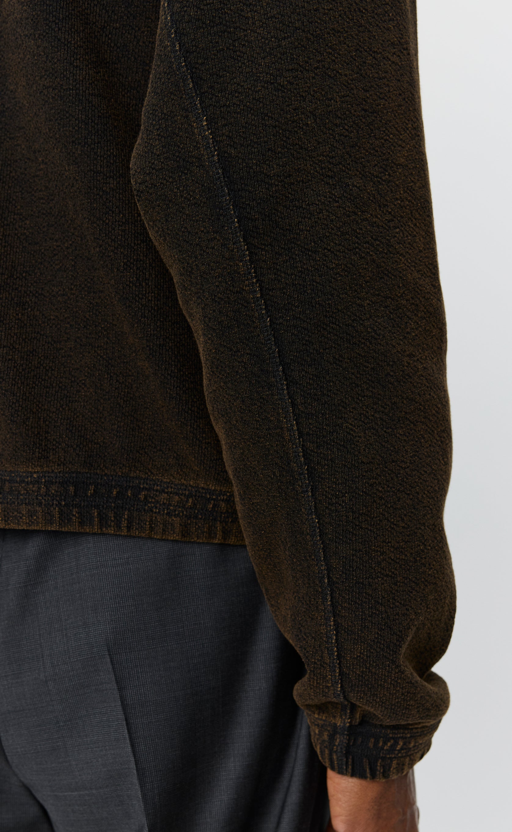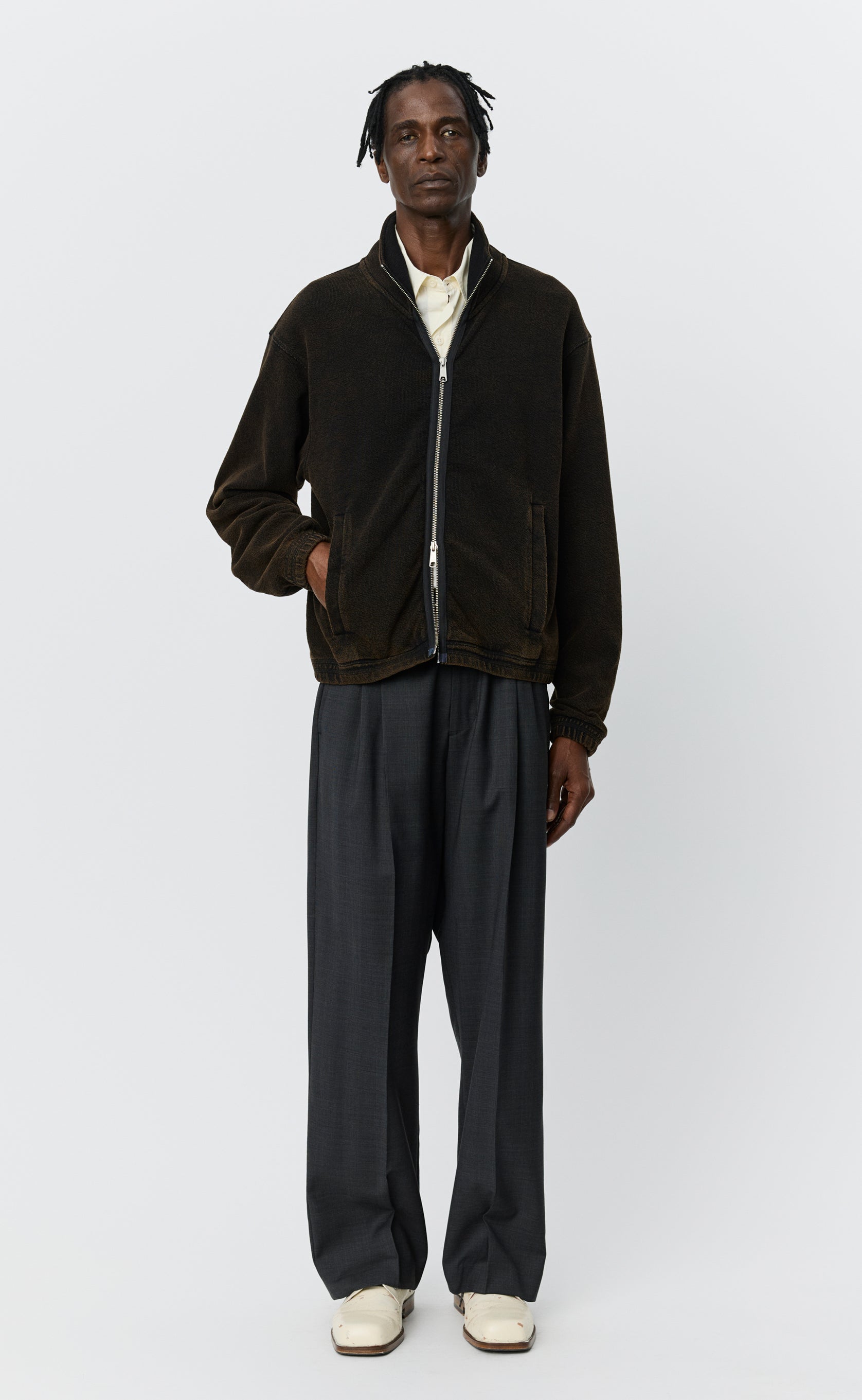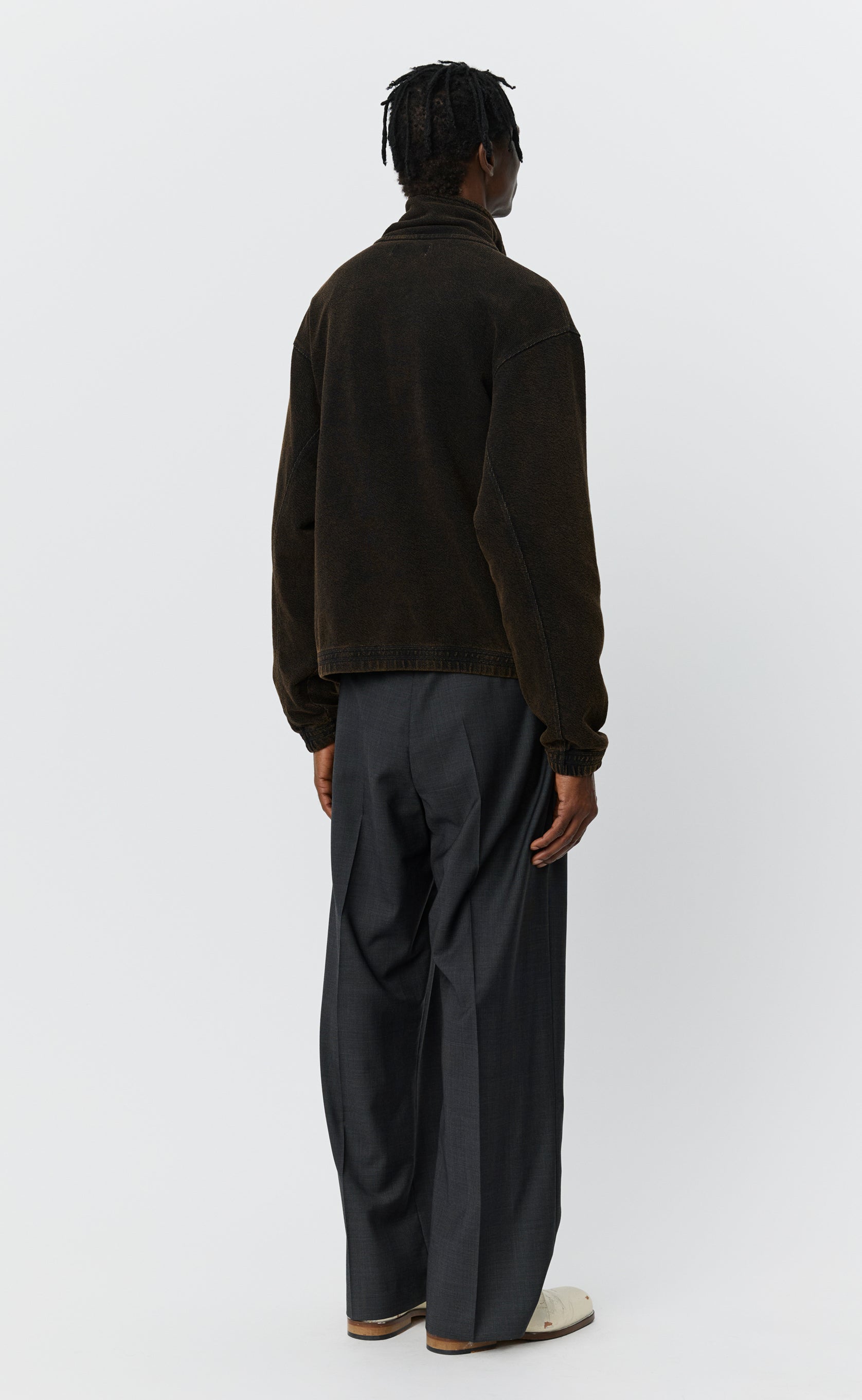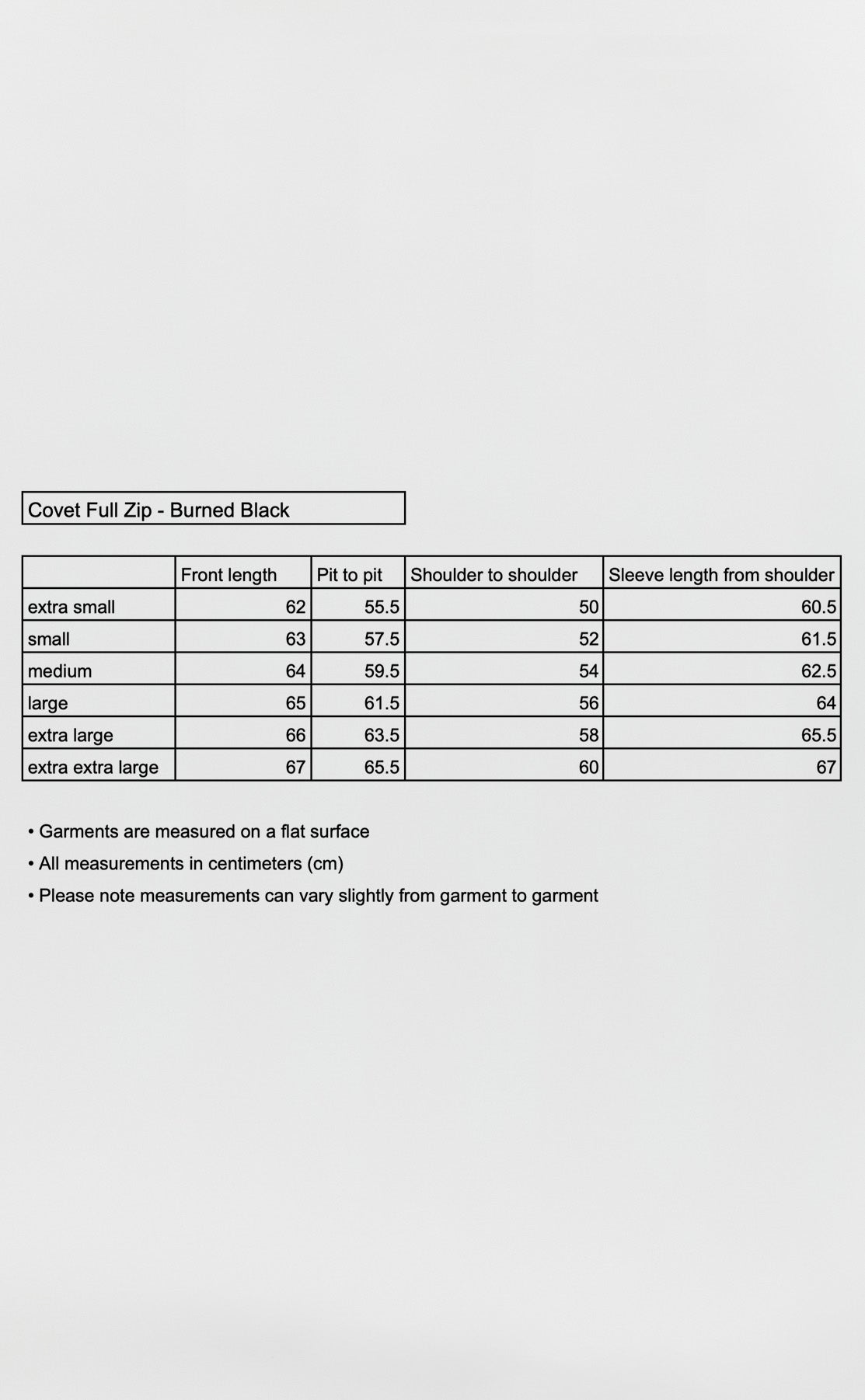 The Covet Full Zip has a relaxed fit with drop shoulders. Featuring a high neck, two-way zip, reversed flatlock seams, side welt pockets and gathered cuffs and hem. Cut from a dry organic cotton jersey with an irregular knit structure in a bleached black.