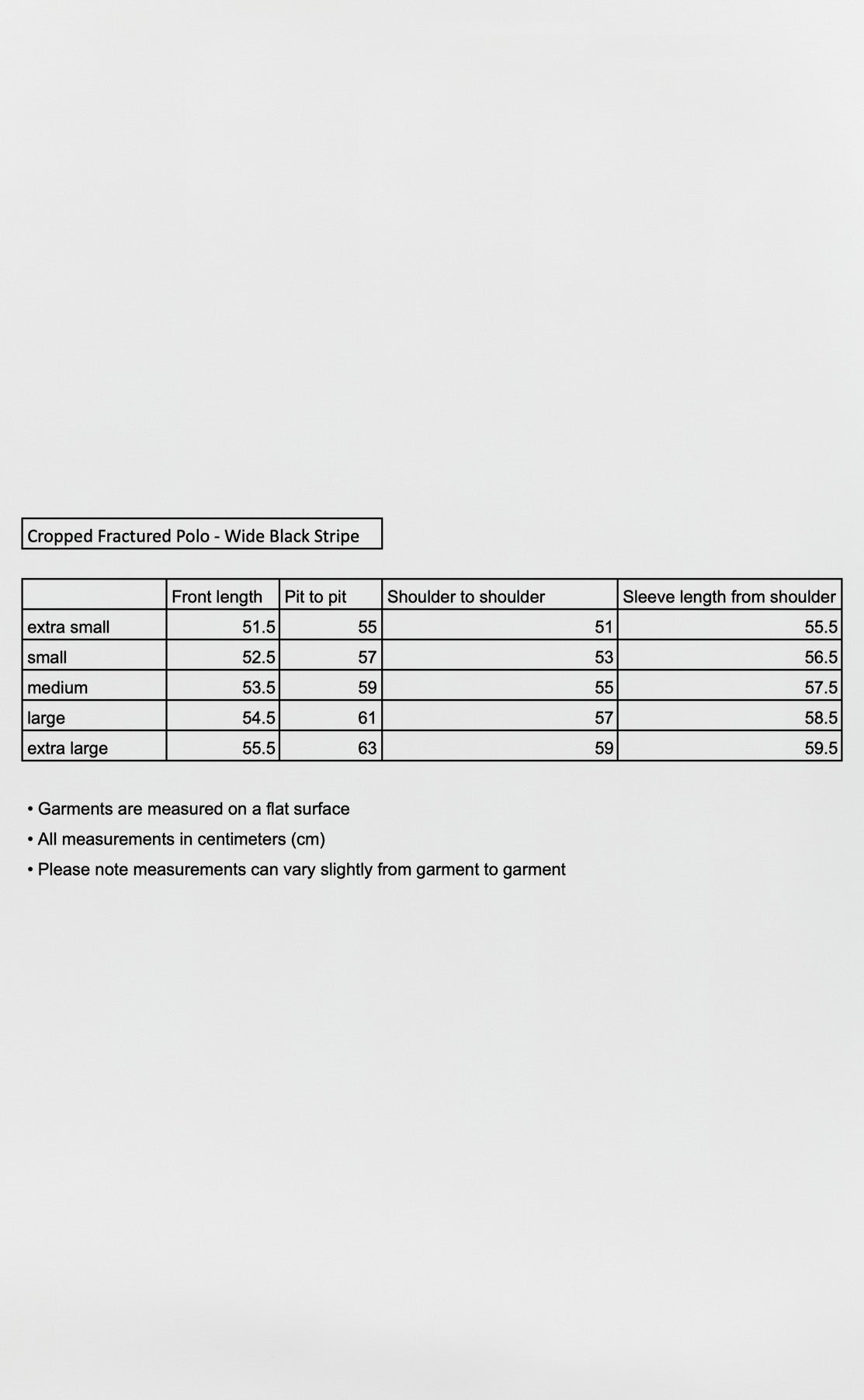 The Cropped Fractured Polo has a boxy, relaxed fit with dropped shoulders. Featuring a 3-button placket and woven mfpen herreekvipering label above the hem. Cut from a heavyweight jersey with wide black and beige stripes. Finished with distressed details and a contrast rib knit at collar and cuffs.