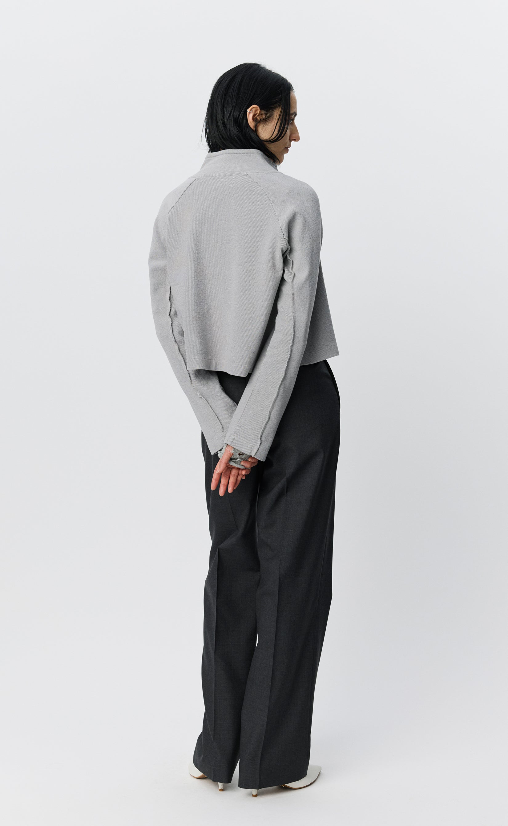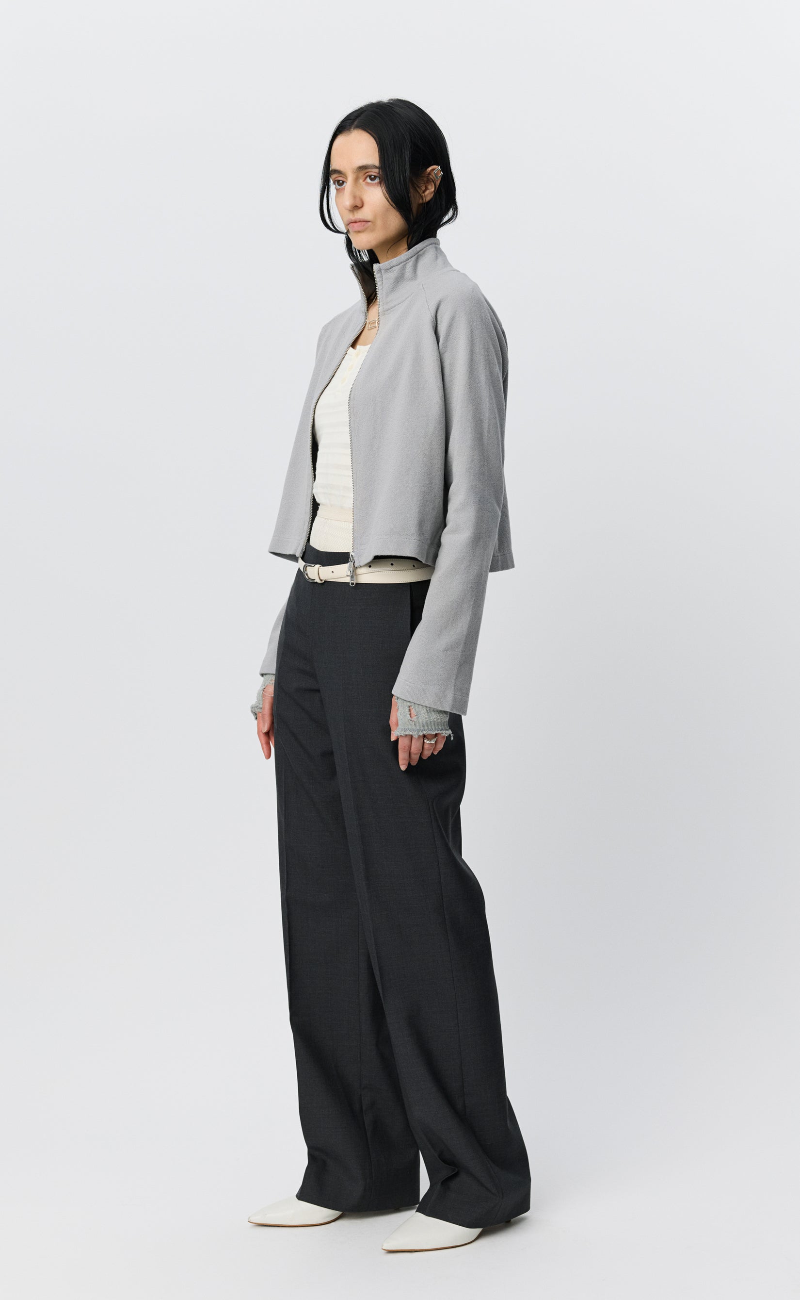 The Cropped Leisure Zip Up has a boxy fit with raglan sleeves. Featuring reversed flatlock seams and two-way zip. Cut from a dry cotton jersey with intentional breaks in the weave to create a textured soft grey.