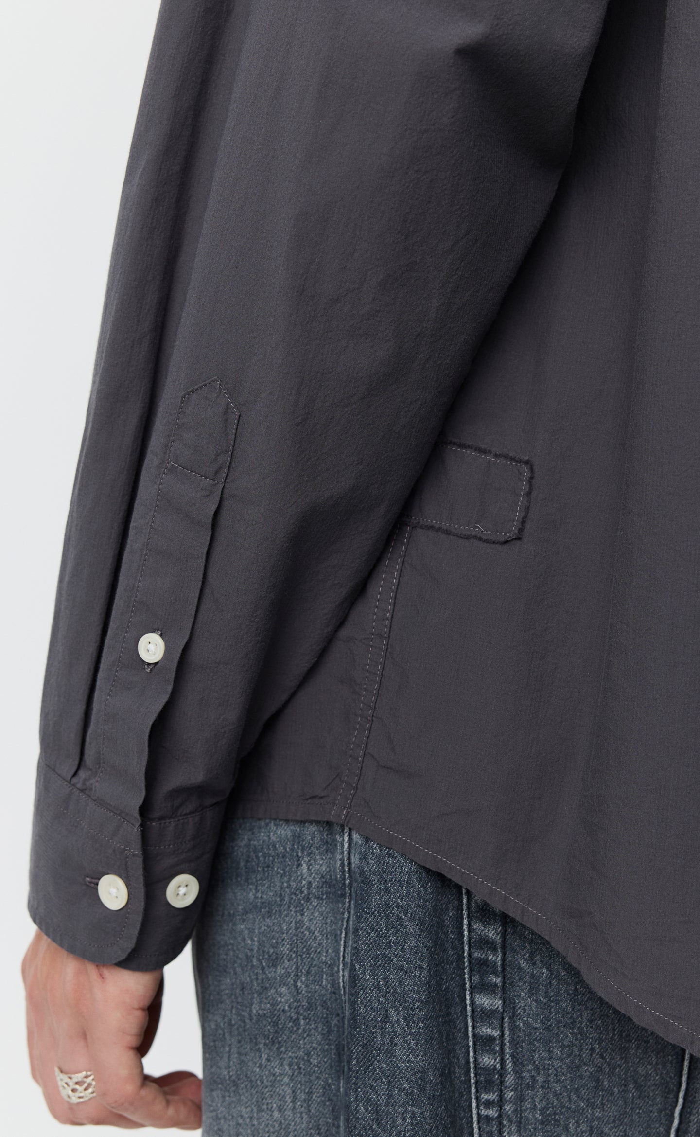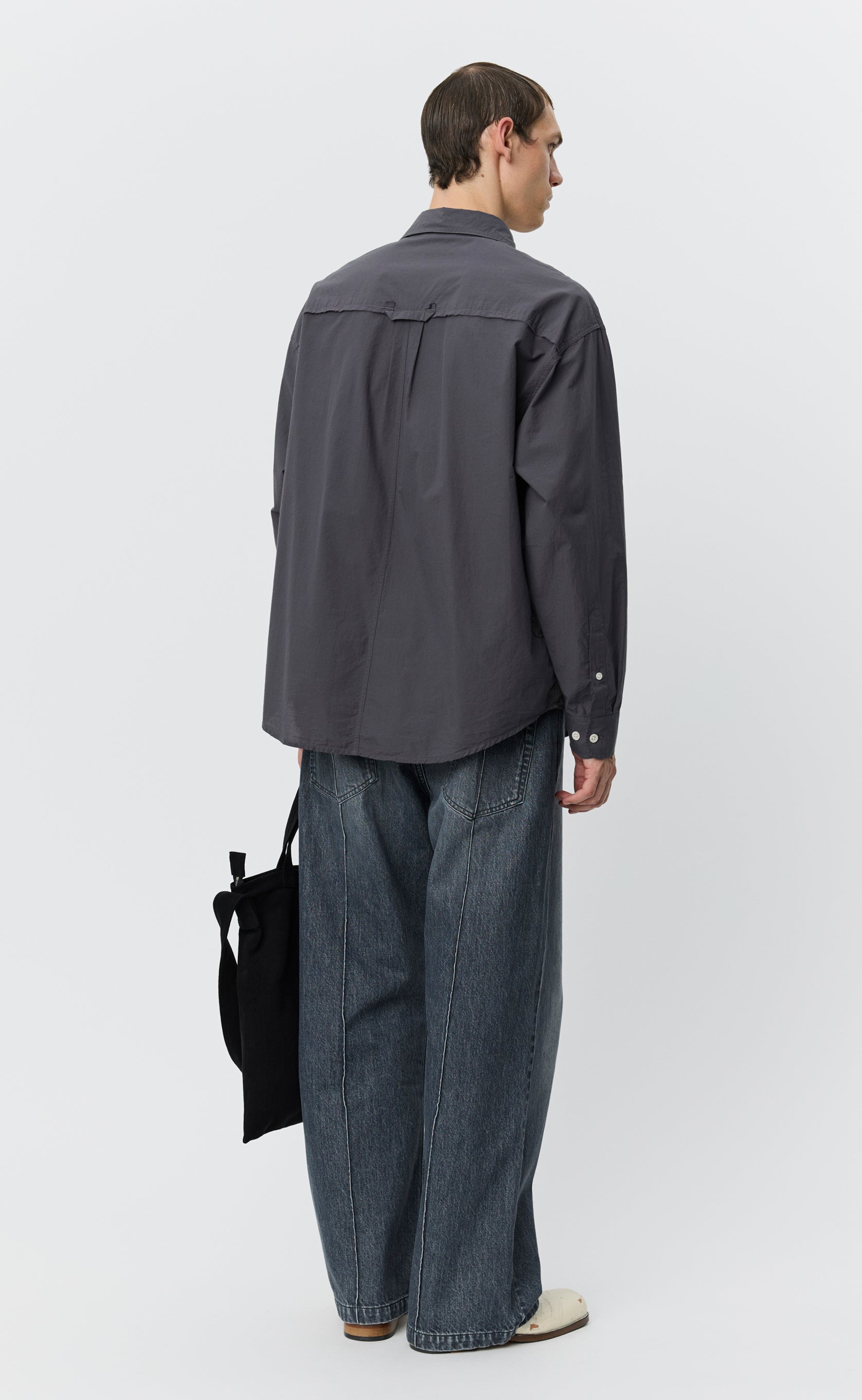 The Essay Shirt has an oversized fit with drop shoulders and a rounded hem. Featuring a button placket, back yoke pleats with a raw edged hanger loop and a raw edged patch at chest and end of both side seams. Cut from a lightweight cotton with a soft hand feel, in a grey micro structured tone on tone mini stripe.