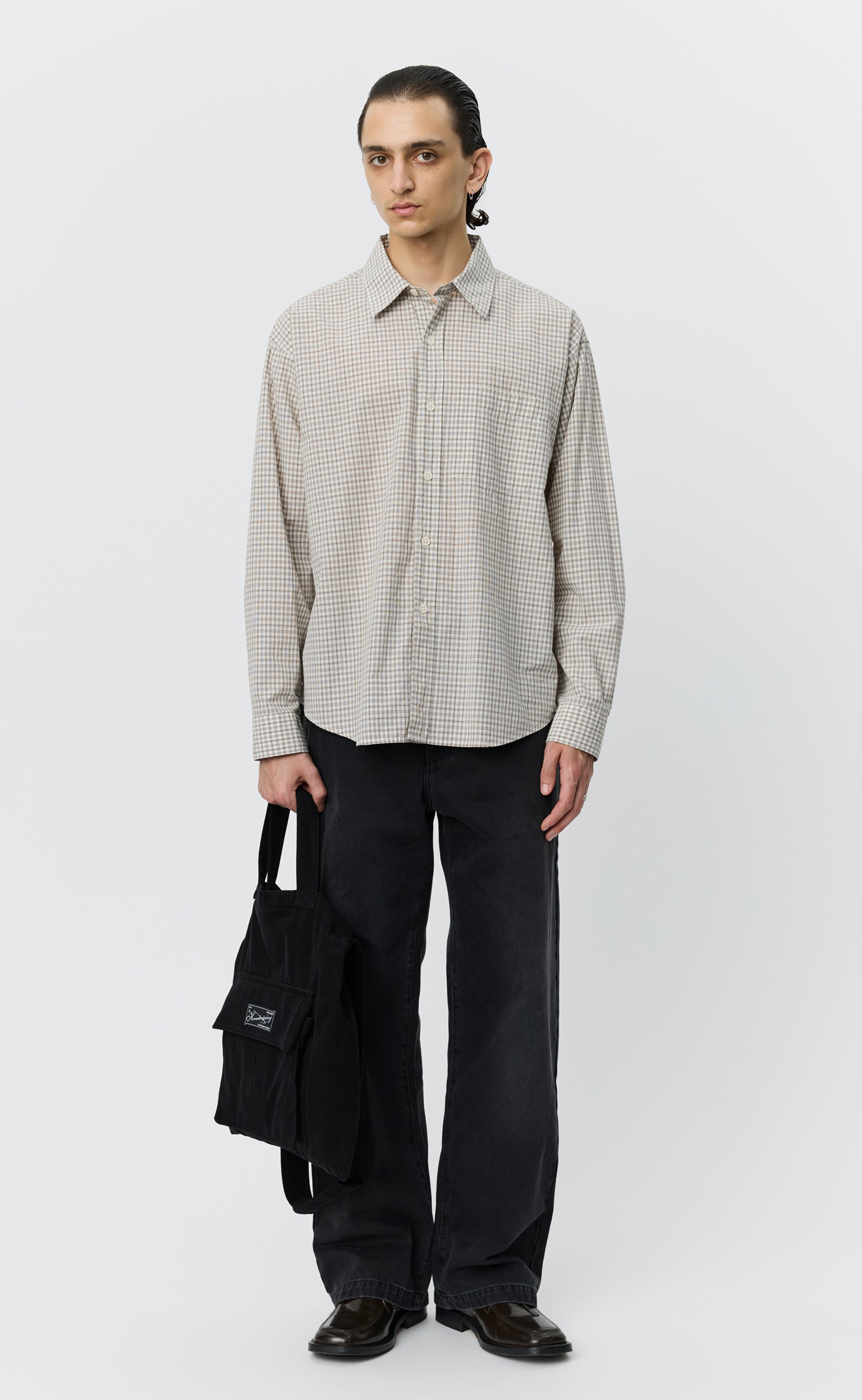 The Executive Shirt has a relaxed fit with drop shoulders and a rounded hem. Featuring a button placket, spread collar, back yoke pleats and a chest pocket. Cut from a cotton with a soft hand feel, in a light brown and soft grey plaid check on a bone white ground.