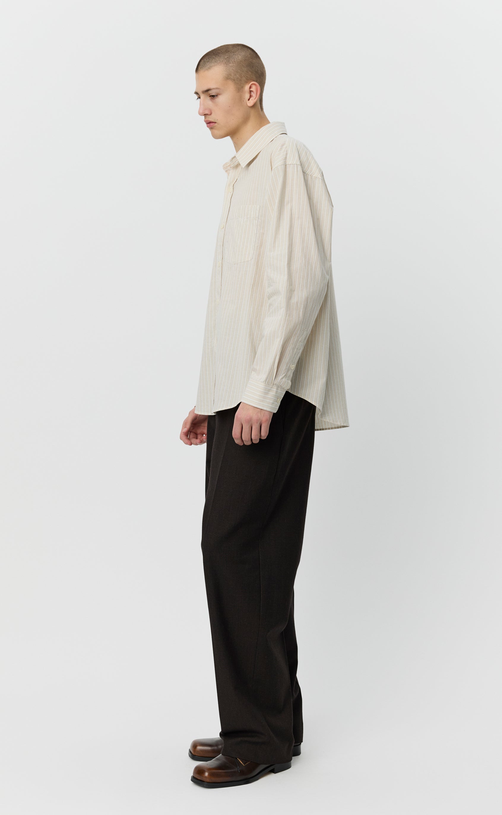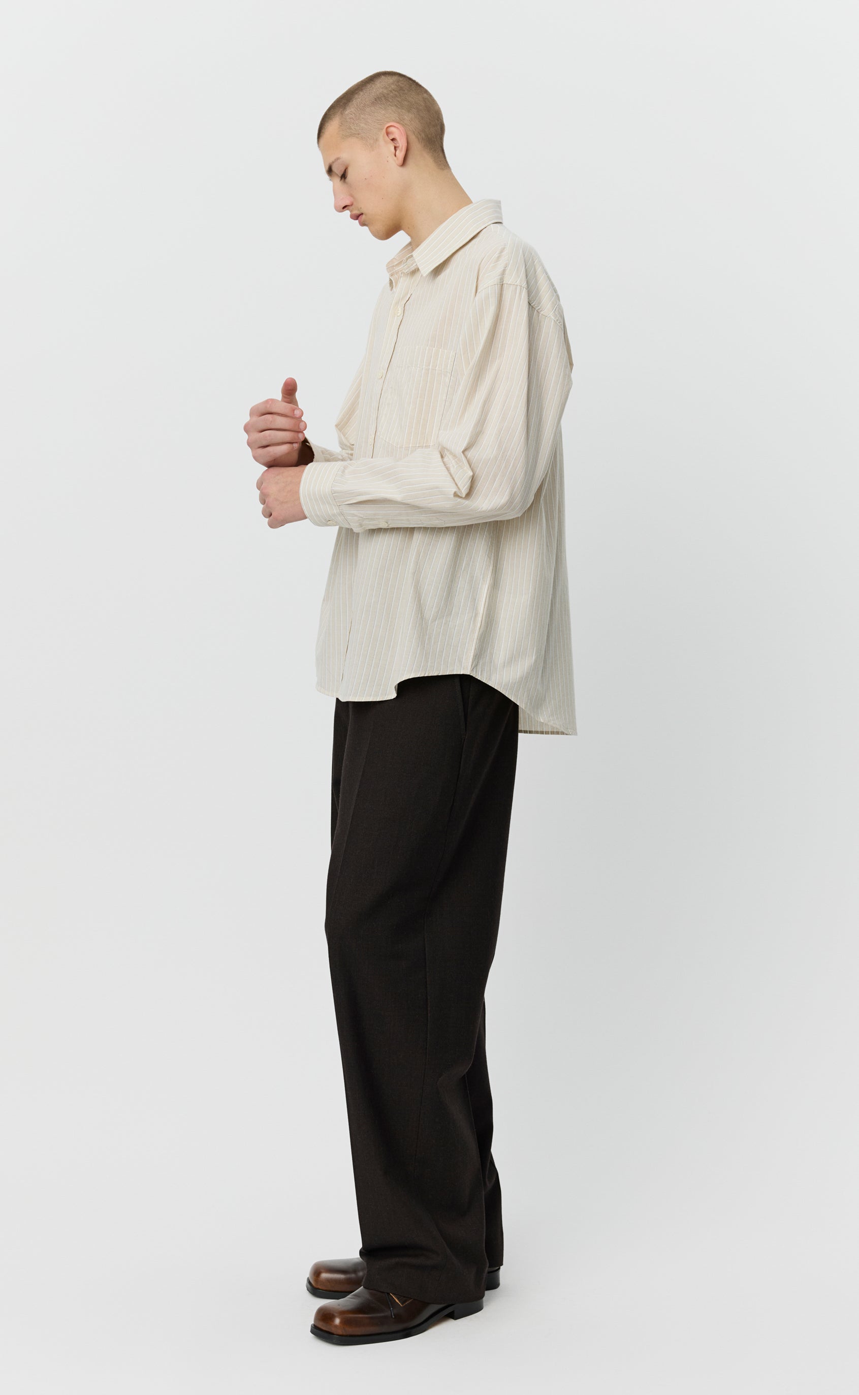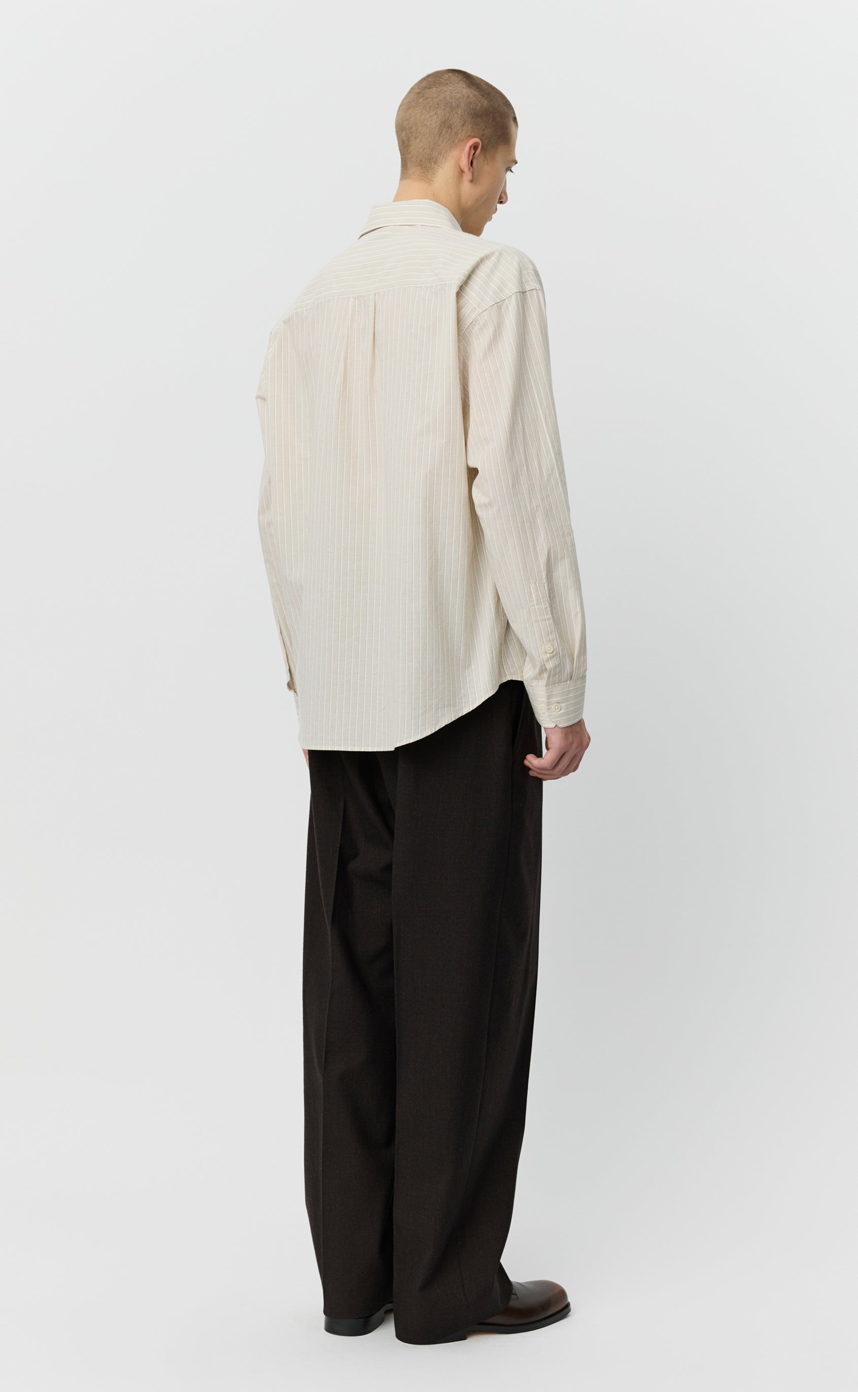 The Executive Shirt has a relaxed fit with drop shoulders and a rounded hem. Featuring a button placket, spread collar, back yoke pleats and a chest pocket. Cut from a smooth. Made in limited quantities from deadstock fabric, available exclusively on mfpen.com and in the Copenhagen mfpen store.