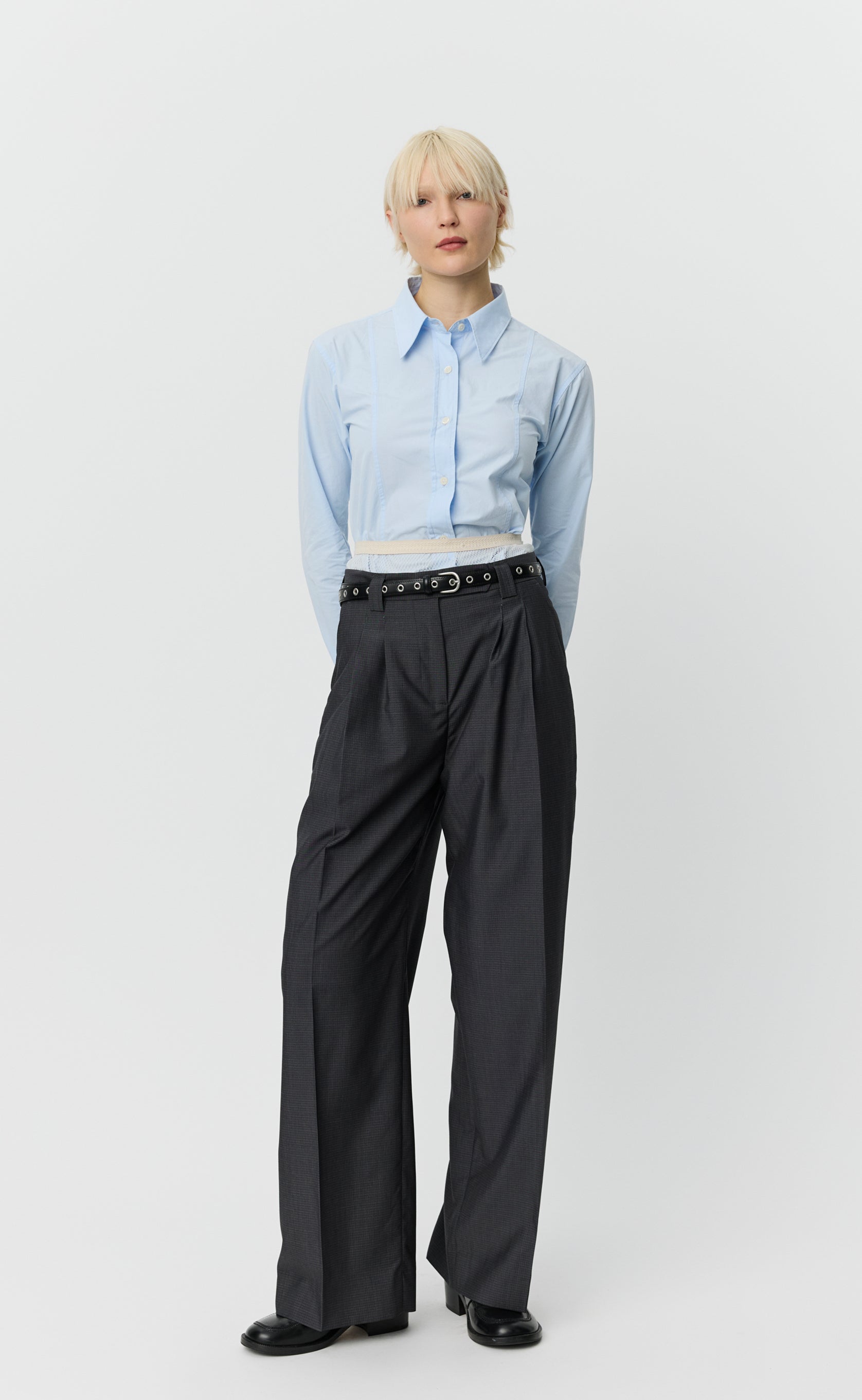 The Favorite Trousers have a wide straight fit with double pleats and a mid-rise. Featuring side pockets, rear welt pockets, button closure, hook-and-eye closure and YKK zip fly. Cut from a crisp Italian wool with a fine light grey plaid check on a dark grey ground. Made in limited quantities from deadstock fabric, available exclusively on mfpen.com and in the Copenhagen mfpen store.