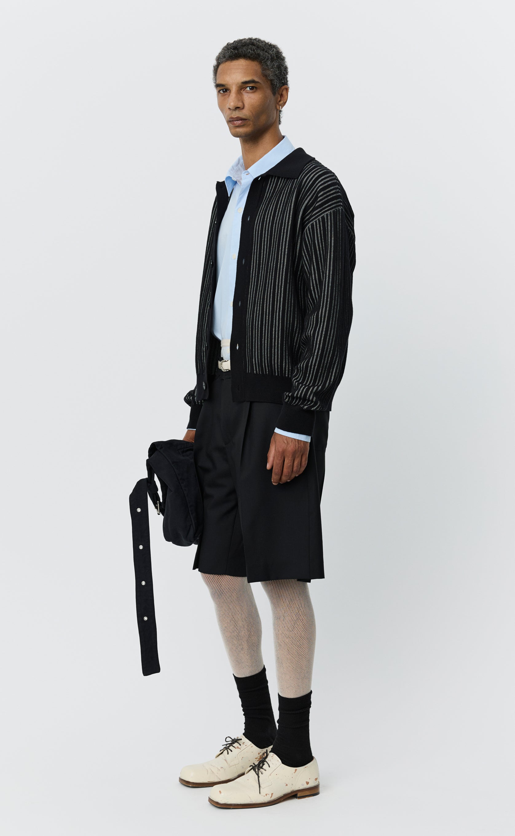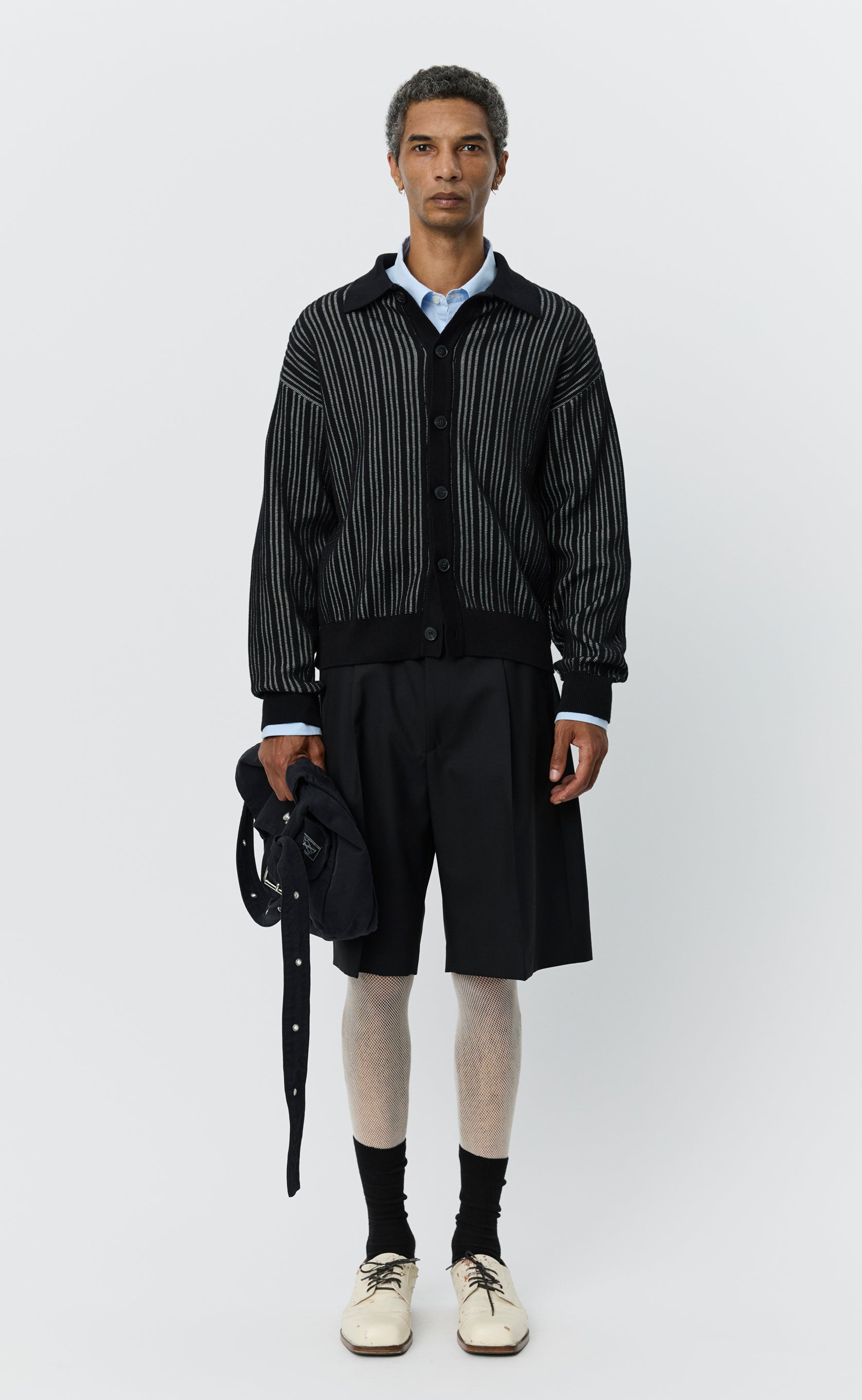The Formal Cardigan has a relaxed fit with drop shoulders and a straight hem. Featuring a spread collar, full button-front opening and rib cuffs. Knitted from a soft cotton in a white and black rib-knit construction.