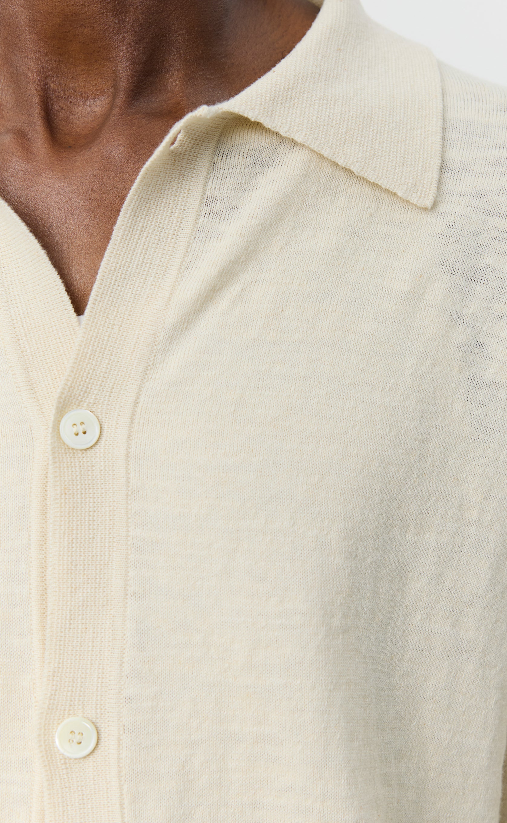 The Formal Cardigan has a relaxed fit with long sleeves and dropped shoulders. Featuring a spread collar, full button-front opening, reversed seams at sleeves and shoulders, finished with 1x1 rib at neck, hem and cuffs. Knitted from a fine cotton and linen blend in a melange off white.