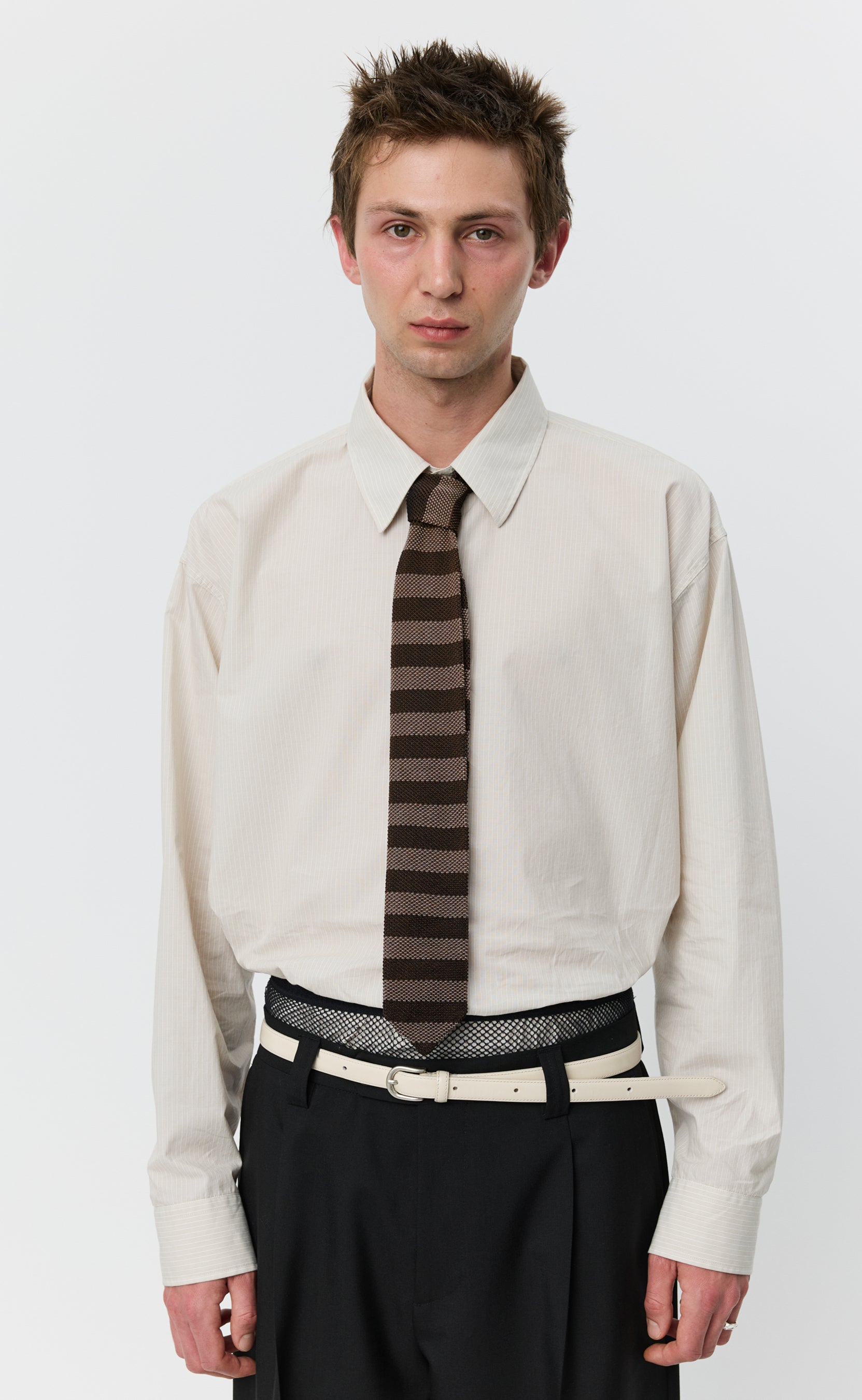 The Formal Tie is knitted from silk in Italy in a melange brown stripe with light grey, black and brown yarns. Featuring a textured knit structure and a classic pointed tip.