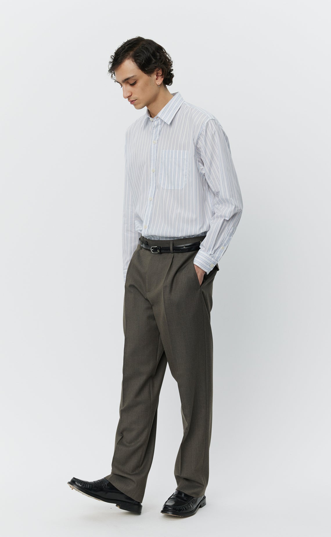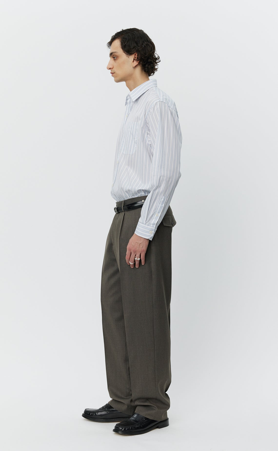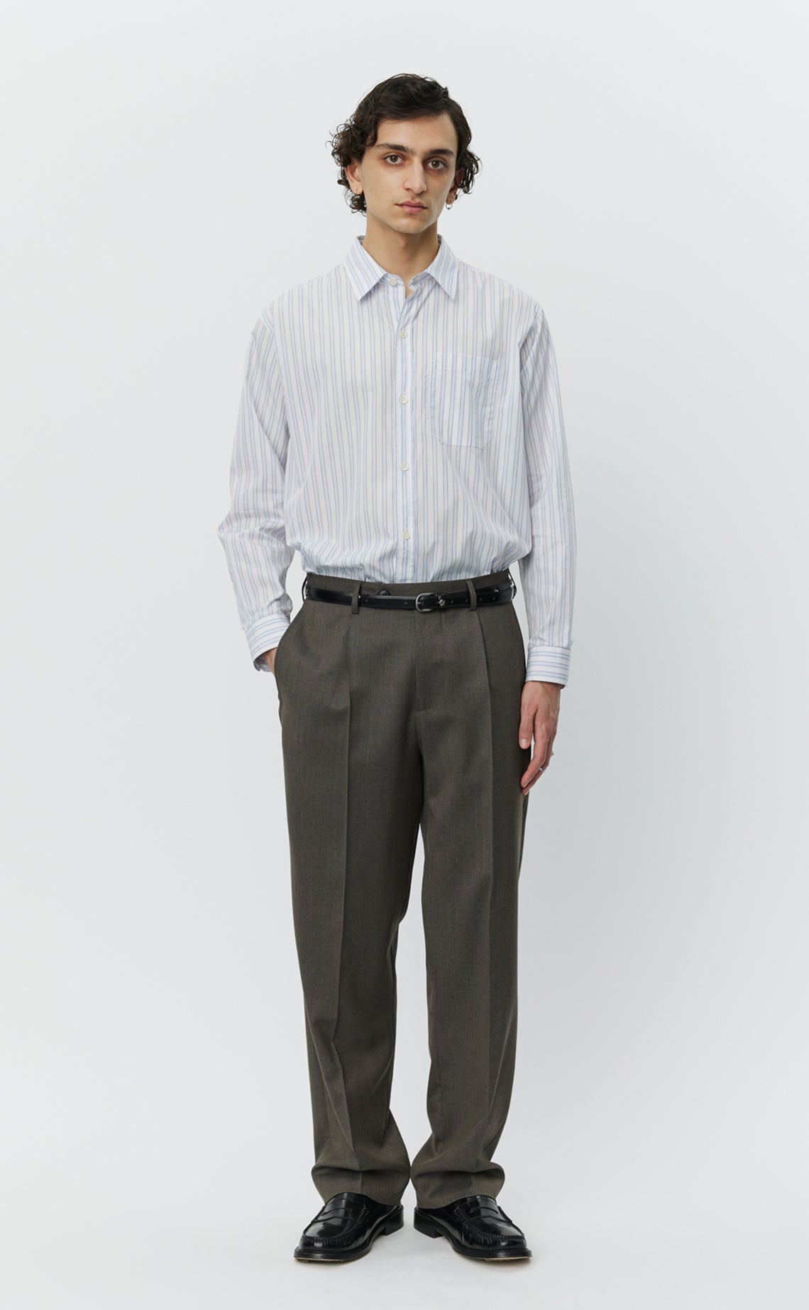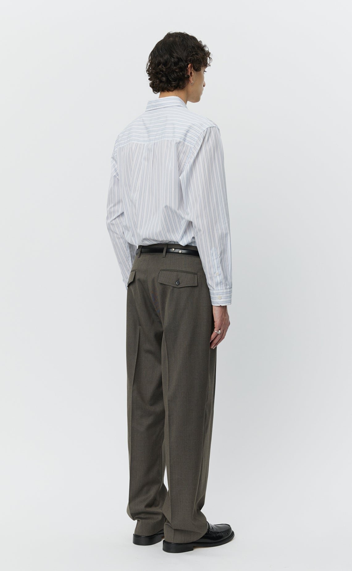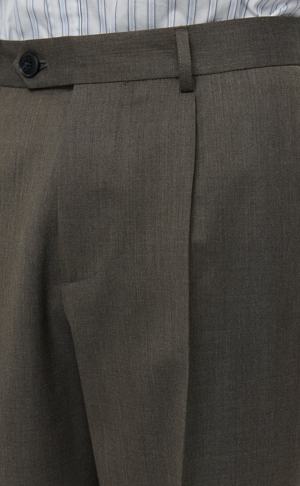 The Formal Trousers have a regular fit with single pleats and a mid-rise. Featuring side pockets, rear flap pockets, button fastening, hook-and-eye closure and YKK zip fly. Cut from a wool twill with a dry hand feel, in a blend of light grey and brown yarns.