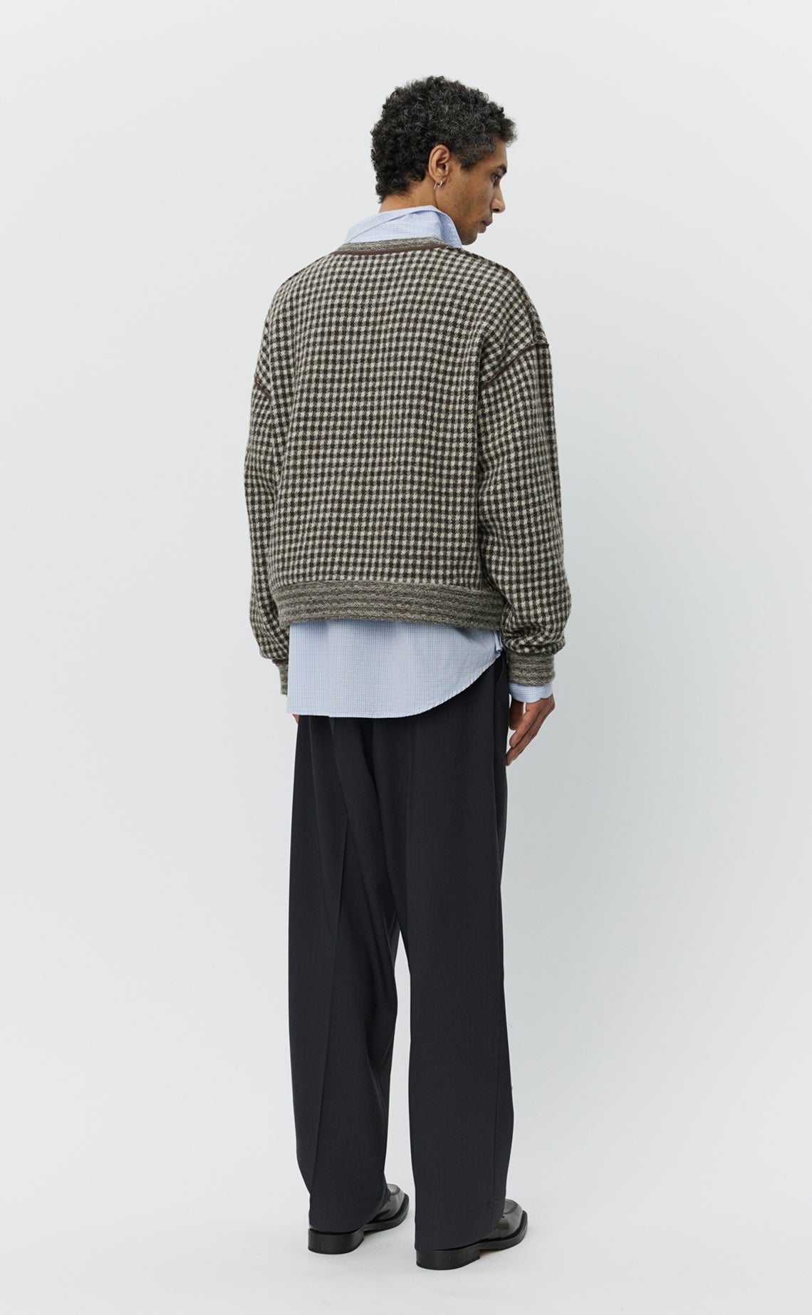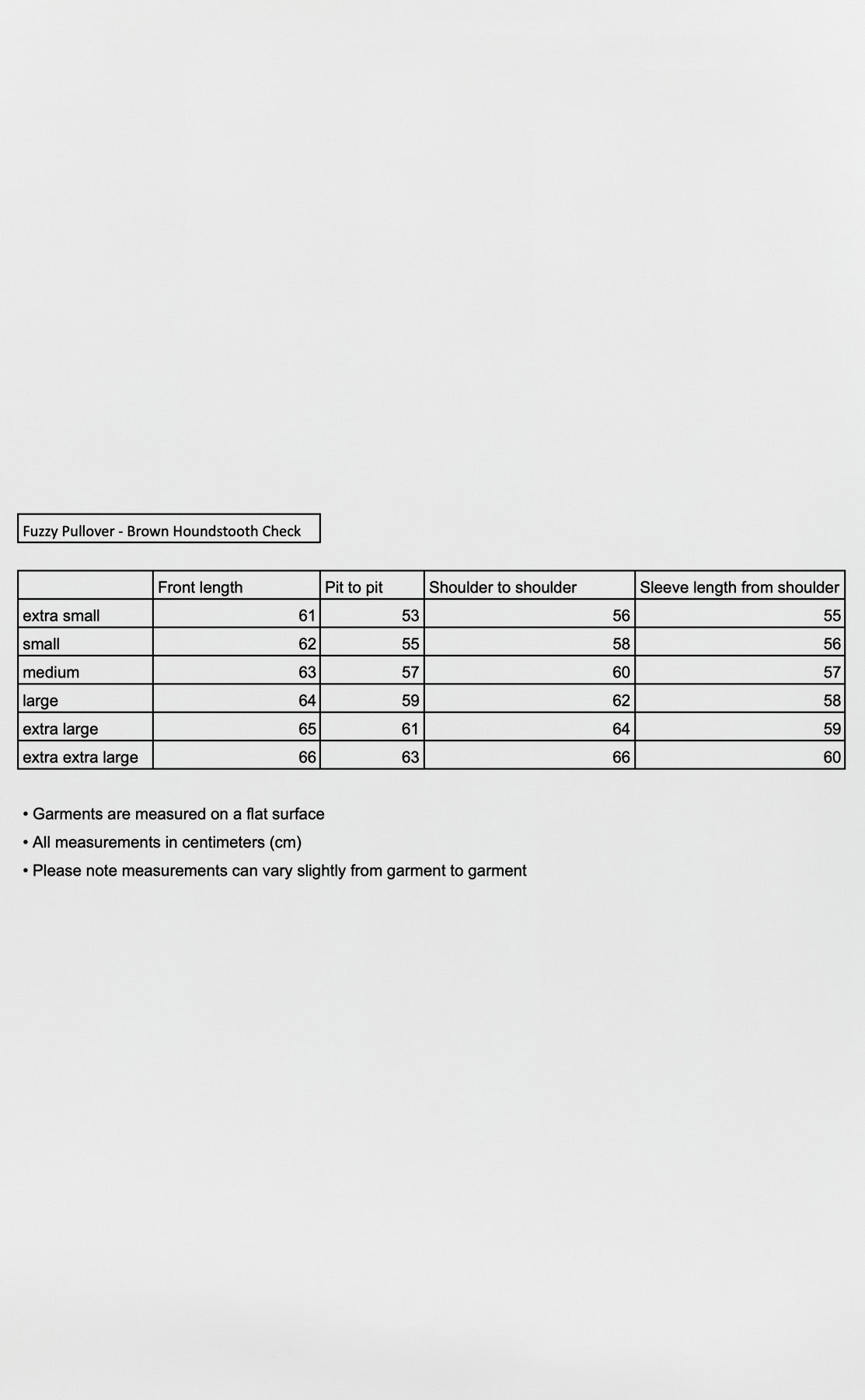 The Fuzzy Pullover has a boxy fit with dropped shoulders. Featuring reversed flatlock seams and finished with cuffs, hem and neckline using the reverse of the fabric. Cut from a soft brushed wool with a brown houndstooth check on an off-white ground.
