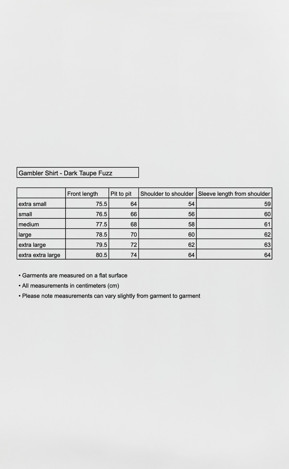 The Gambler Shirt has an oversized fit with drop shoulders and a curved hem. Featuring a spread collar and snap button placket. Cut from a soft, garment dyed Tencel® jersey with a subtle pilling effect in a muted brown.