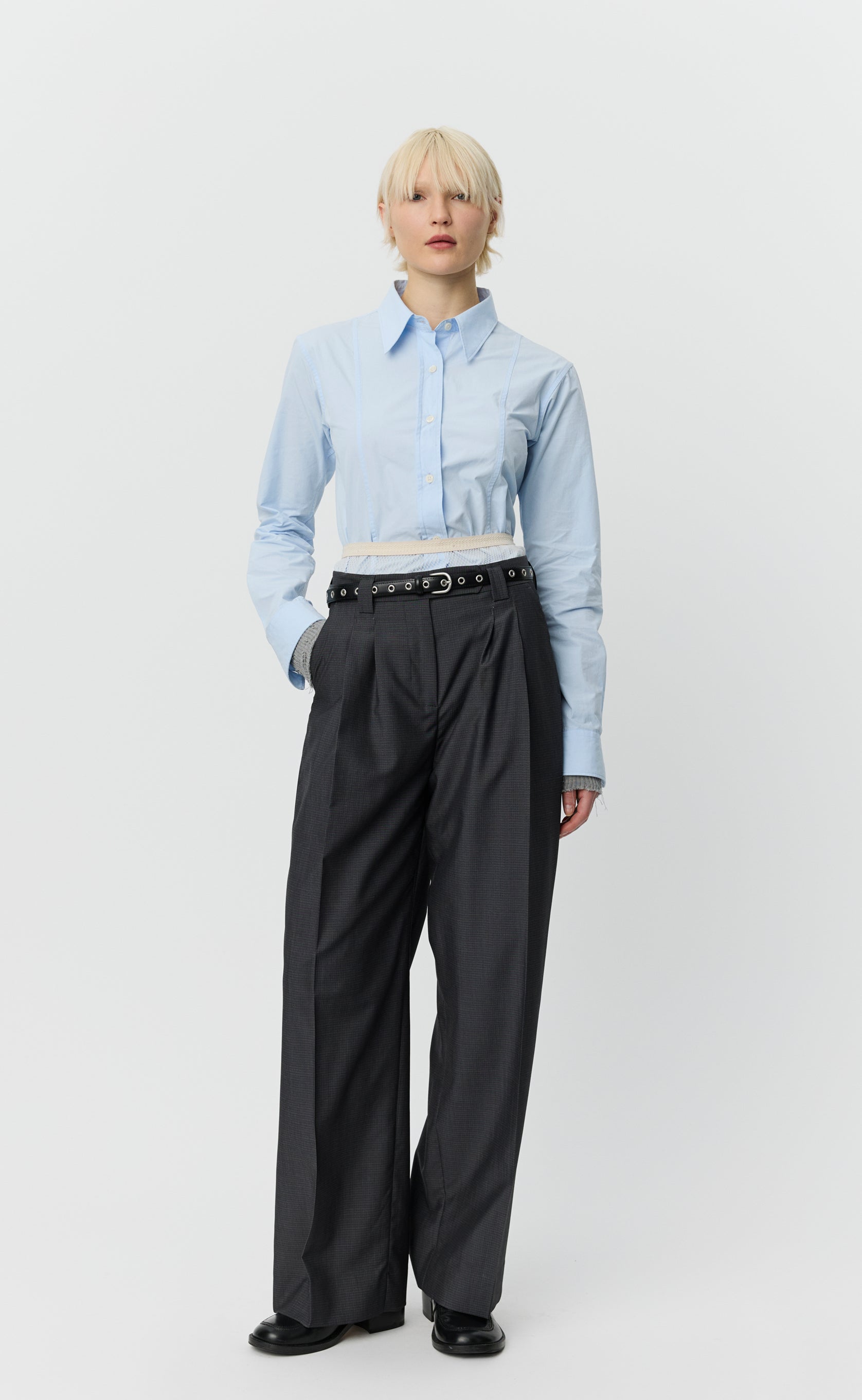 The Hostile Belt measures 115 cm long and 2 cm wide. Crafted from polished black leather with a natural leather lining. Featuring silver eyelets running the length of the belt, hand painted edges and a rounded silver buckle with a brushed finish.