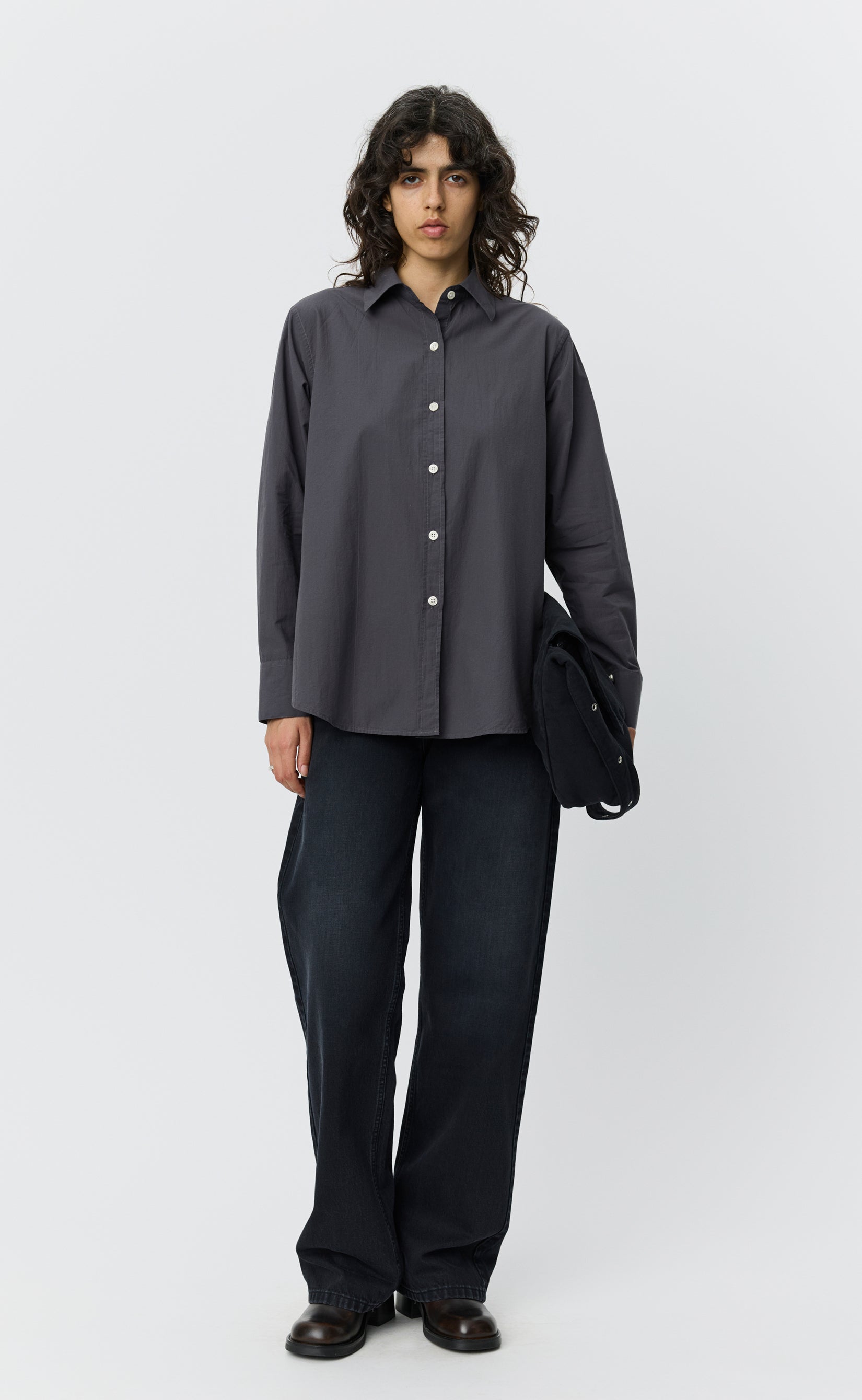 The Inquiry Shirt has a relaxed fit, with a curved hem extended at the back. Featuring a button placket, spread collar, back yoke pleats with a raw edged hanger loop and split side seams. Cut from a lightweight cotton with a soft hand feel, in a grey micro structured tone on tone mini stripe.
