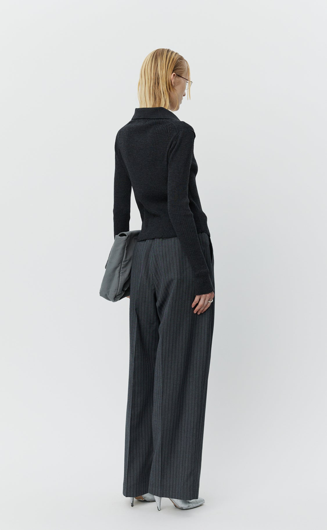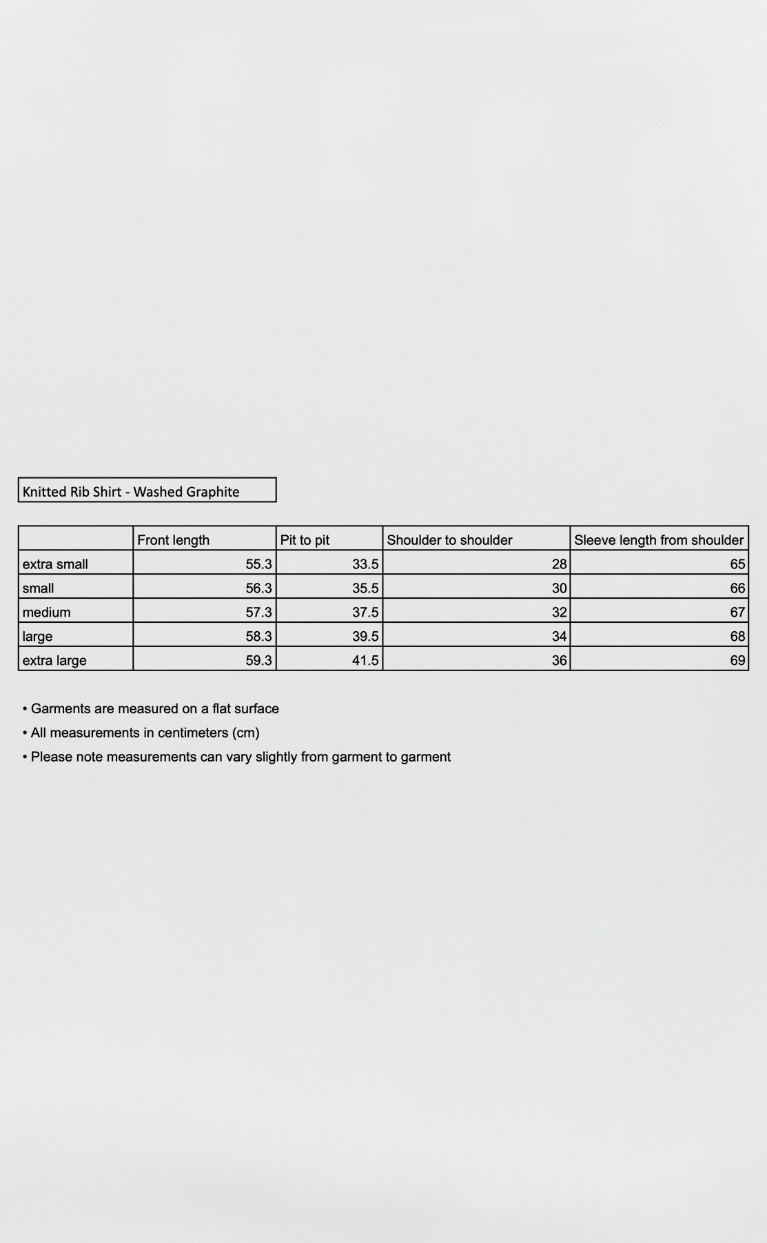 The Knitted Rib Shirt has a slim fit with a slightly curved hem. Featuring a spread collar, button placket and slits at the sleeve hems. Knitted from a heather grey fine merino wool yarn with a 4x2 rib knit throughout the body.