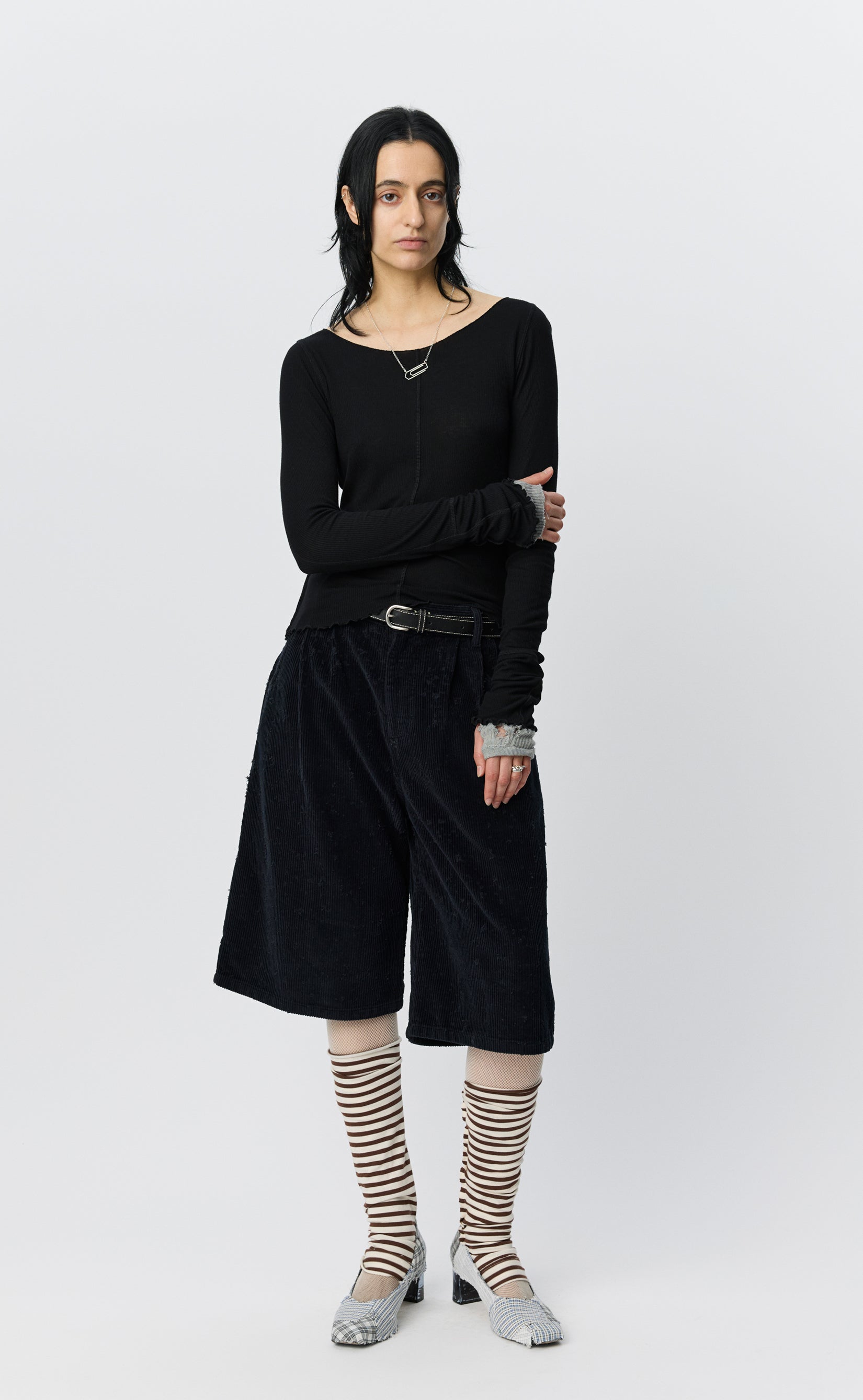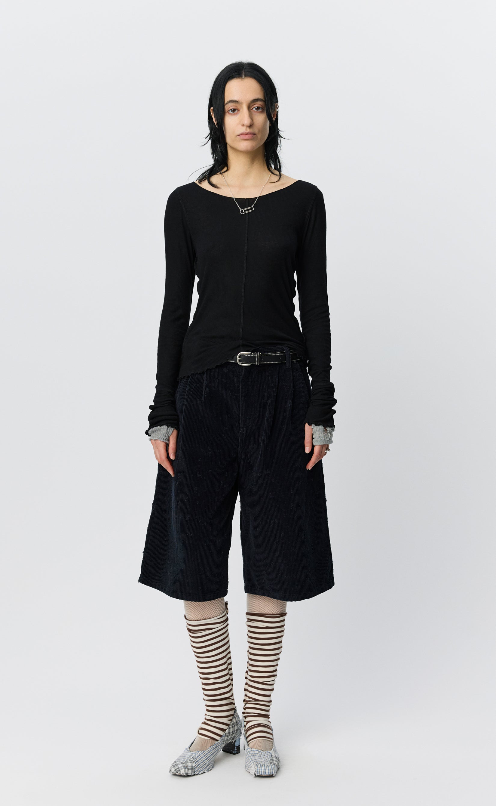 The LS Flatlock Tee has a slim fit with long sleeves and a wide raw edge neckline. Featuring scalloped hems and reversed flatlock seams throughout. Cut from a lightweight viscose blend rib in a semi-sheer black.