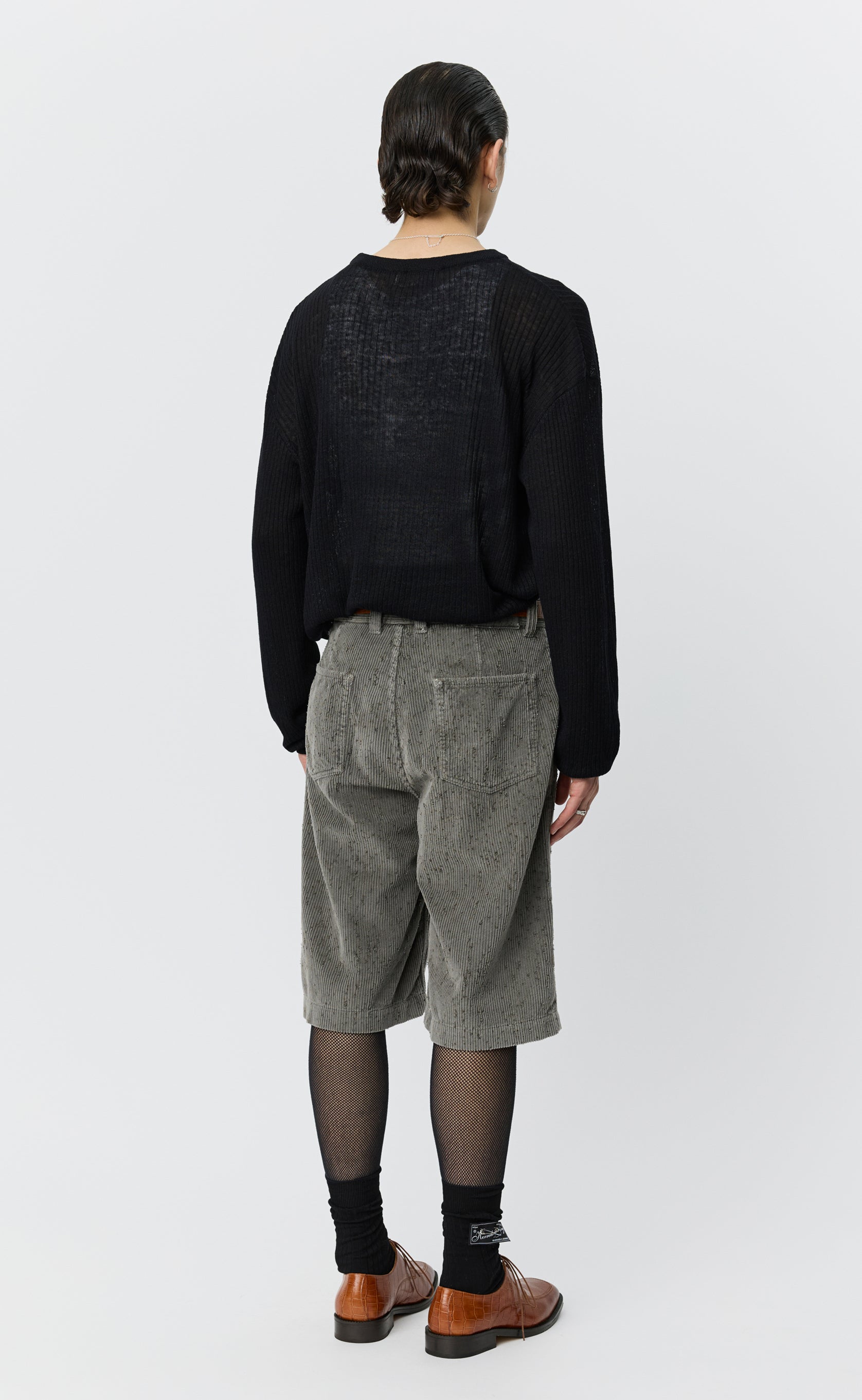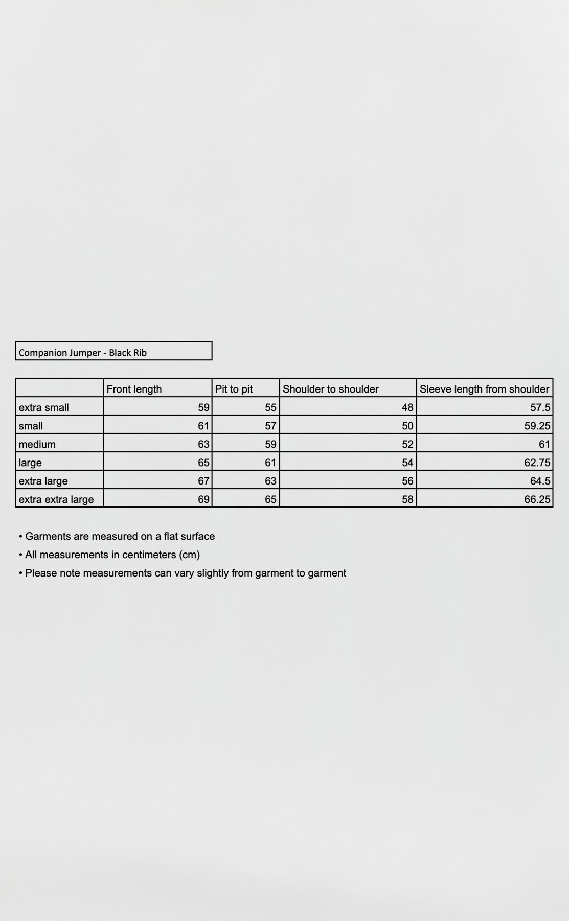 The Companion Jumper has a boxy fit with long sleeves and dropped shoulders. Knitted from a black linen blend yarn with a sheer 4x2 rib knit throughout and finished with a 1x1 rib at neckline, hem and cuffs.