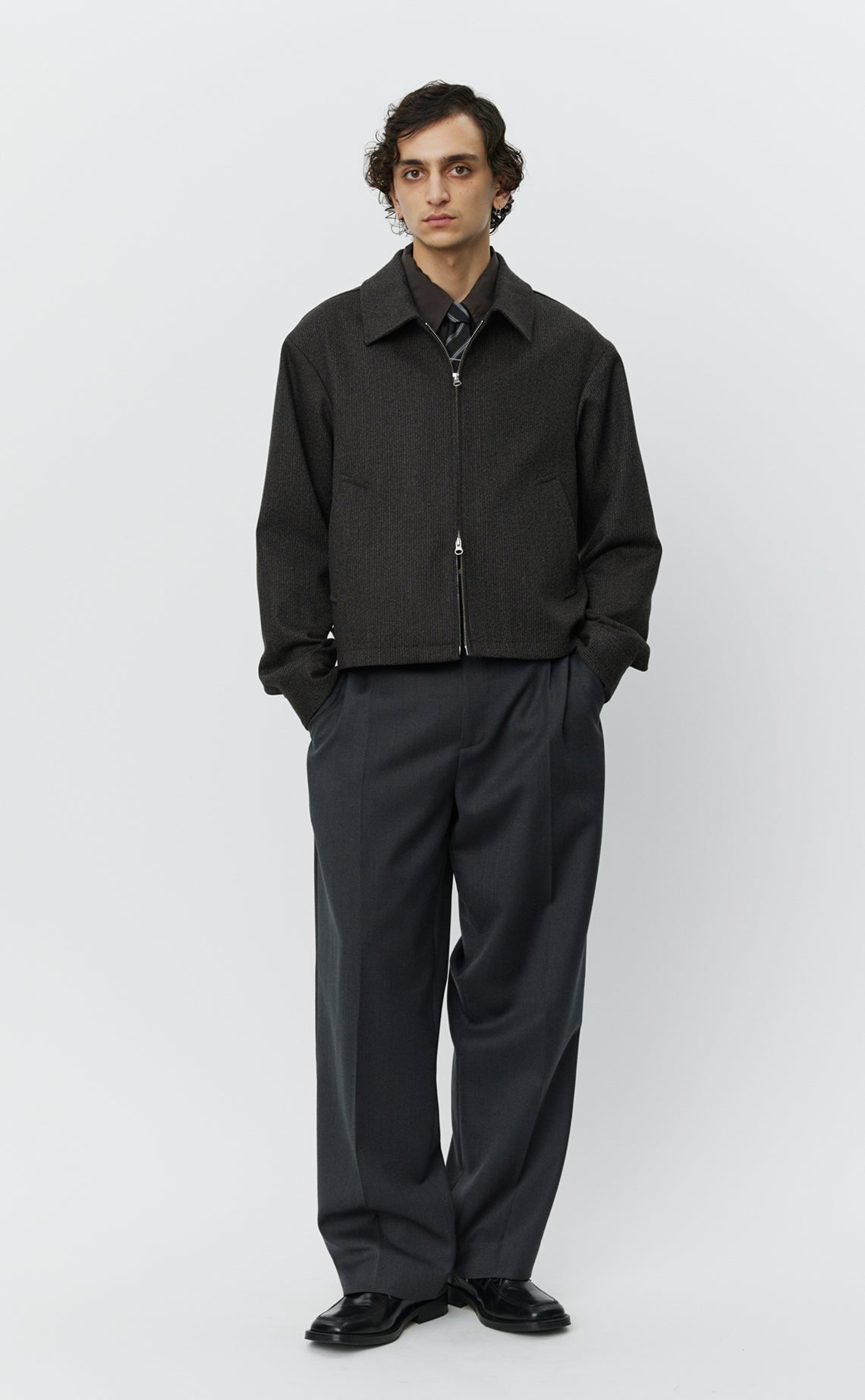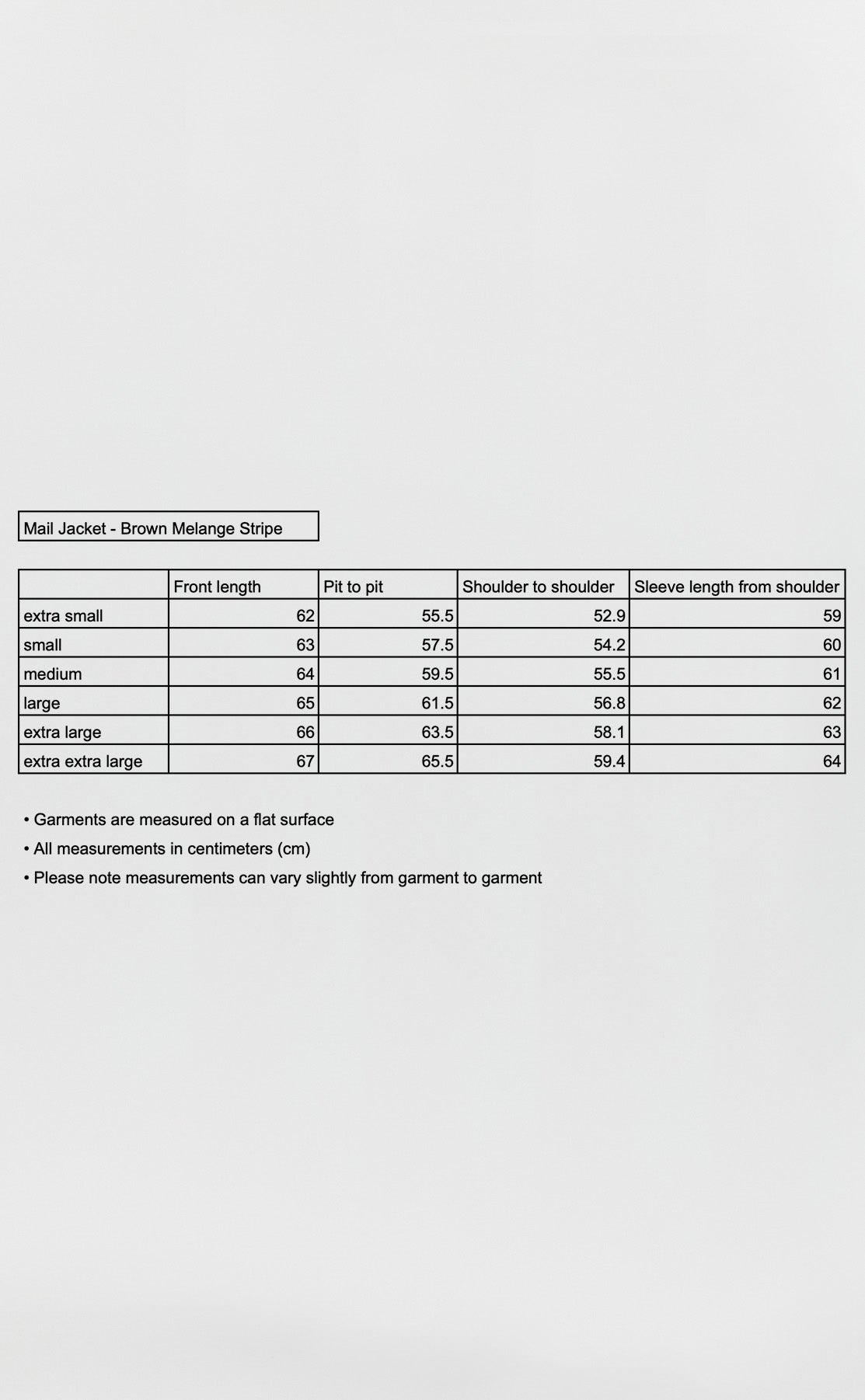 The Mail Jacket has a boxy fit with drop shoulders. Featuring two-way zip, side pockets, sleeve and front body lining and adjustable tabs at the waist. Cut from a deadstock cotton wool blend with brown and grey fibres creating a subtle speckled stripe on a dark ground.