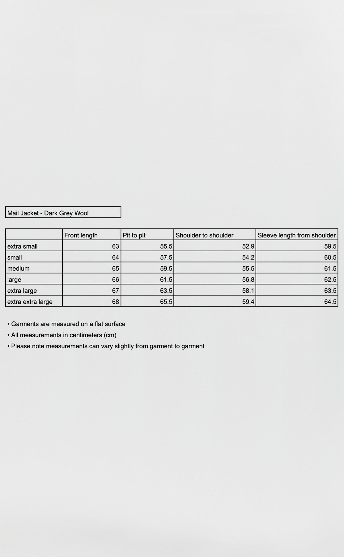 The Mail Jacket has a boxy fit with drop shoulders. Featuring two-way zip, side pockets, sleeve and front body lining and adjustable tabs at the waist. Cut from a dark grey deadstock wool with a subtle textural weave.