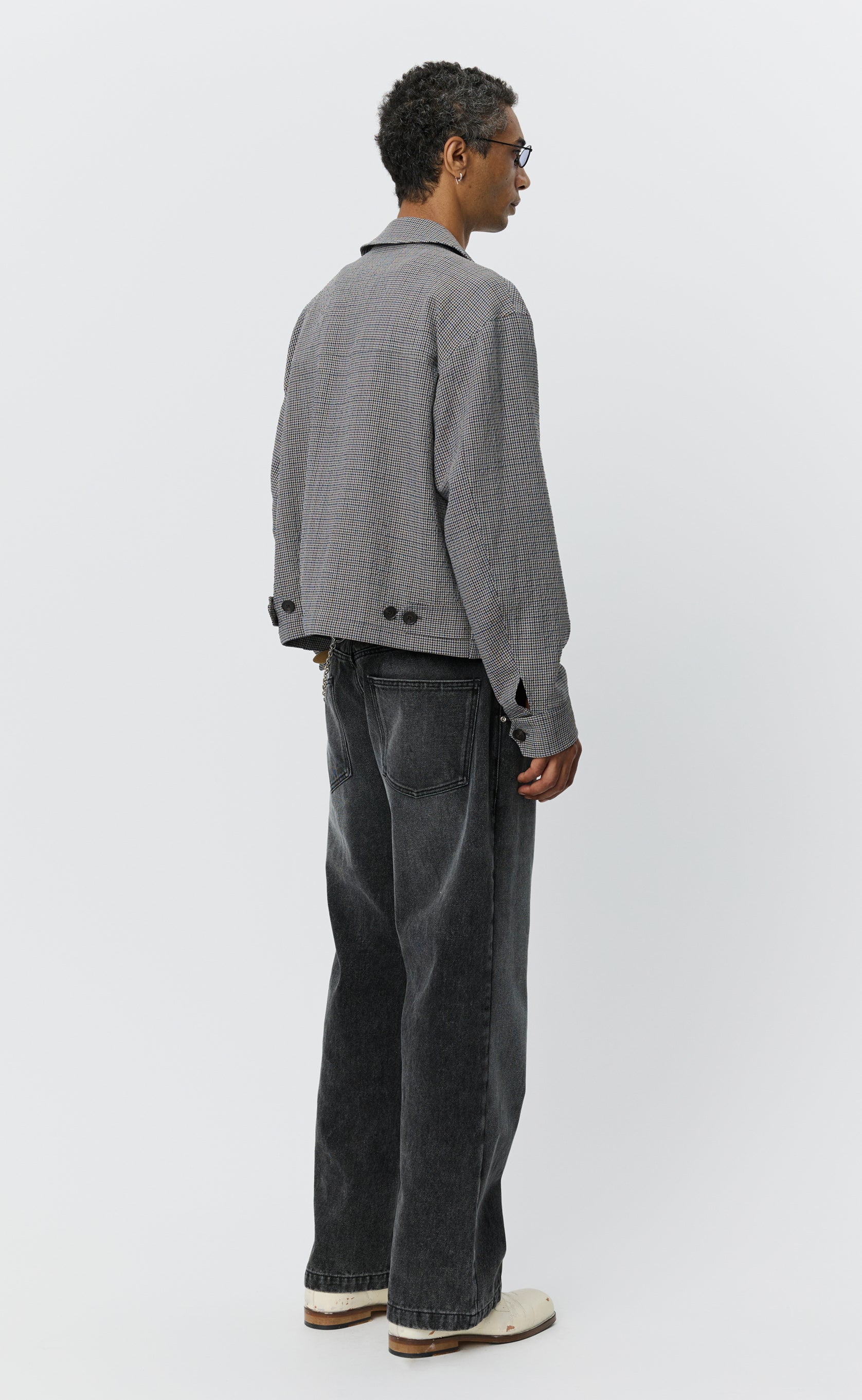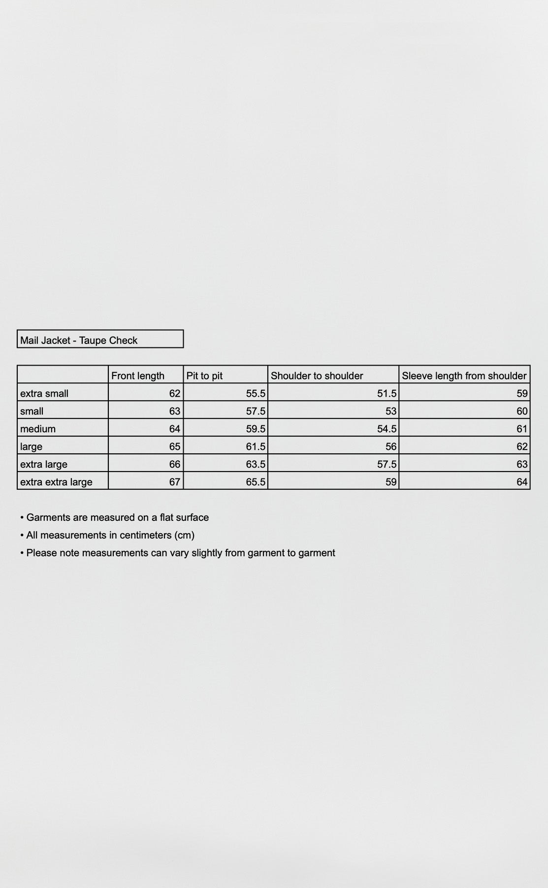 The Mail Jacket has a boxy fit with drop shoulders. Featuring two-way zip, side pockets, sleeve and front body lining and adjustable tabs at the waist and cuffs. Cut from a textured wool blend with a crepe touch, in a dark blue, black and brown fine check on a light grey ground.