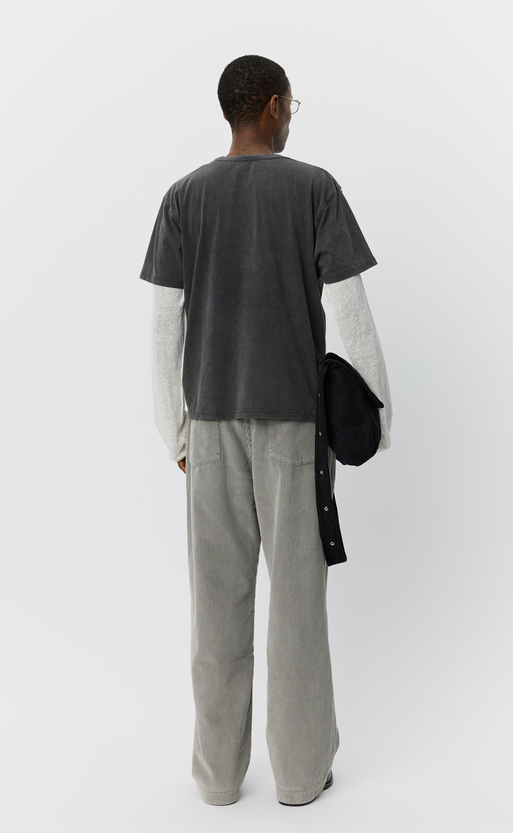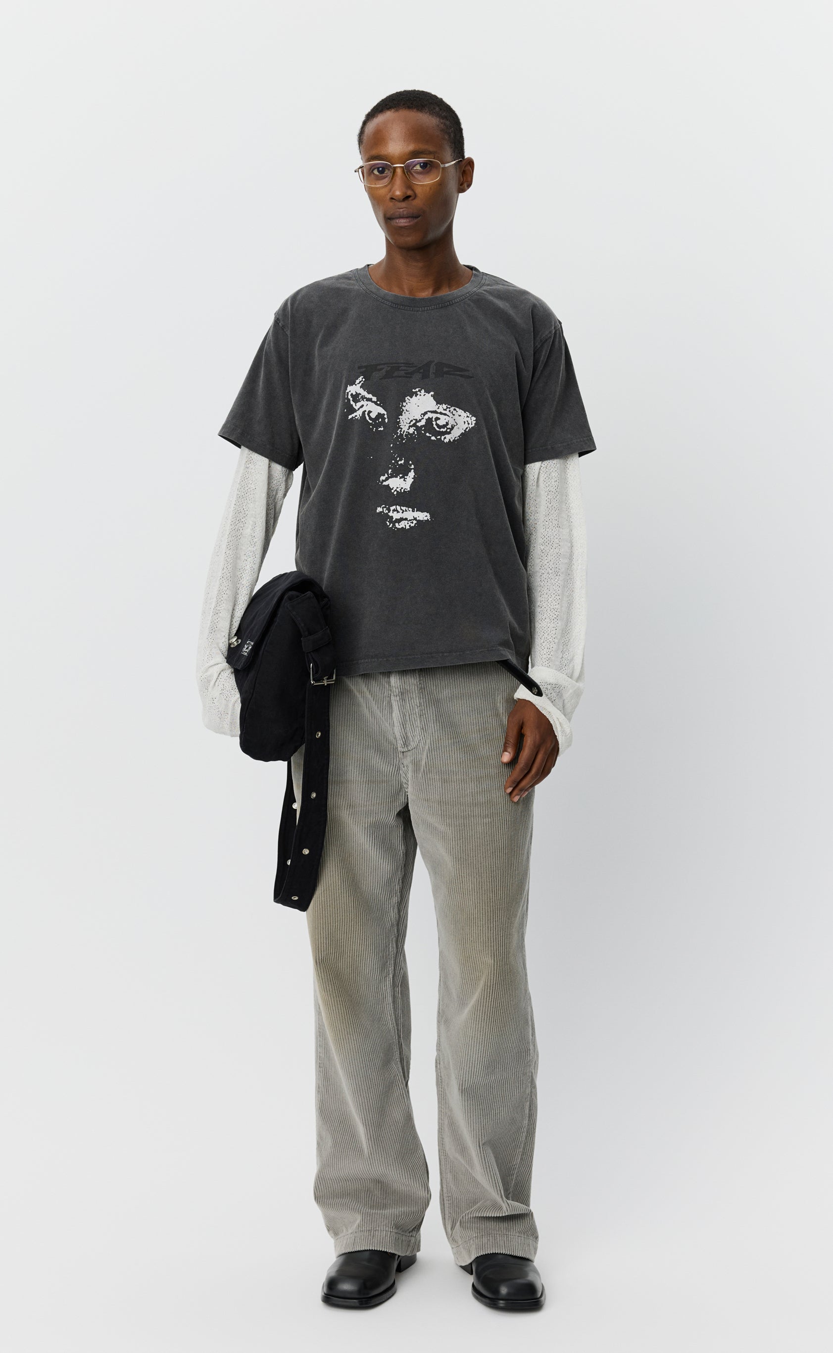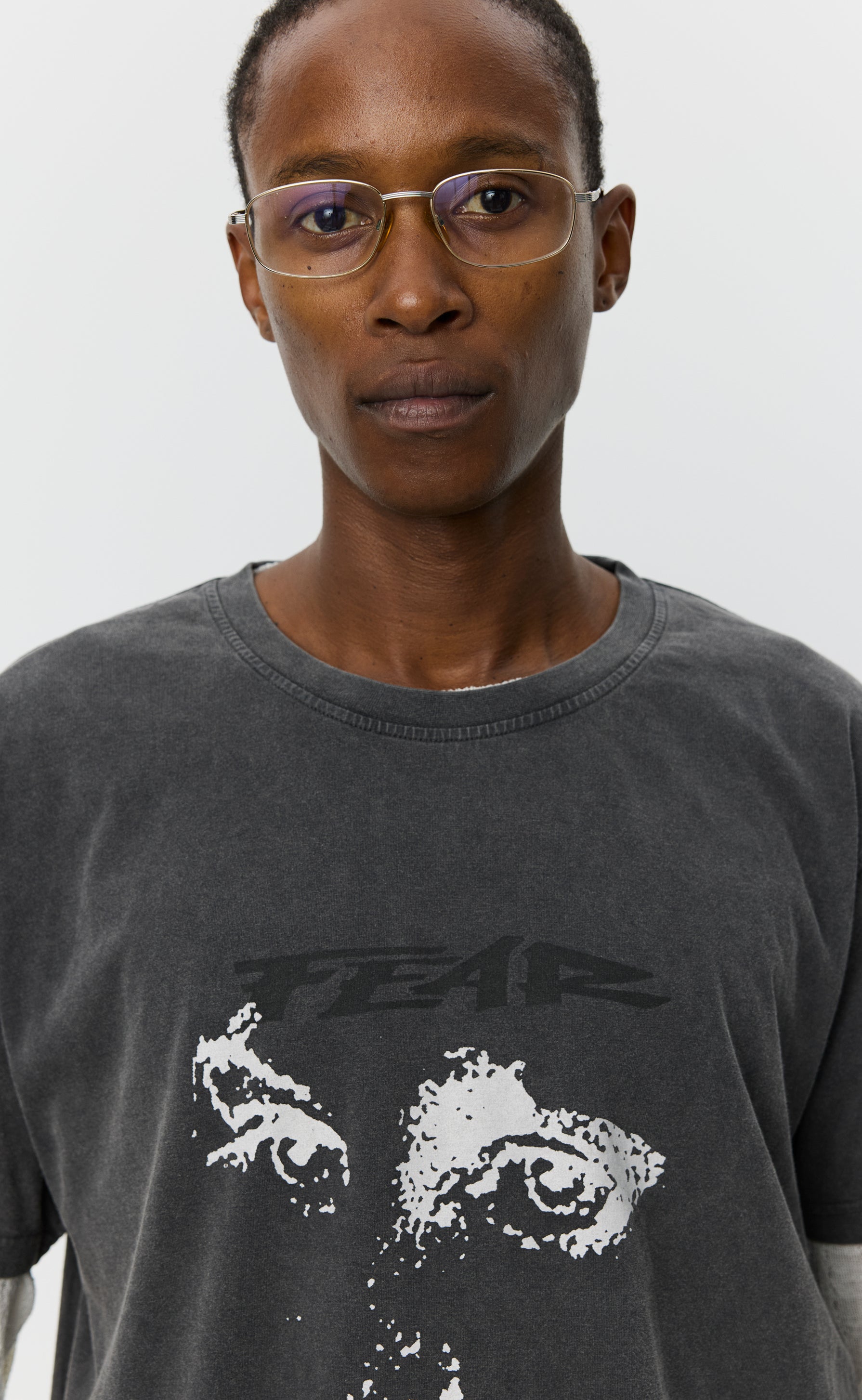 The Merch Tee has a boxy fit with a slightly cropped silhouette. Featuring fear print at centre front and ribbed crewneck collar. Cut from a garment dyed organic cotton jersey with a brushed surface in dark grey.