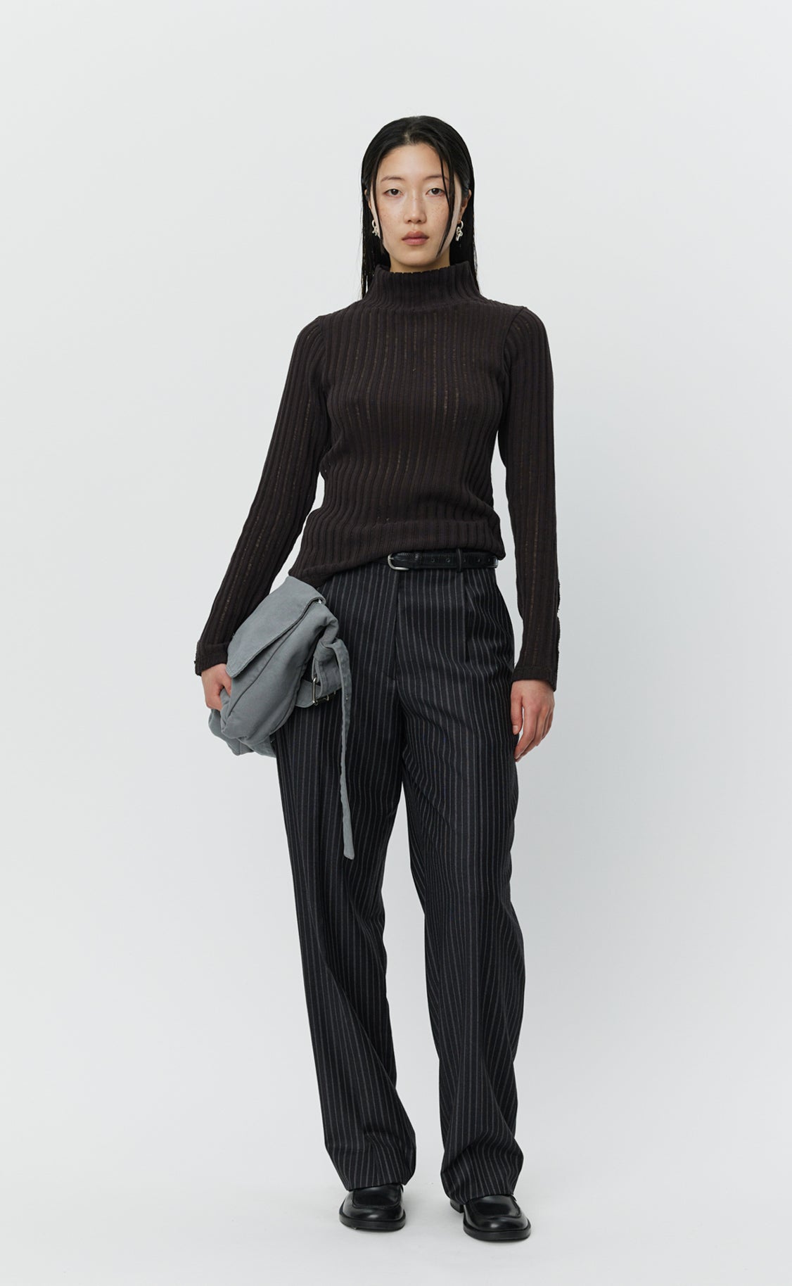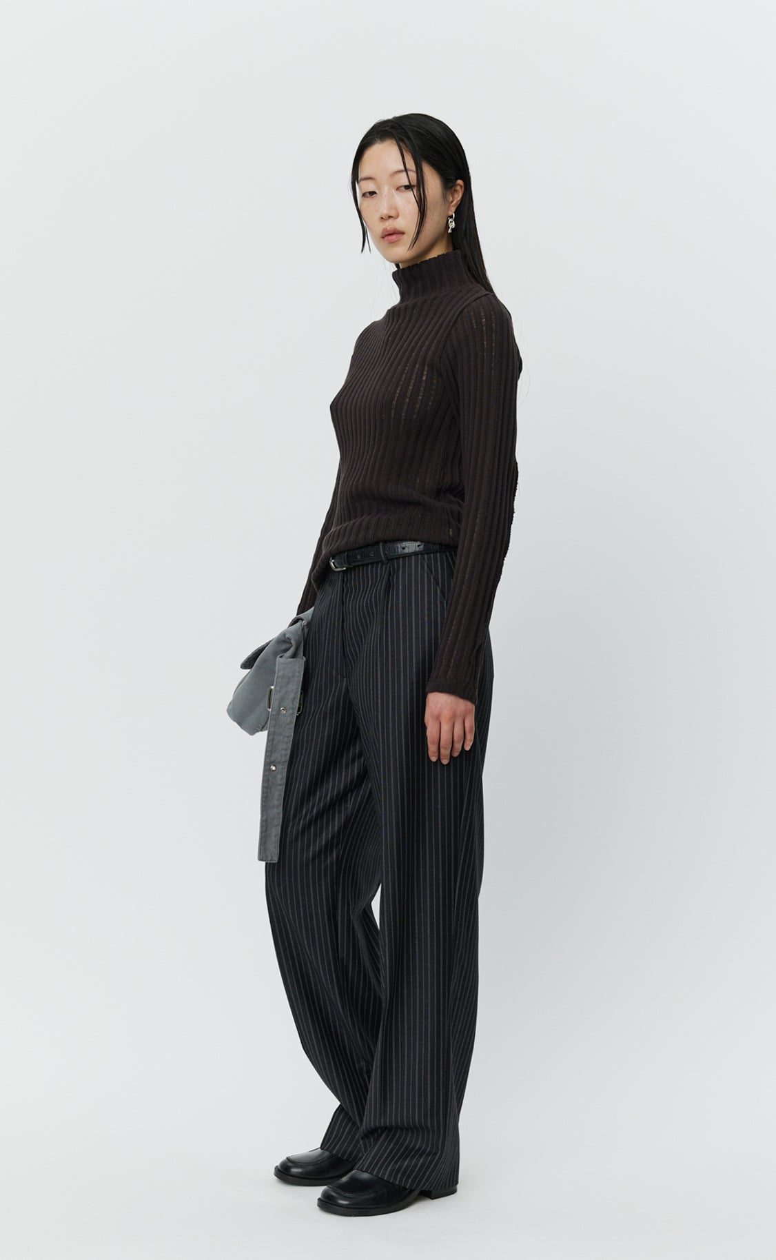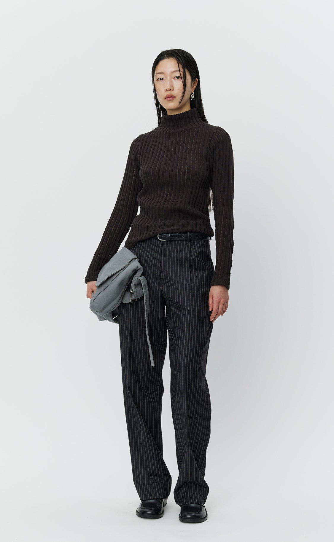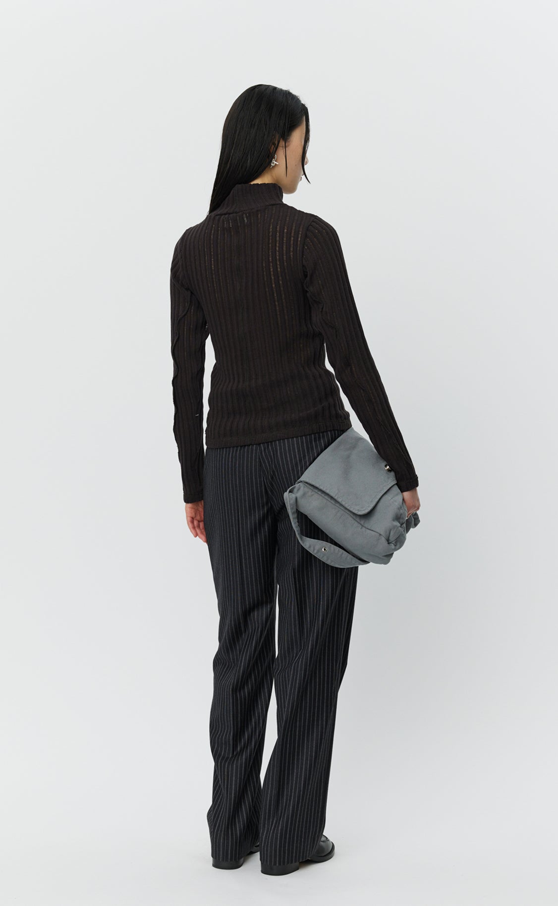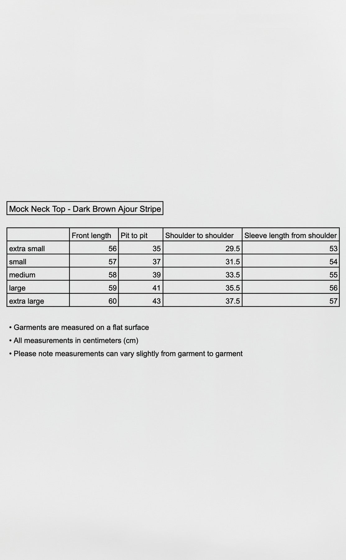 The Mock Neck has a slim fit with a high neckline and raw-edge finishing. Made with reverse flatlock seams on the sleeves and an overlocked seam down the centre of the back. Cut from a dark brown cotton blend in a 4x2 rib ajour knit, with vertical striping and semi-sheer ladder structure.