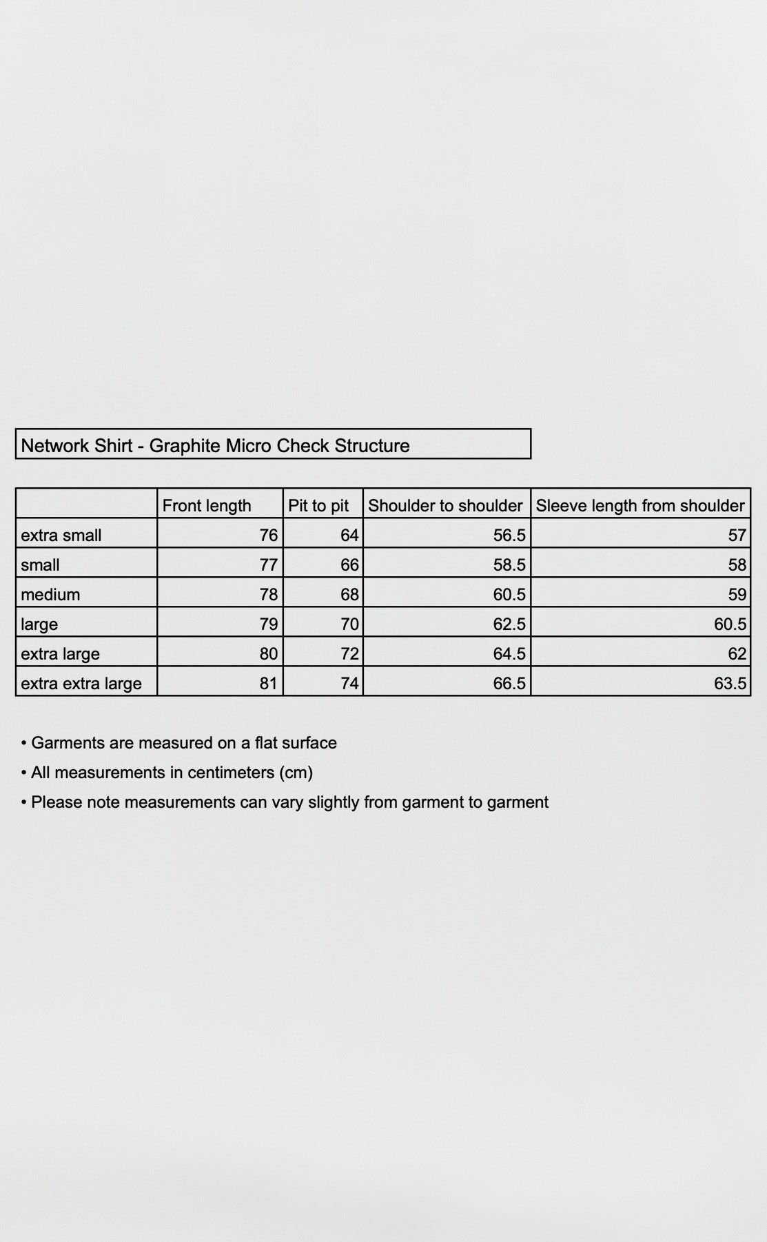 The Network Shirt has an oversized fit with drop shoulders and a rounded hem. Featuring a button placket, back yoke pleats and raw edged labels at end of both side seams in same fabric. Cut from a lightweight cotton with a smooth hand feel, in a dark grey micro structured tone on tone mini stripe.