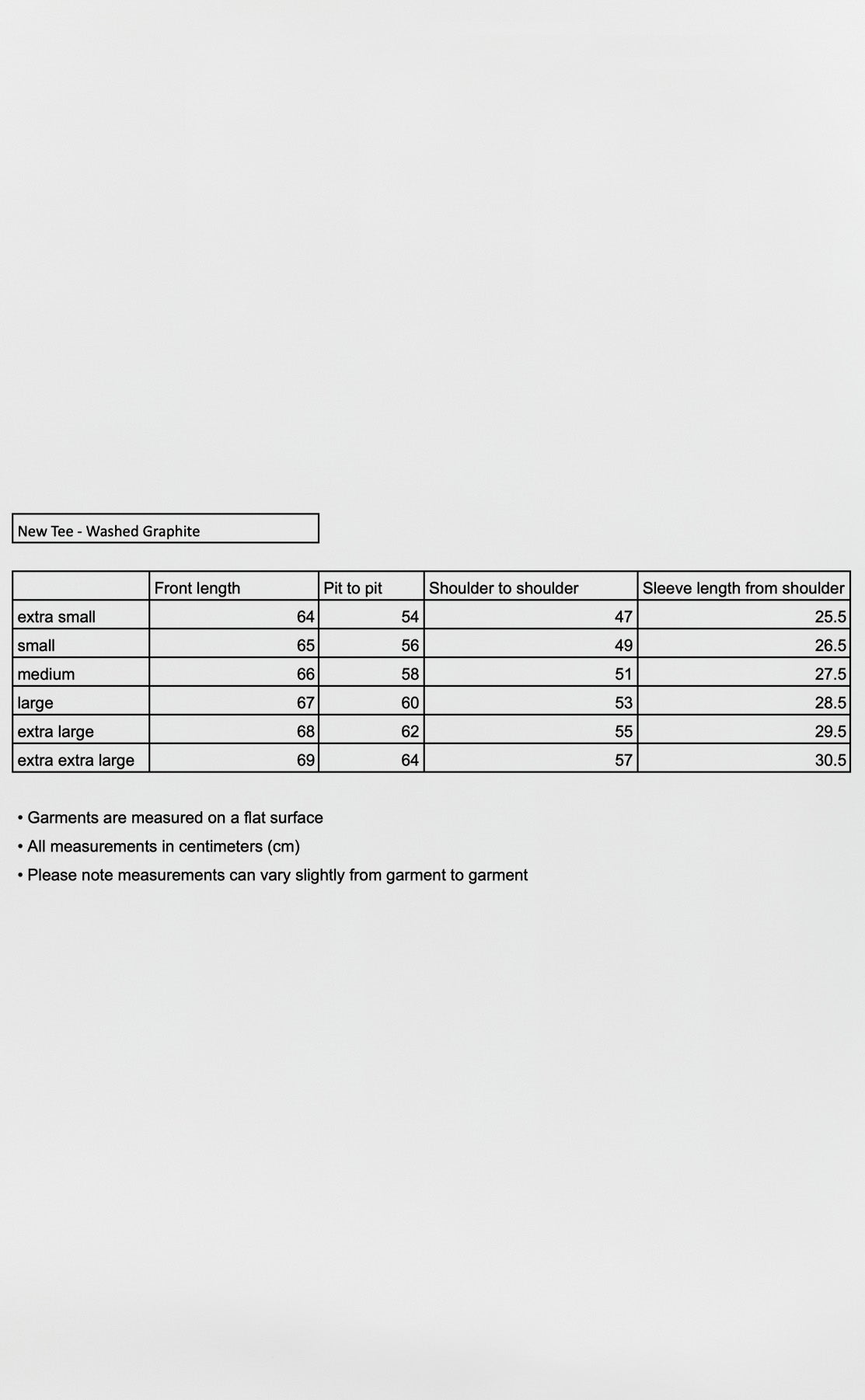 The New Tee has a boxy fit with a slightly cropped silhouette. Cut from a garment dyed organic cotton jersey in a washed dark grey.
