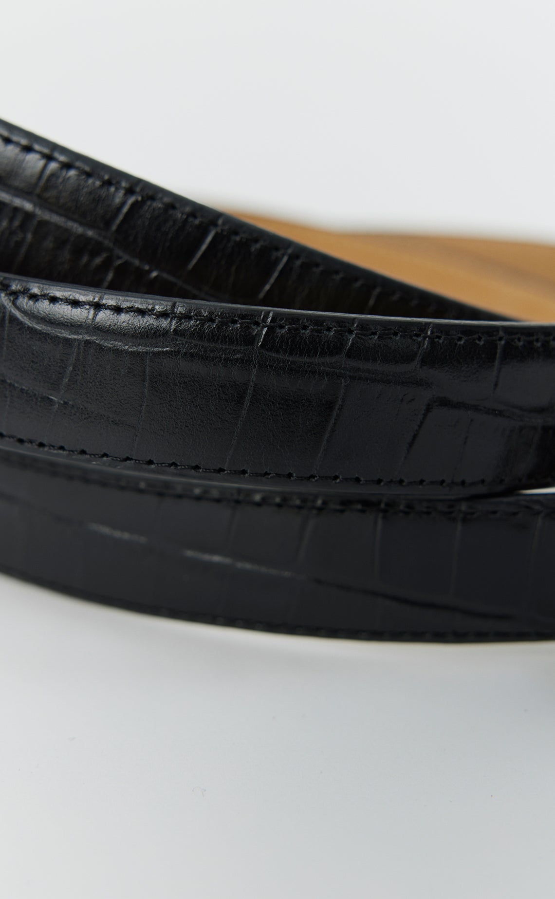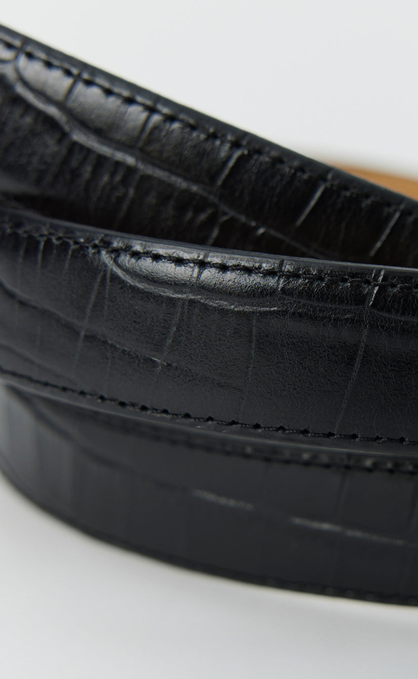 The Occasion Belt measures 115 cm long and 2,5 cm wide. Crafted from a black crocodile-embossed leather with a natural backing. Features a rounded silver buckle with a brushed finish and hand-painted edges. Made from Portuguese leather.