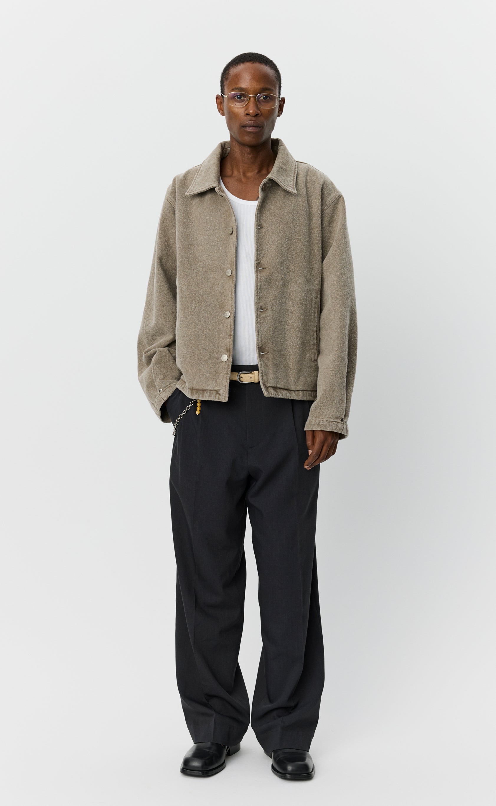 The Painters Jacket has a relaxed fit with drop shoulders. Featuring spread collar, side welt pockets, metal button closure and flower rivets at sleeves and side seams. Cut from a soft mineral dye washed organic cotton denim with a brushed surface in a light brown.
