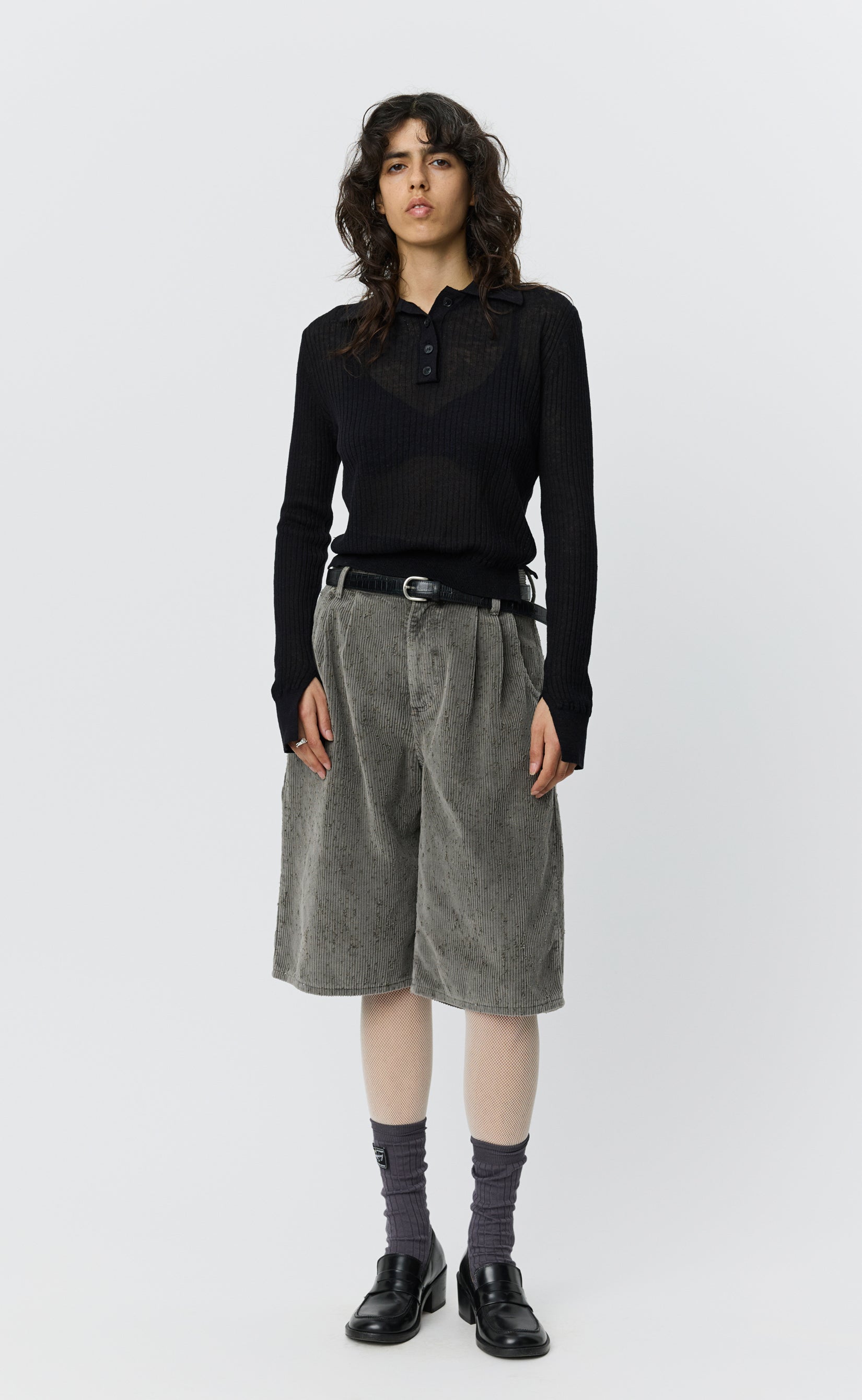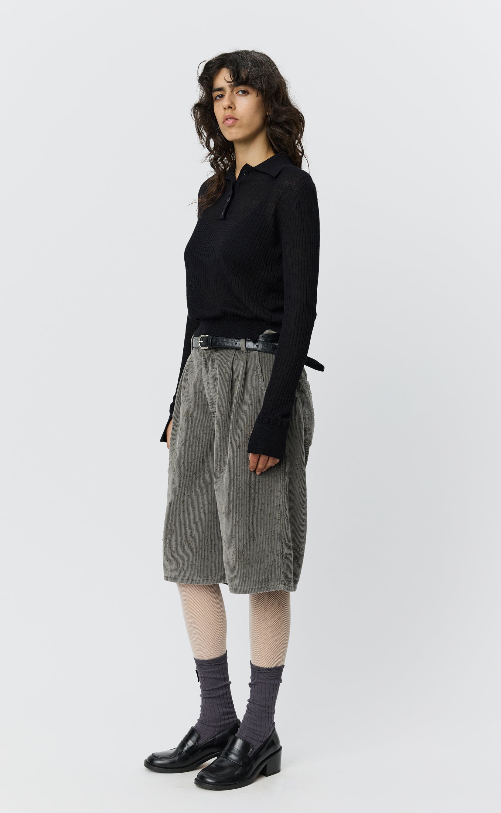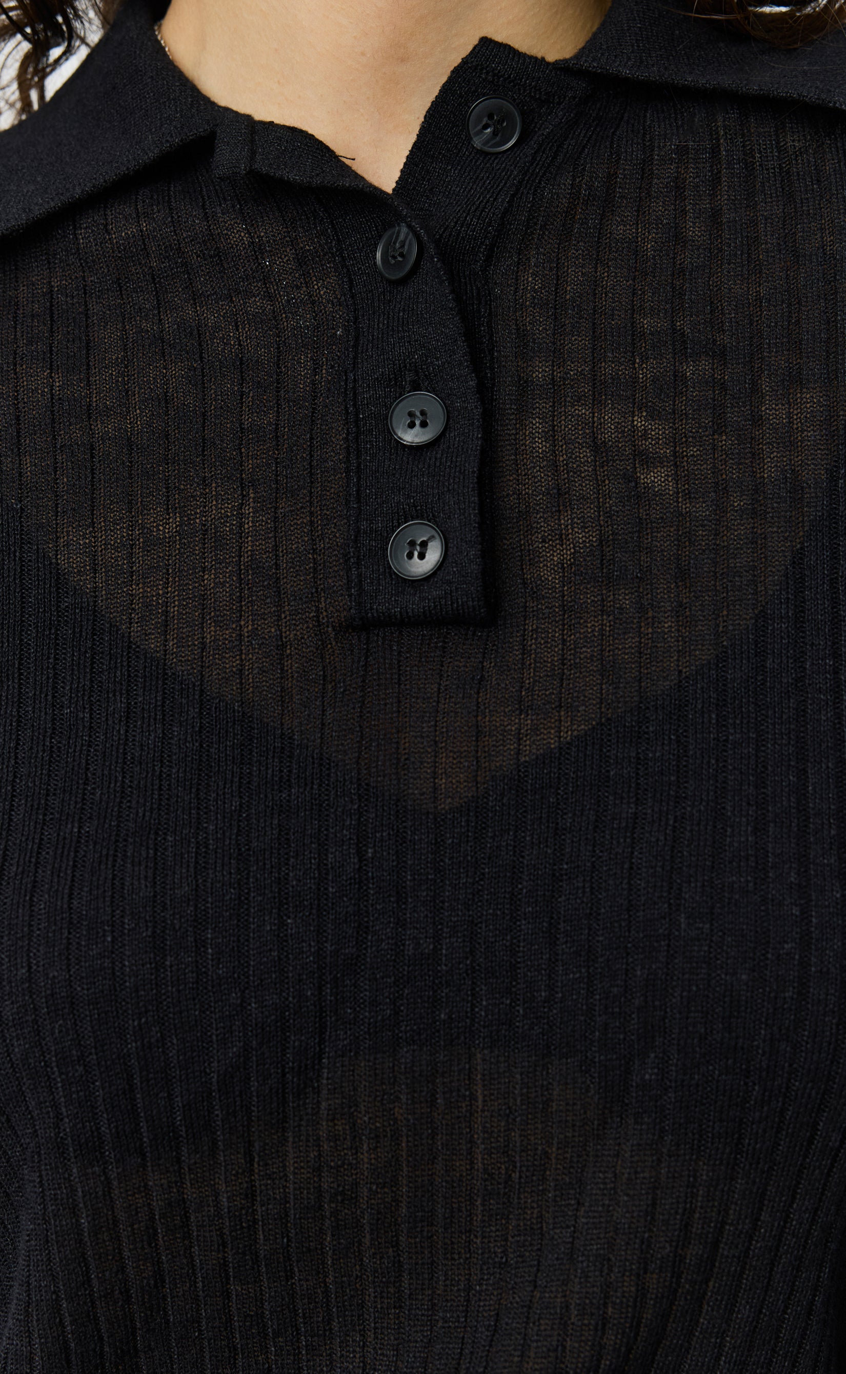 The Partial Placket Polo has a slim fit with a slits in the hem rib. Featuring a soft pointed collar, quarter placket and slits at the sleeve hems. Knitted from a black linen blend yarn with a sheer 4x2 rib knit throughout and finished with a 1x1 rib at neckline, hem and cuffs.
