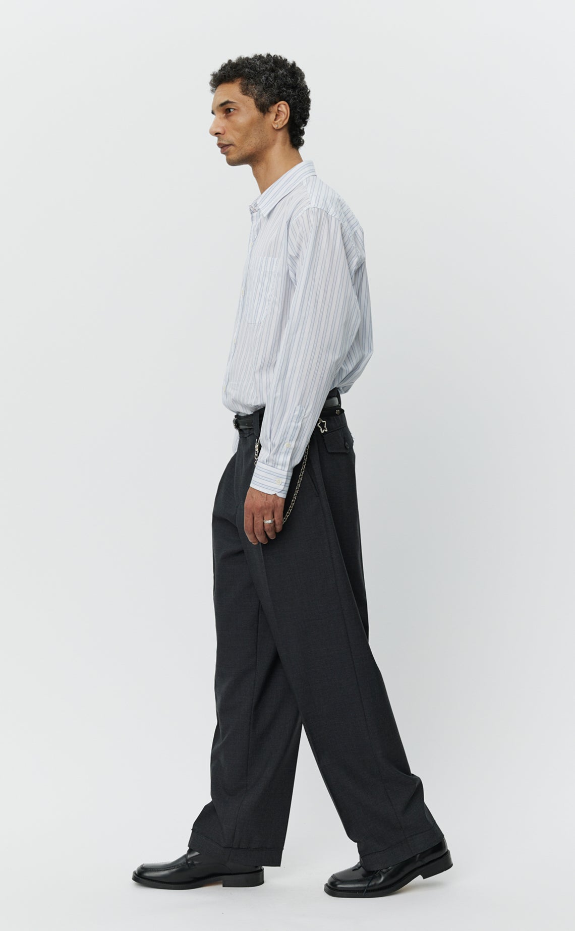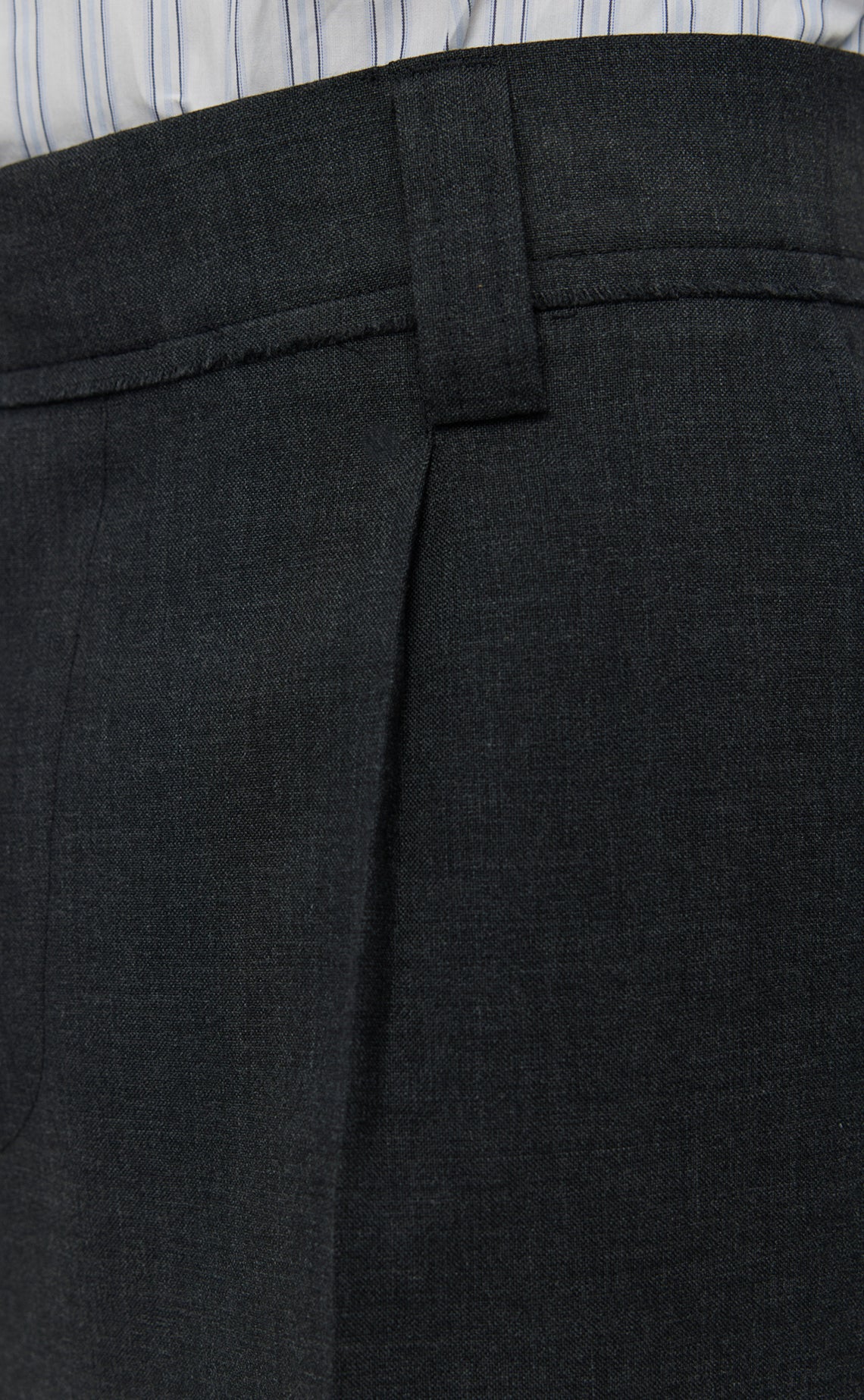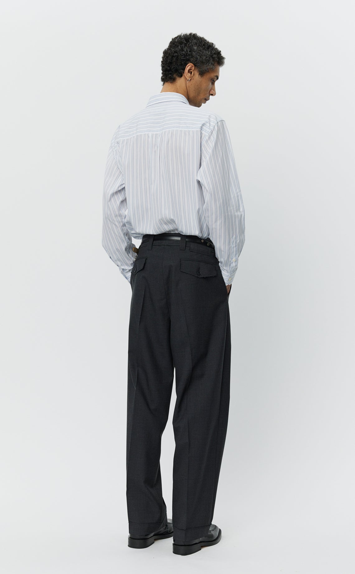 The Patch Trousers has a wide straight fit with single pleats and a mid-rise. Featuring side pockets, rear flap pockets, cuffed hem, button fastening, hook-and-eye closure, YKK zip fly and raw edged details. Cut from a worsted deadstock wool with a dry hand feel and subtle two-toned weave in dark grey.