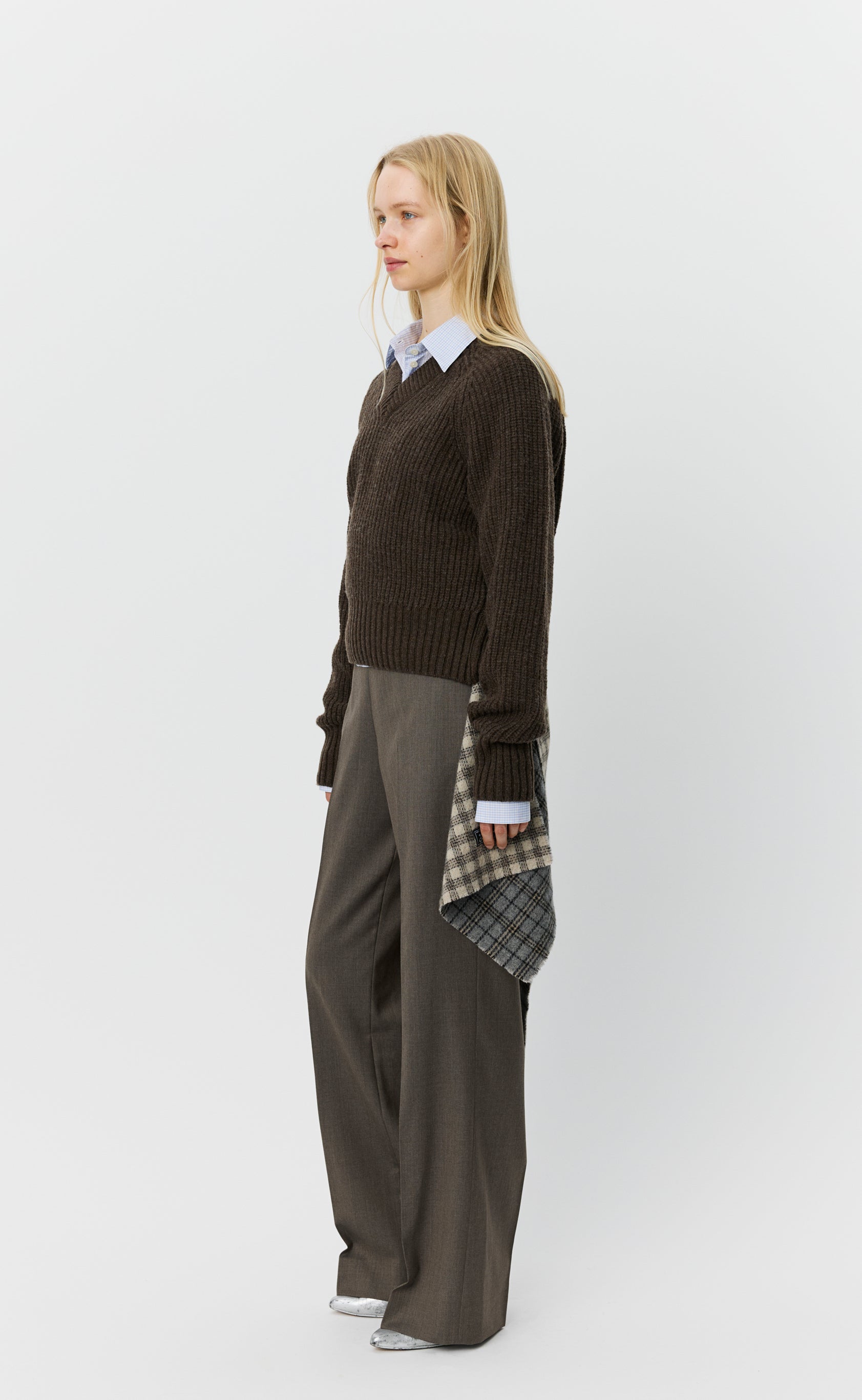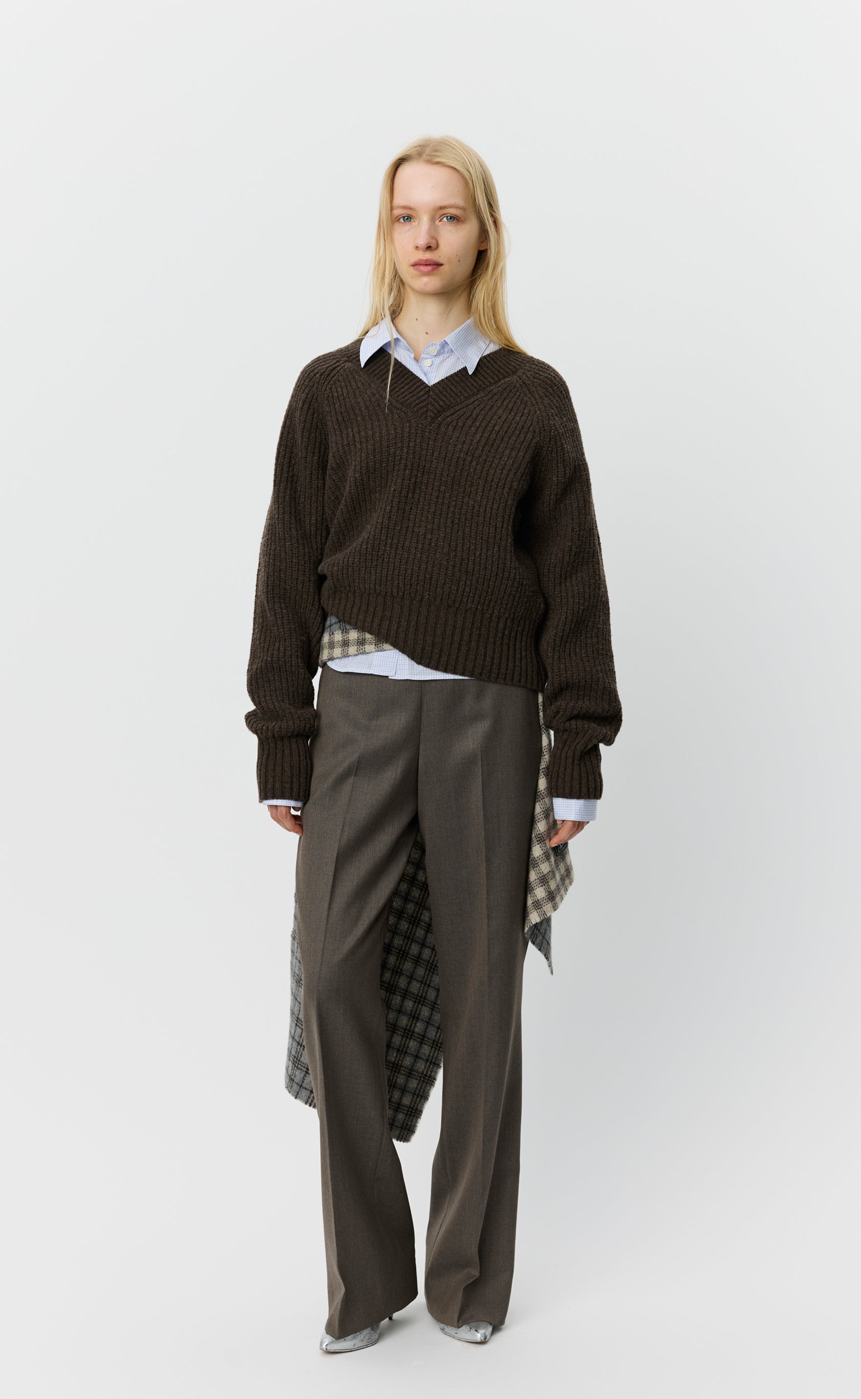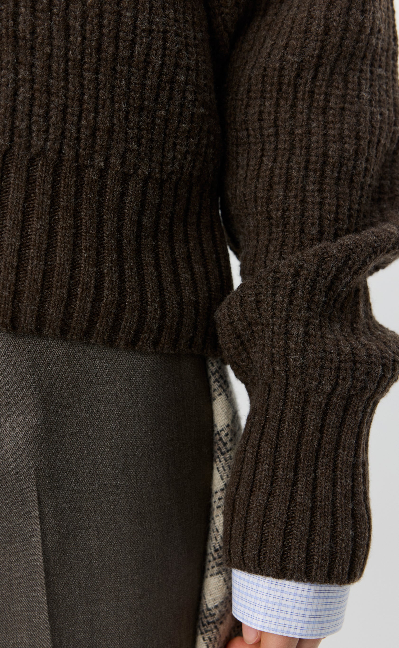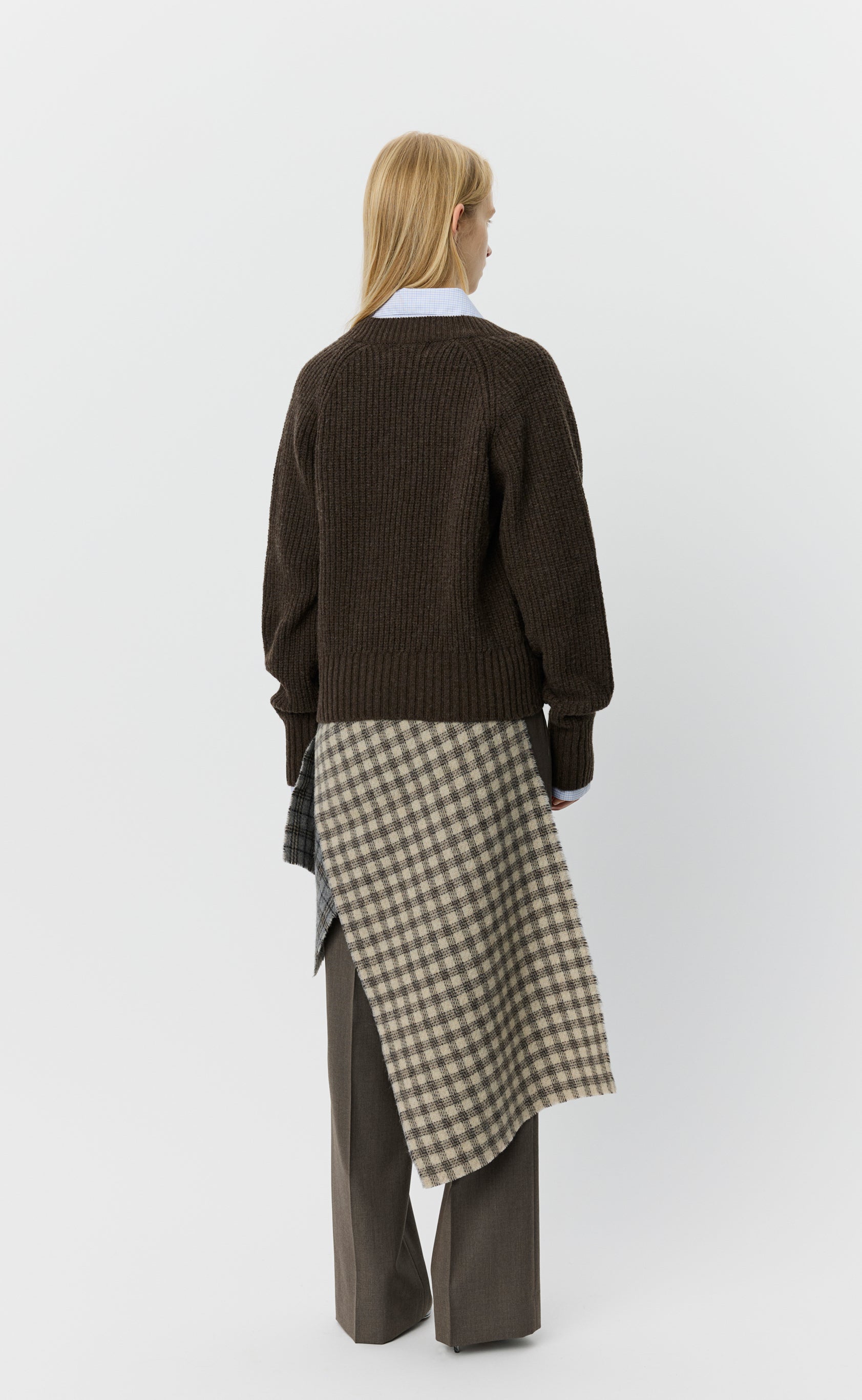 The Plaza V-Neck has a relaxed fit with raglan sleeves. Knitted from a soft dark brown wool, with a 1x1 rib throughout and finished with 2x2 rib at collar, hem and cuffs.