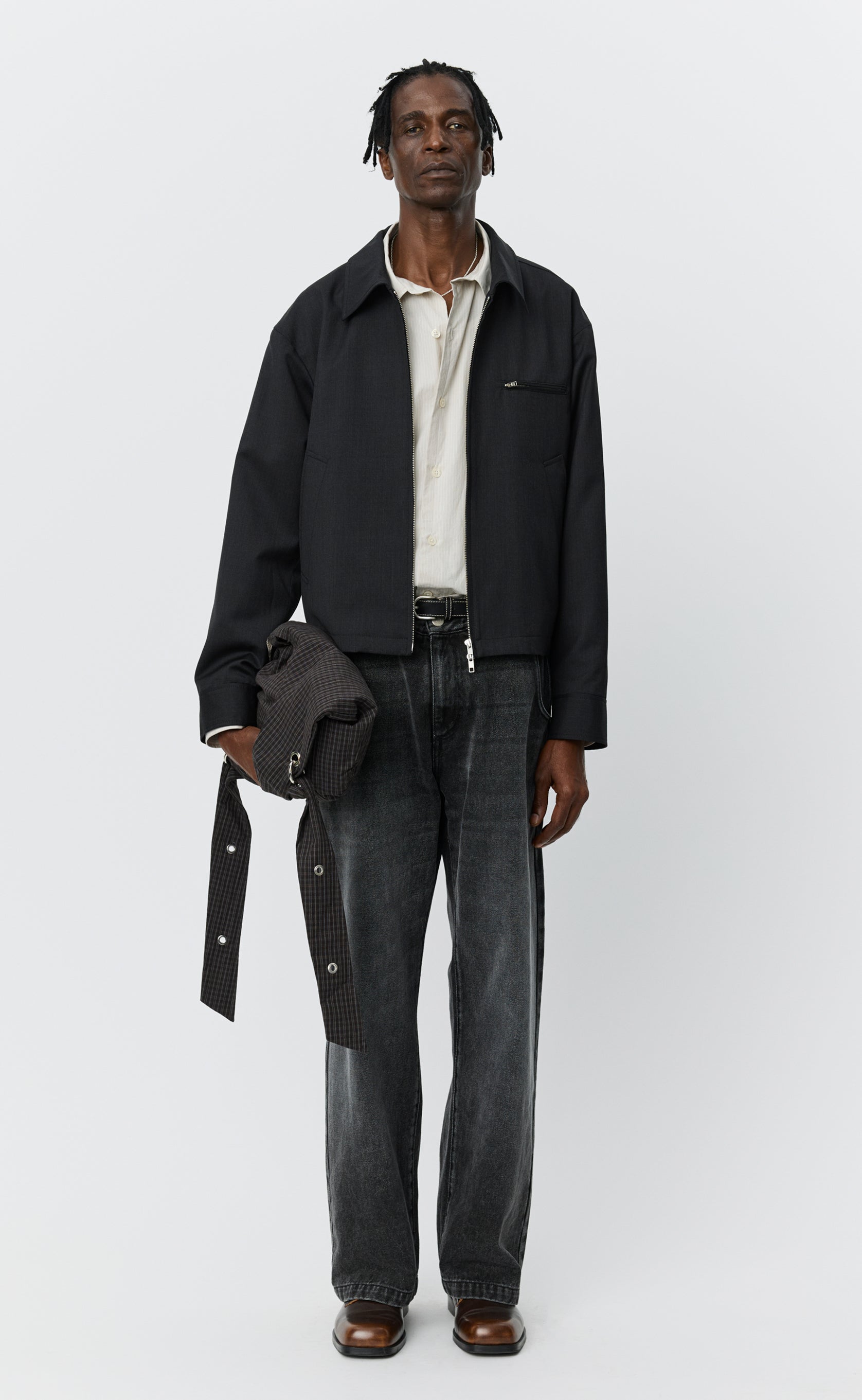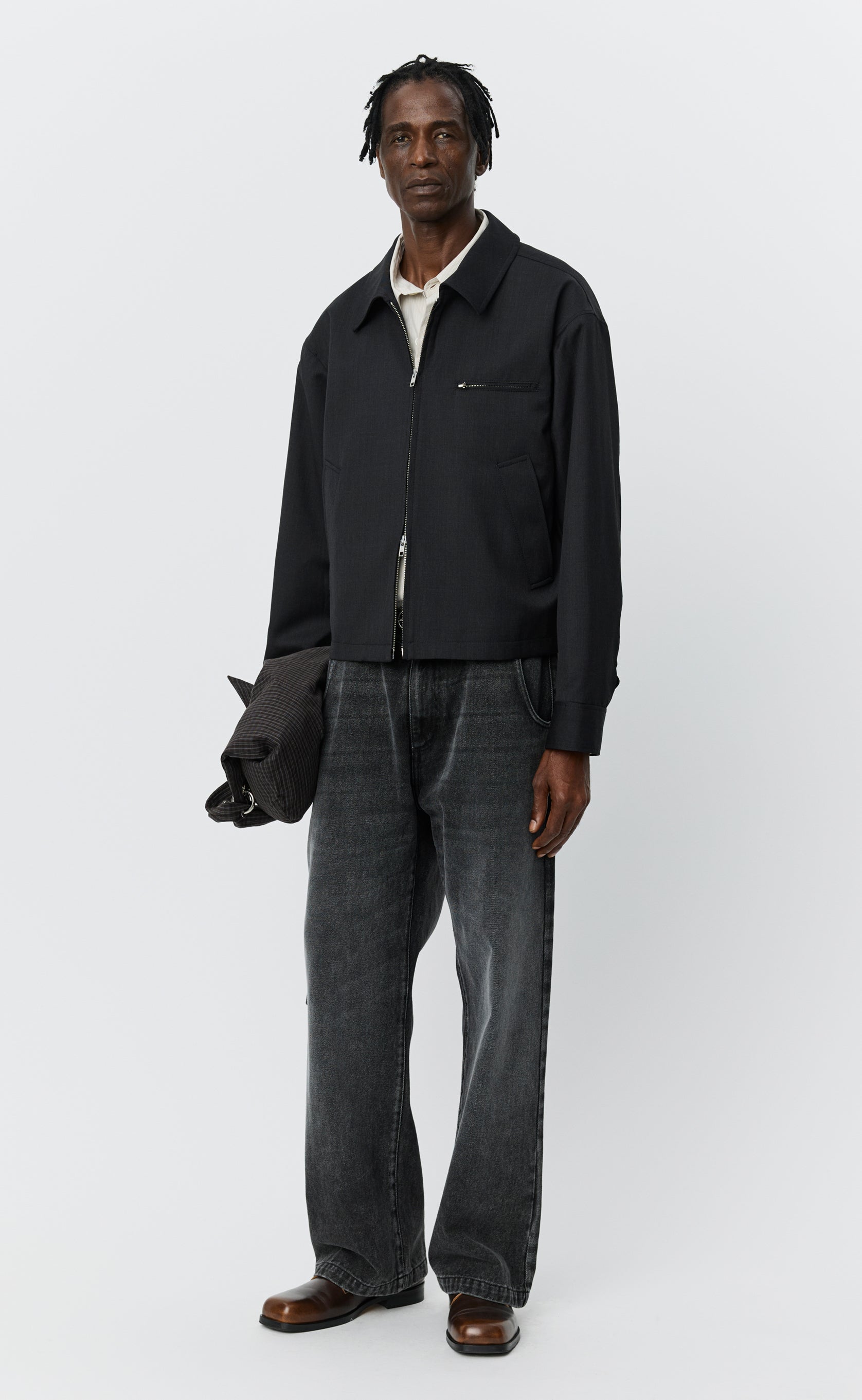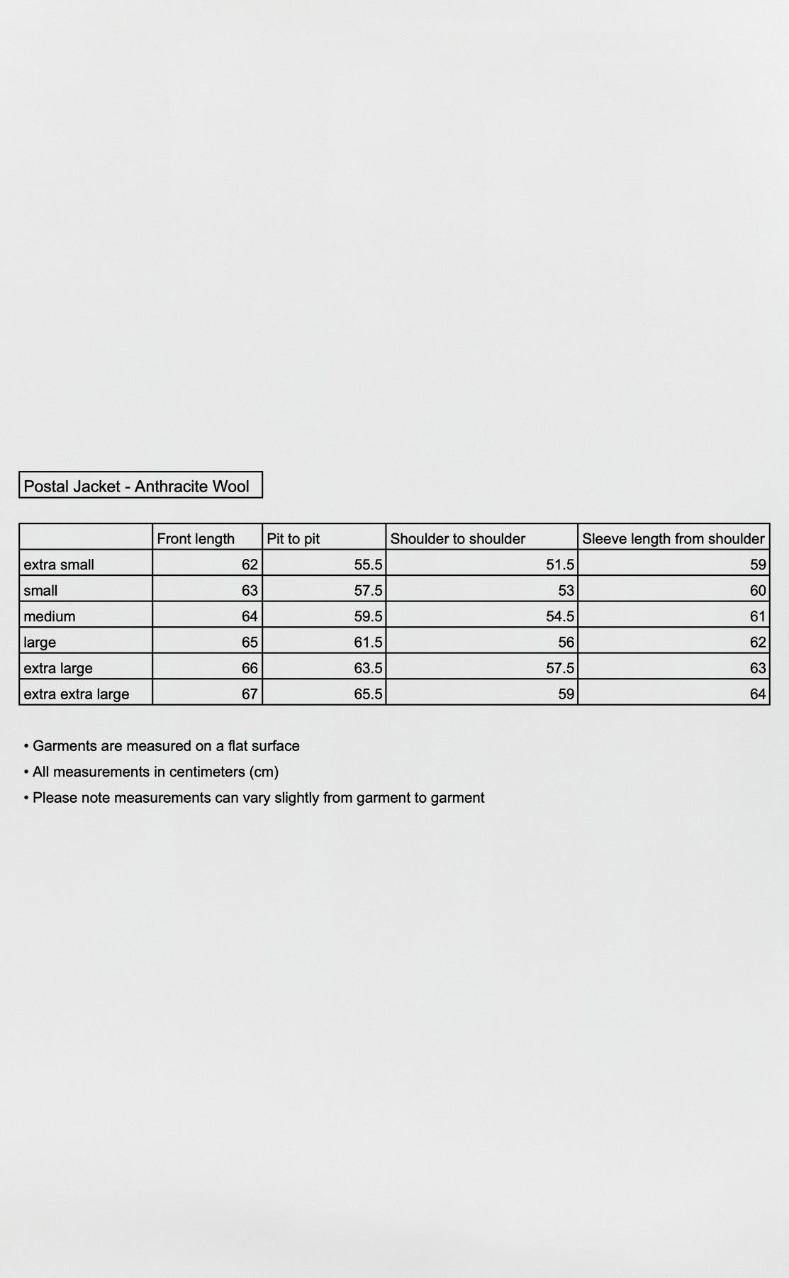 The Postal Jacket has a boxy fit with drop shoulders. Featuring a two-way zip, side pockets, internal pocket, zip chest pocket, half lining and adjustable tabs at the waist and cuffs. Cut from a lightweight wool with a soft hand feel and a subtle two-toned weave in dark grey.