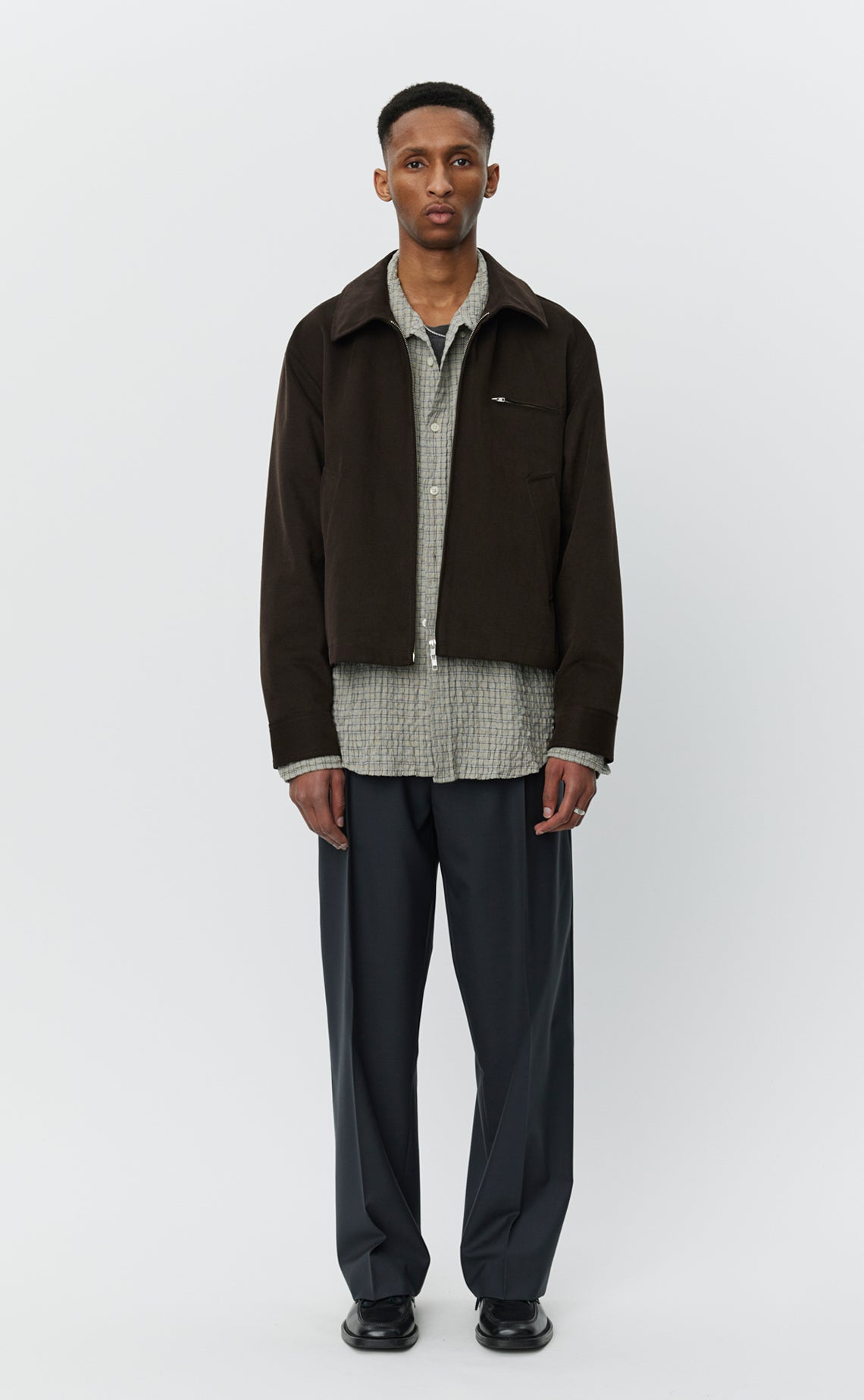 The Postal Jacket has a boxy fit with drop shoulders. Featuring two-way zip, side pockets, internal pocket, zip chest pocket, half lining and adjustable tabs at the waist and cuffs. Cut from a brushed cotton twill with a velvet hand feel, in dark brown.