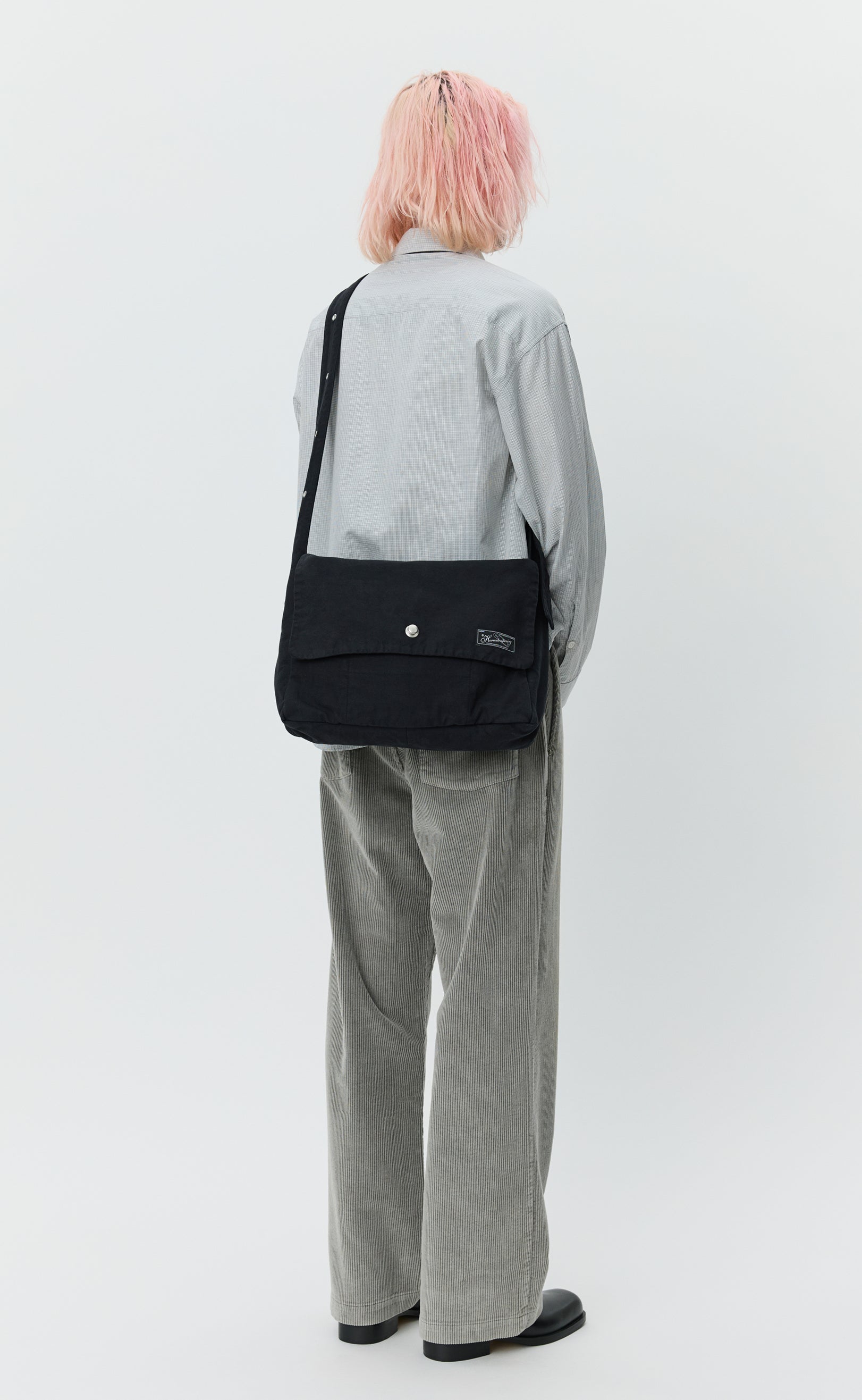 The Postman Bag has one main compartment with an inner zip pocket and a front flap closure. Featuring an adjustable shoulder strap and a woven mfpen herreekvipering label. The flap closure features a marine-grade snap button, originally developed for sails. Constructed from a durable washed black canvas.