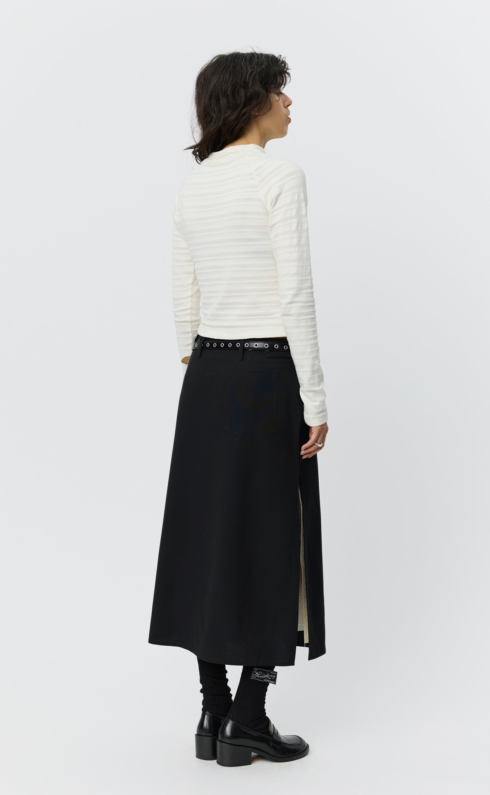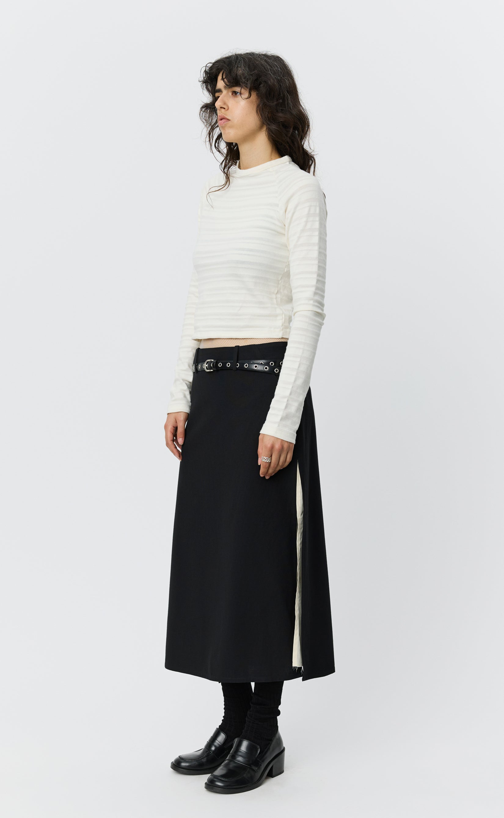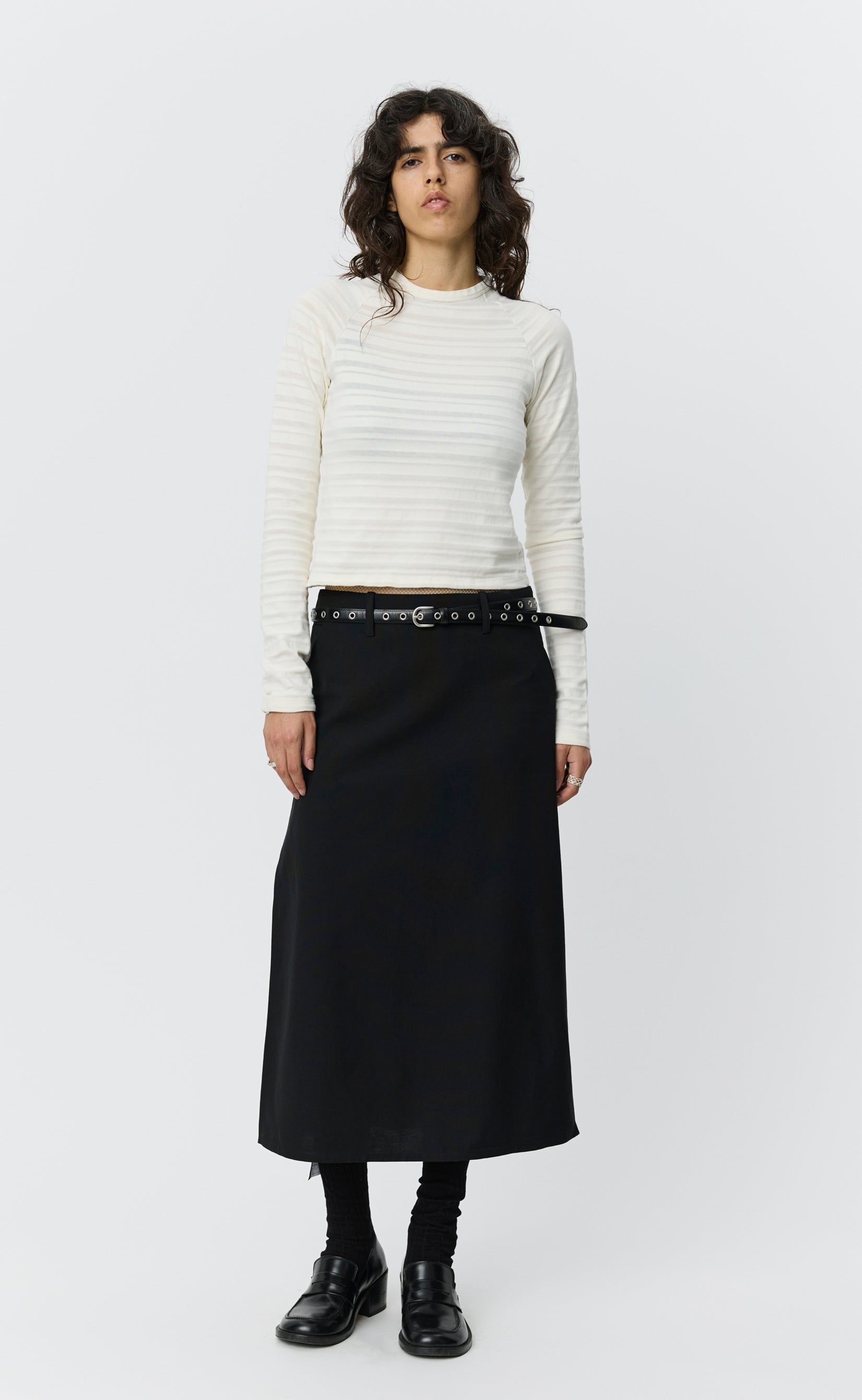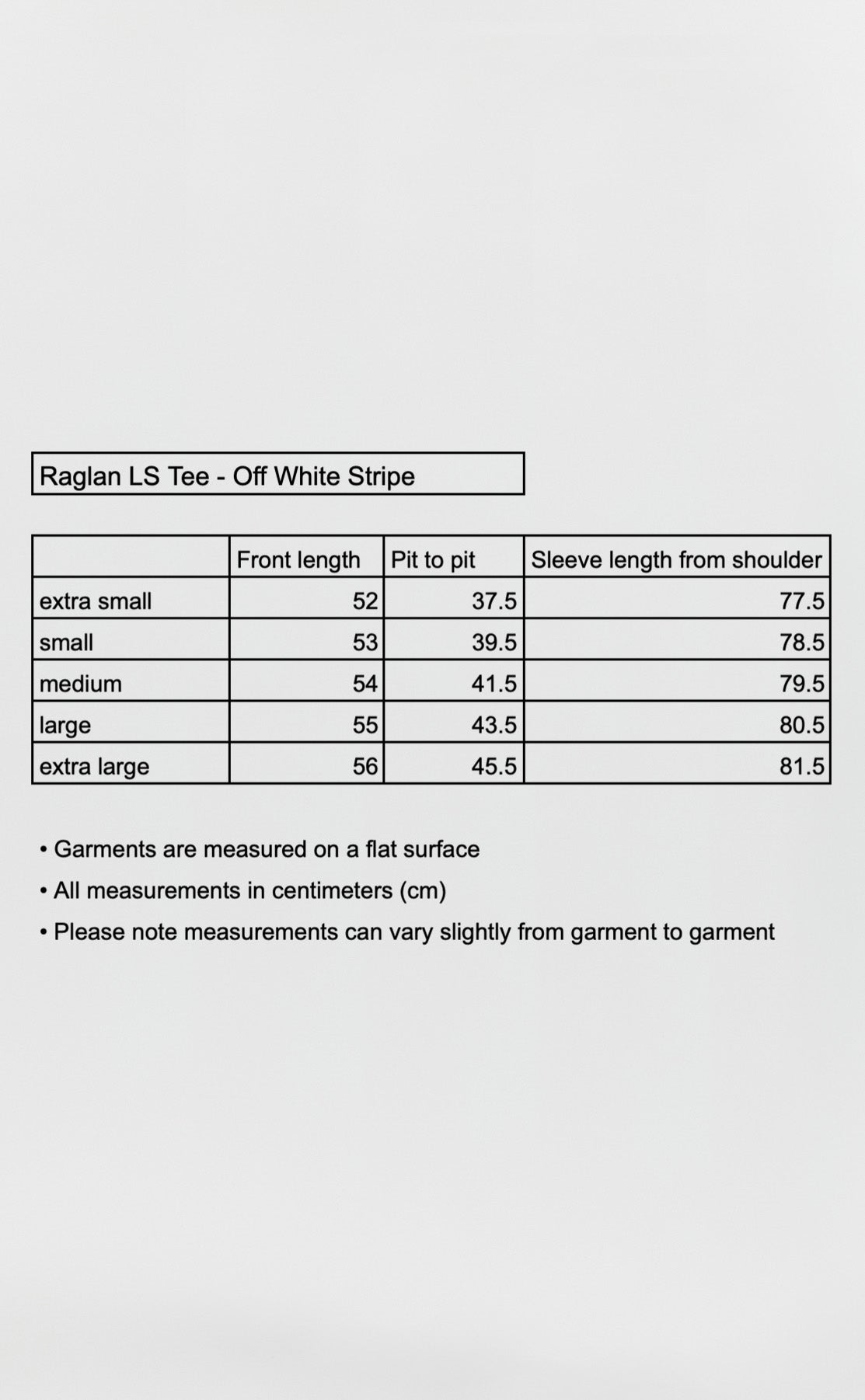 The Raglan LS Tee has a slim cropped fit with raglan sleeves. Cut from a soft cotton with a semi-sheer horizontal tonal stripe in bone white.