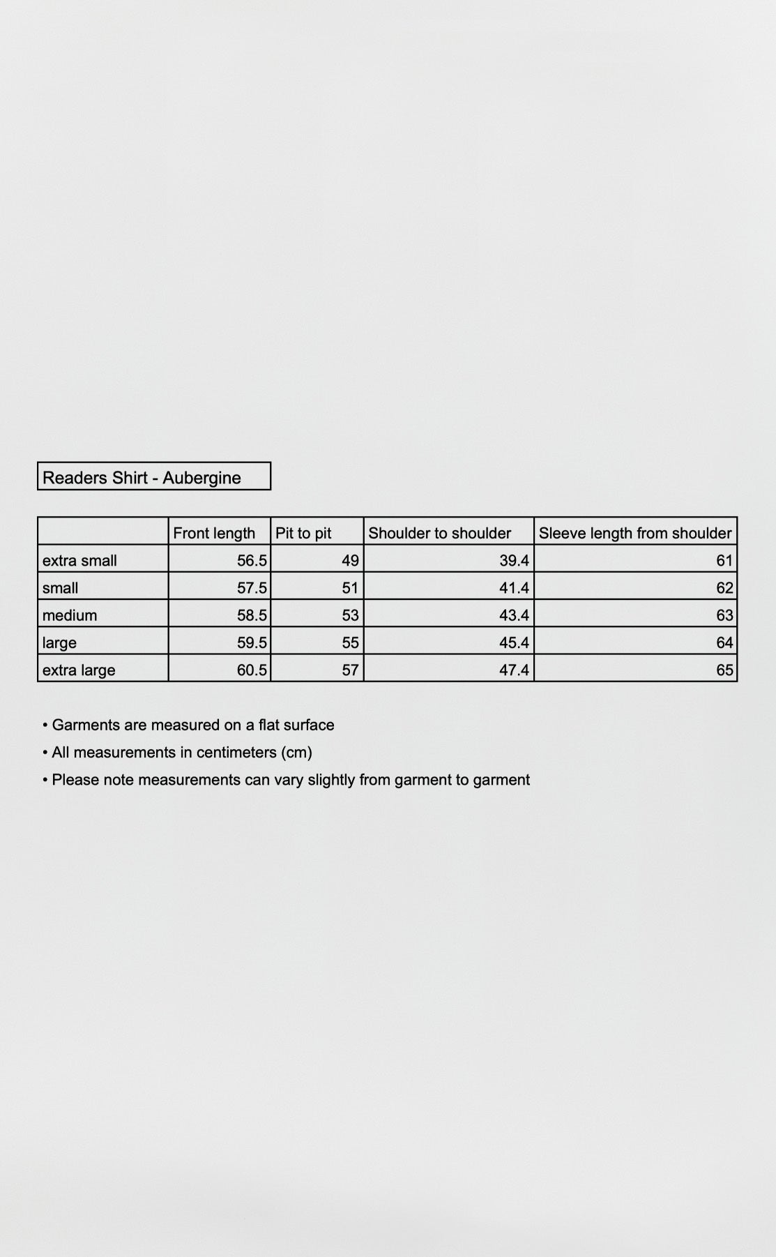 The Readers Shirt has a slim cropped fit with a curved hem. Featuring a button placket, spread collar, back yoke and contour panels at front and back. Cut from a garment washed, mid weight deadstock cotton twill with a smooth hand feel in deep aubergine.