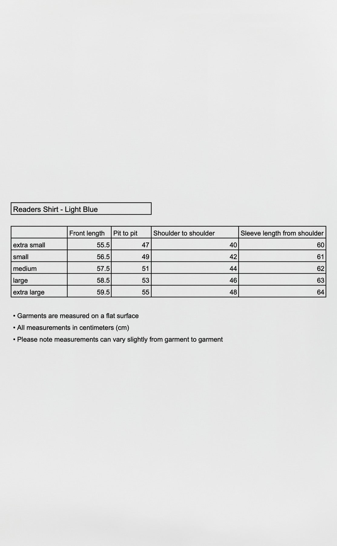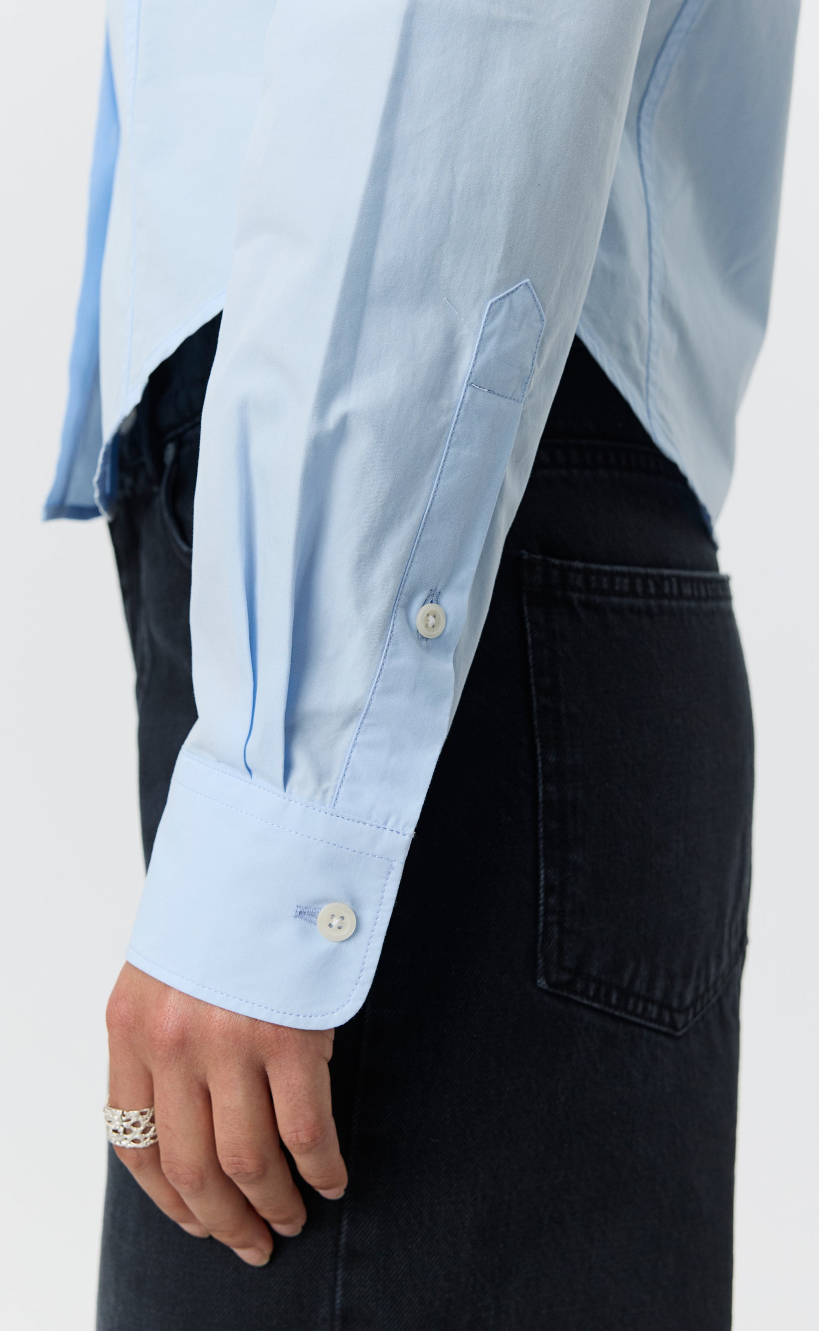 The Readers Shirt has a slim cropped fit with a curved hem. Featuring a button placket, spread collar, back yoke and contour panels at front and back. Cut from a garment washed, crisp organic cotton poplin in a soft blue.