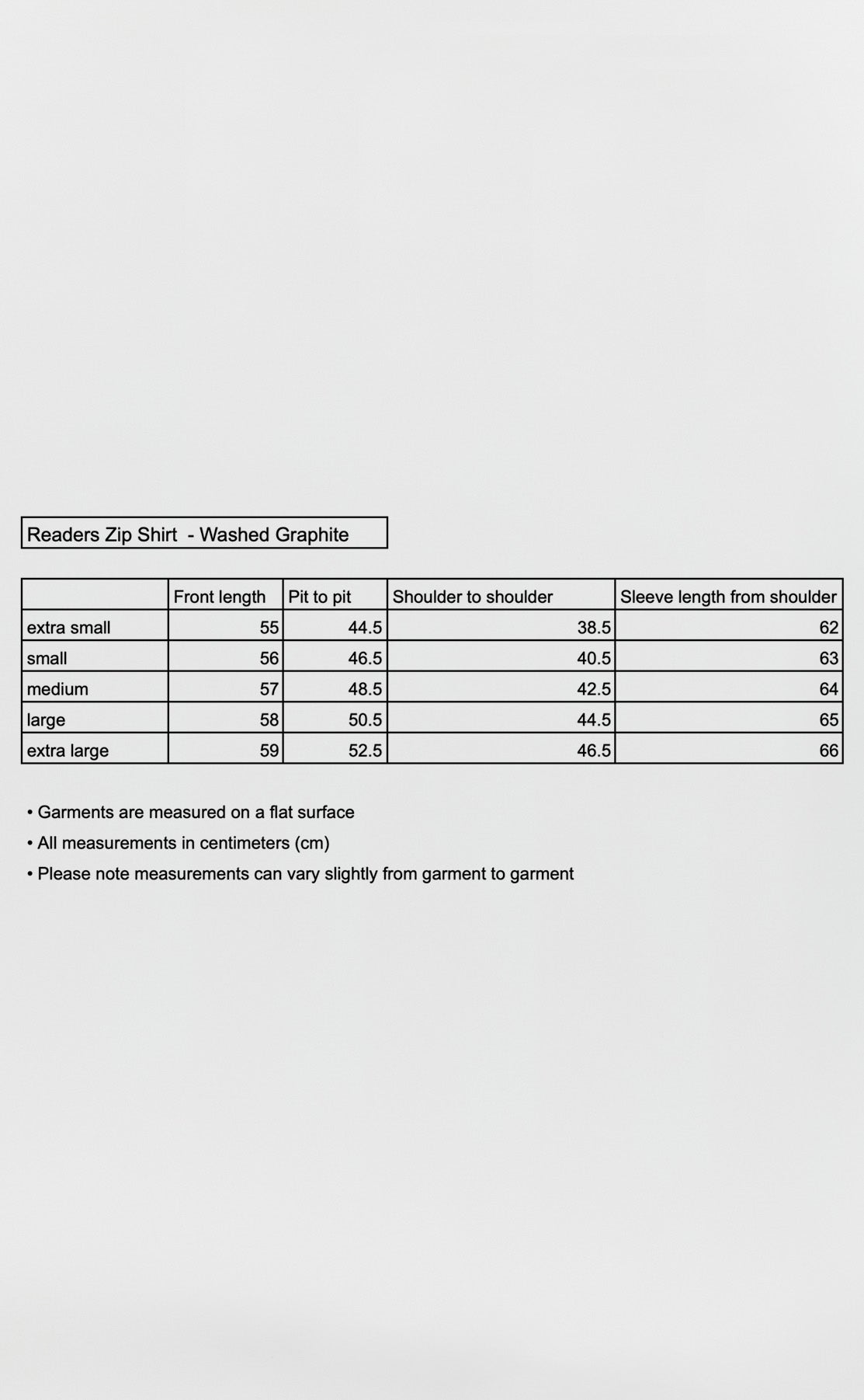 The Readers Shirt has a slim cropped fit with a curved hem. Featuring two-way zip placket, spread collar, back yoke and contour panels at front and back. Cut from a garment washed organic cotton in faded grey.