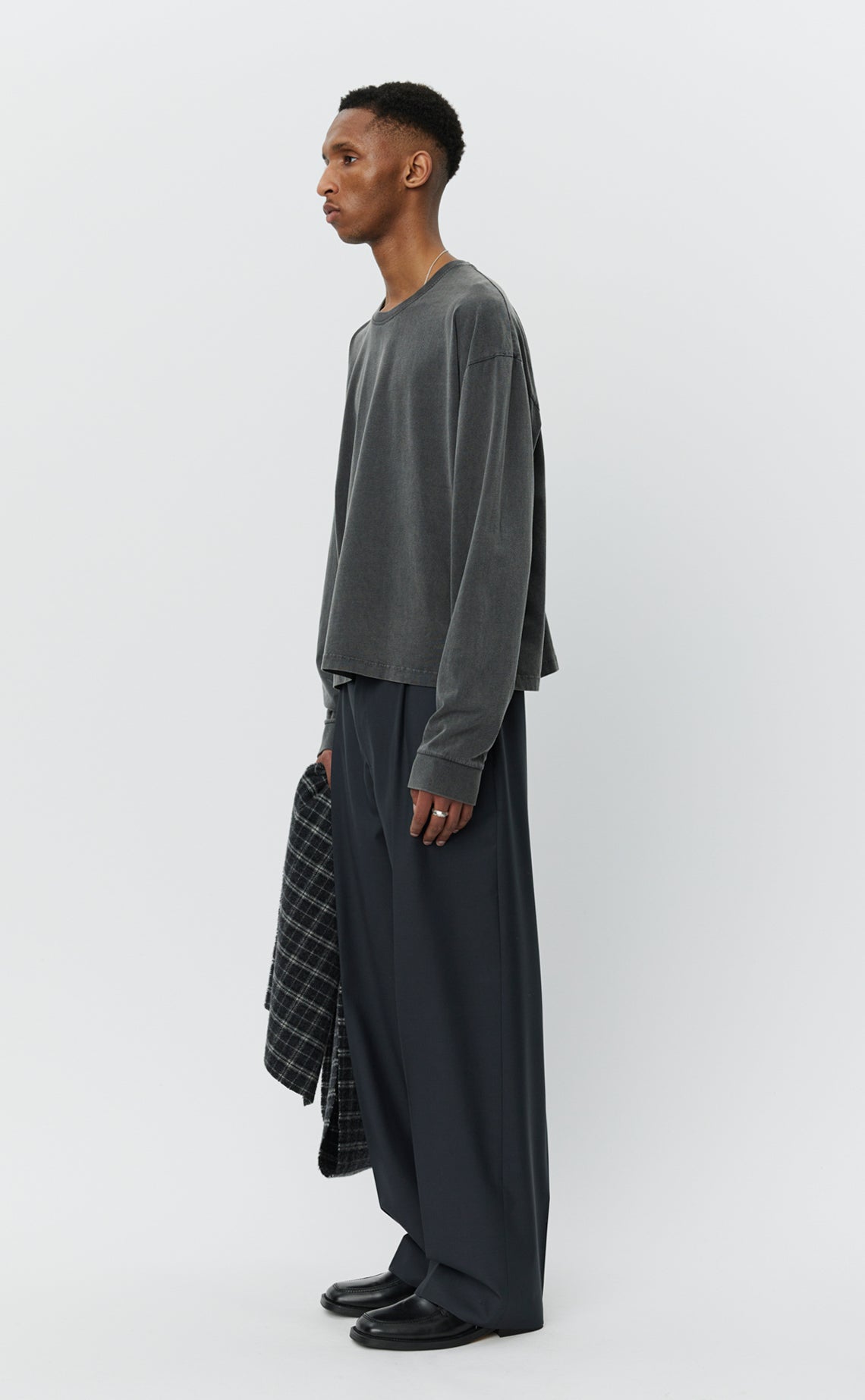 The Relaxed LS Tee has an oversized fit with drop shoulders. Featuring reversed flatlock seams and cuffed sleeves. Cut from a garment dyed organic cotton jersey with a brushed surface in dark grey.
