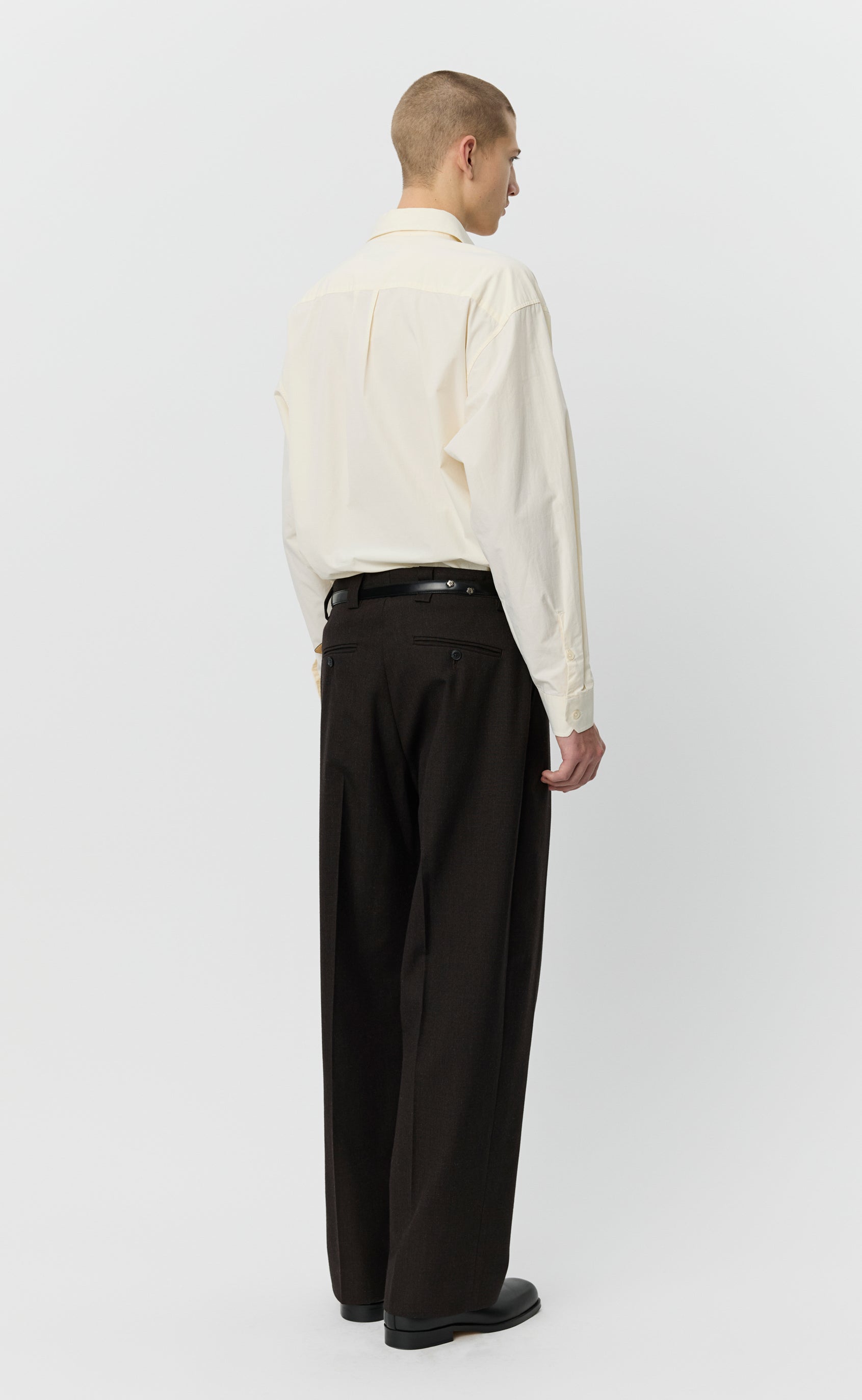 The Service Trousers have a wide straight fit with single pleats and a mid-rise. Featuring side pockets, rear welt pockets, button fastening, hook-and-eye closure and YKK zip fly. Cut from a dense Italian wool twill with a subtle two-tone weave in dark brown. Made in limited quantities from deadstock fabric, available exclusively on mfpen.com and in the Copenhagen mfpen Store.