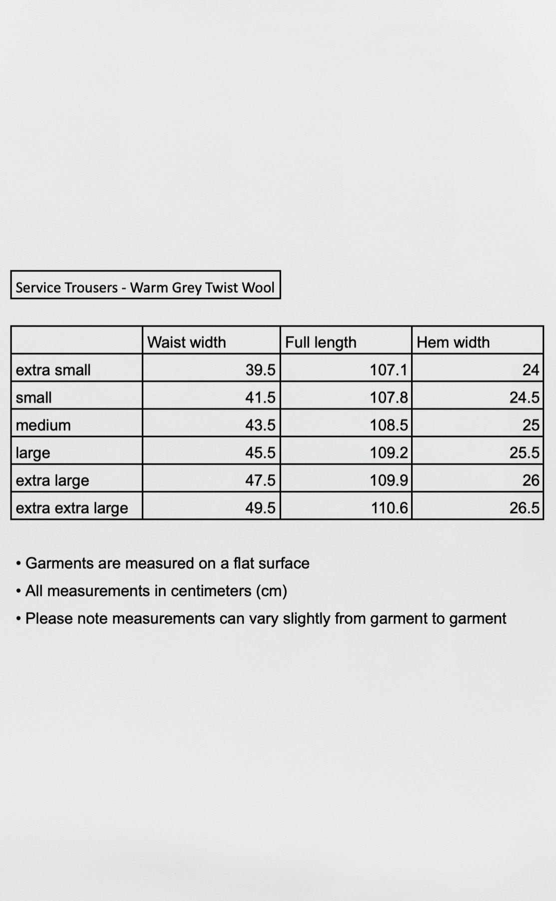 The Service Trousers has a wide straight fit with single pleats and a mid-rise. Made with side pockets, rear welt pockets, button fastening, hook-and-eye closure and YKK zip fly. Cut from a smooth Italian deadstock wool twist with black and grey folded yarns.